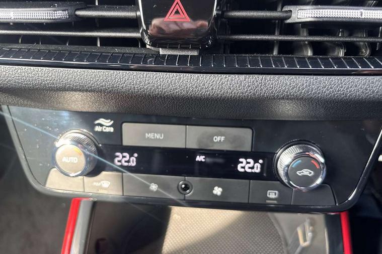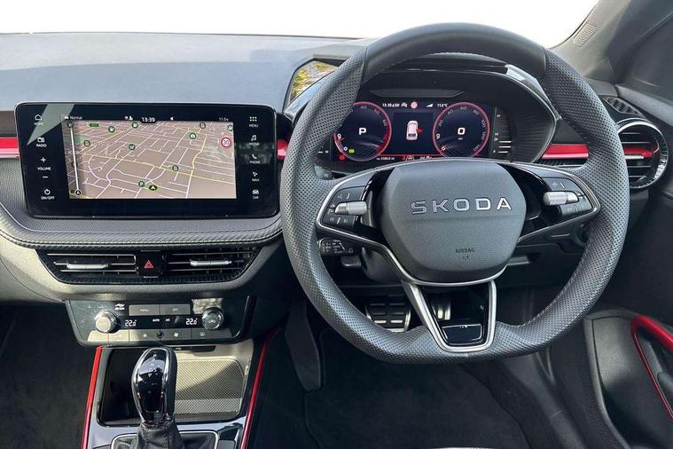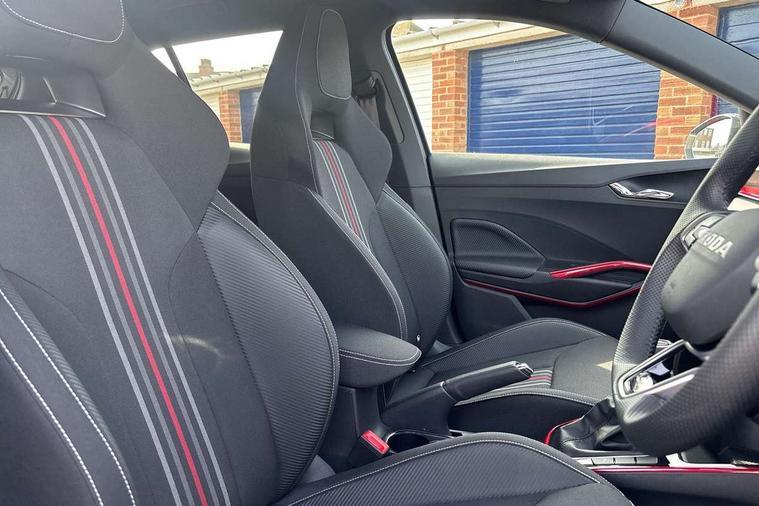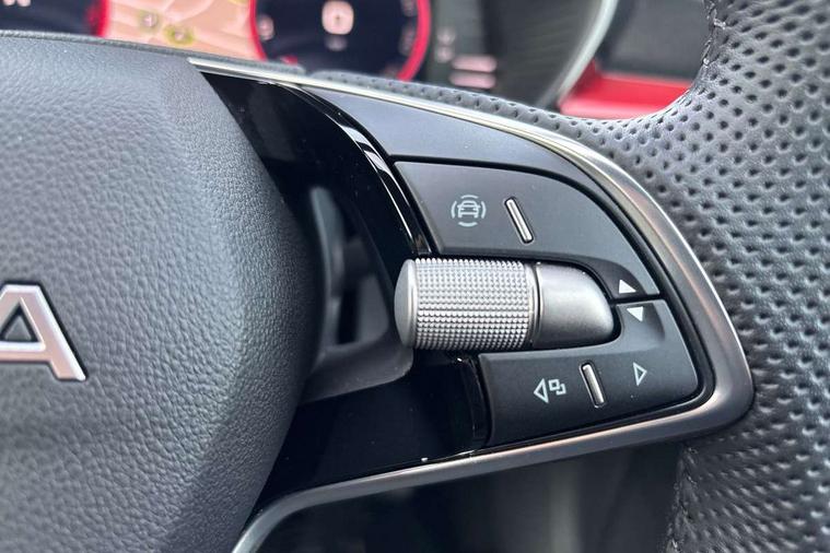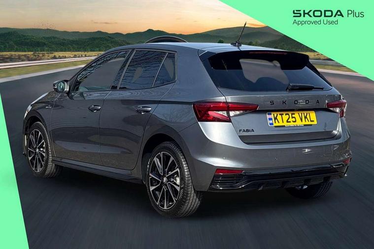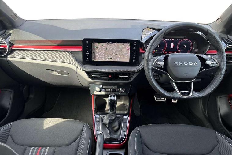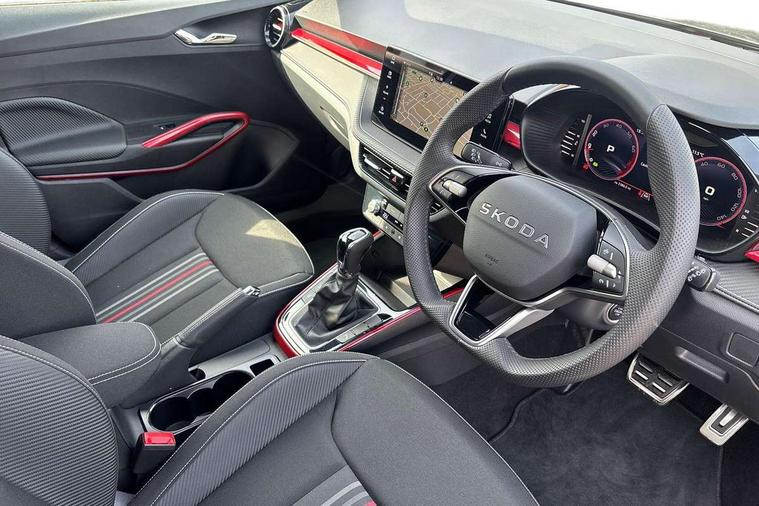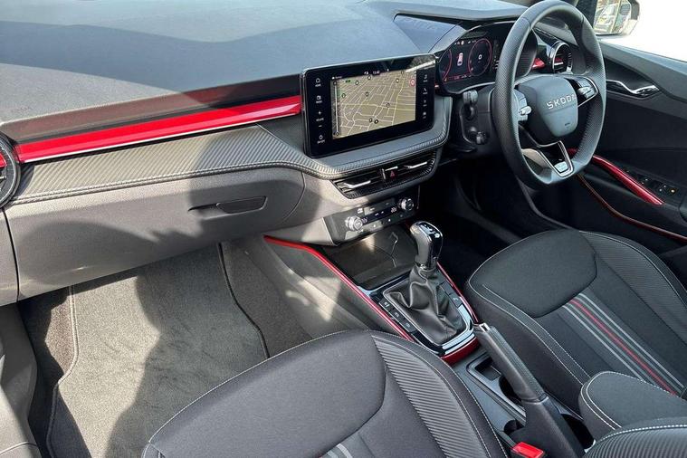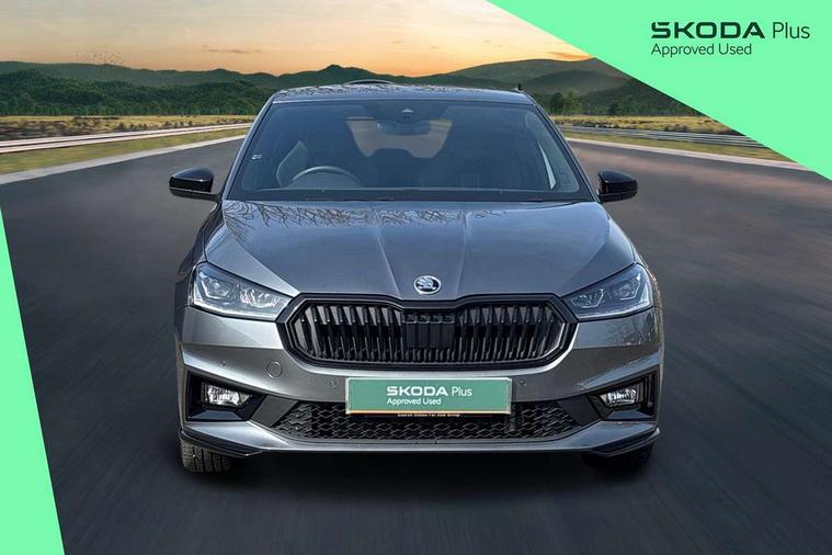 Advanced driver attention and drowsiness monitor, Bluetooth connection, Driver alert system, Electromechanical power steering, Exterior temperature gauge, Service interval indicator, Traffic sign recognition, Virtual cockpit with 10.25" colour display, Wireless SmartLink for Apple CarPlay and Android Auto, 6 Speakers (4 in front and 2 in rear), 9.2" colour display skoda navigation system with voice control and web radio, Auxiliary socket for external MP3 player, DAB digital radio reception, Auto dimming rear view mirror, Black radiator grille, Body coloured bumpers, Door mirror integrated indicators, Dynamic headlight range control, Front and rear electric windows, Front window wiper intermittent control, Ice scraper in fuel cap, LED 3rd brake light, LED daytime running lights with coming and leaving home feature, LED rear lights, Monte Carlo badging, Privacy glass, Rear LED fog light, Rear side wing doors, Rear window wiper with washing nozzles, Roof mounted spoiler, SKODA tailgate lettering in black, Sports bumpers, Unique dark chrome design logo on alloy wheels, 2 LED reading lights in front and rear, 3 rear headrests, Aluminium pedals, Backrest split and folding, Black headlining, Central console with fixed cup holder and storage box, Chrome handbrake release button, Door sills with fabia badging, Dual zone air conditioning with climatronic electronic control, Fabric/artificial leather upholstery, Front centre armrest, Front sports seats, Gearshift knob/handle in leather, Hand brake lever handle in leather, Height adjustable front headrests, Height adjustable front seats, Height adjustable steering wheel, ISOFIX and TopTether anchorage points to the outer rear seats, ISOFIX and TopTether on the front passenger seat, Luggage compartment lighting, Manually adjustable lumbar support in front seats, Metallic painted red central console cover, Metallic red interior door handles, Pollen filter, Rear seat bench unsplit, Single front passenger seat, Skoda lettering on steering wheel, Sun visors with mirror and airbag label on passenger side, Textile floor mats, Ticket holder, Umbrella in drivers door, Ambient lighting pack - Fabia Hatchback, Convenience pack - Fabia, Light and view pack plus - Fabia, 3-point height adjustable front seats belts with pretensioner and force limiter, Automatic warning lights in case of crash, Driver and passengers airbag with switch off function, e-Call+, ESC including ABS, MSR, ASR, EDS, HBA and XDS, Front and rear seat belt warning, FRONT ASSIST (AEB City and AEB Inter Urban), Front side airbags, Head airbags, Hill hold control, One tone horn, Pedestrian protection, Three rear 3-points safety seat belts with pretensioner and force limiter including stop function for outer rear seat belts, Tyre pressure monitoring system, Anti-theft alarm system including immobiliser, interior monitoring, backup horn, and towing protection, Central locking with radio remote control, interior controls, SAFE function and 2 foldable keys, Carbon effect door and side trim panels, Carbon effect lower decorative trim with white stitching, Monte carlo air vents, Red metallic upper decorative trim, Anti-theft wheel bolts protection, Super-low rolling resistance tyres,
