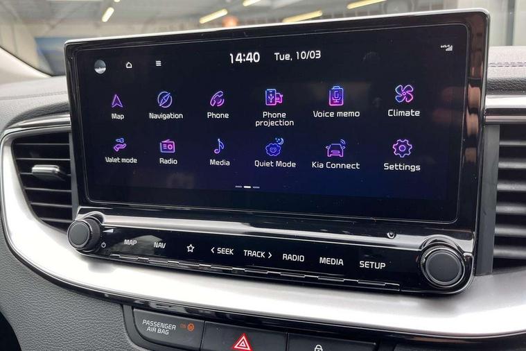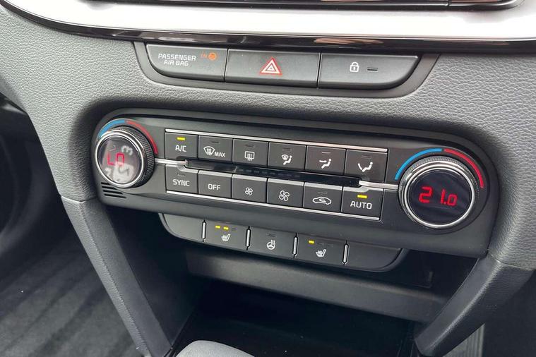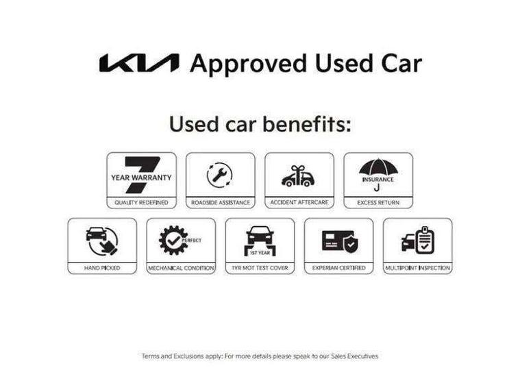 10.25" touchscreen satellite navigation, 4.2" supervision colour cluster display, Apple car play/Android Auto with voice control, Bluetooth with Voice Recognition & Music Streaming, Drive mode select (Normal and Sport), Driver attention warning + (DAW) with leading vehicle departure warning, Emergency call service, Emergency stop signalling system, Forward Collision-Avoidance Assist (FCA) - City/Pedestrian/Cyclist, Kia connect UVO, Lane Following Assist (LFA), Lane keep assist, Manual speed limit assist, Motor driven power steering, Rear parking sensor, Reversing camera system with dynamic guidelines (Integrated into centre fascia screen), Smart cruise control with stop/go functionality, Trip computer, Intelligent Stop and Go, 6 speaker audio system, DAB Radio with MP3, Illuminated USB ports, Steering wheel mounted controls, USB Fast Charger in Front Centre Console, USB type A port, All-round Electric Windows with Front Auto Up & Down Function, Auto dimming rear view mirror, Automatic defog system, Automatic headlights control, Body colour bumpers, Body colour door mirrors, Body colour exterior door handles, Body colour rear roof spoiler, Chrome window surround, Electric adjustable/heated/folding door mirrors with LED Indicators, Heated rear window with timer, High beam assist, High gloss black and white chrome coated radiator grille, LED daytime running lights, LED front fog lights, LED Headlights, LED High-mounted Brake Light, LED rear combination lights, Privacy glass (rear side windows and tailgate), Rain sensing front wipers, Rear side wing doors, Rear wash/wipe, Roof rails, Tinted glass, Wide view drivers door mirror, Windscreen Washer Level Warning, 1 x Front 12V socket, 12V power socket in luggage compartment, 3 seat bench in 2nd row, 3 x passenger assist grips, 60/40 split folding rear seat, All-round height adjustable headrests, Centre console storage box/armrest, Cloth upholstery with faux leather bolsters, Cupholders in centre console, Cupholders in rear armrest, Dash illumination dimmer switch, Door courtesy lamps, Driver & Front Passenger Sunvisors with Vanity Mirror Illumination & Ticket Holder, Driver + front passenger electric lumbar support, Driver's seat height adjuster, Dual Height Luggage Area Floor, Dual zone automatic air conditioning, Faux leather door centre trim, Front and rear door storage, Front cabin map light with sunglasses case, Front Passenger Seat Height Adjuster, Front seat back pockets, Heated front seats, Heated steering wheel, Interior door lock/unlock function, ISOFIX Child seat top tethers and anchor fixings, Leather handbrake, Leather trimmed steering wheel, Luggage area light, Luggage area parcel shelf, Luggage hooks, Rear centre armrest, Rear coat hooks, Single front passenger seat, Tilt/telescopic adjustable steering wheel, All round 3-point seatbelts, Anti-lock braking system (ABS), Brake assist system, Dual front side airbags, Dual horn, EBD - Electronic brakeforce distribution, Electronic parking brake, Electronic stability control (ESC) and vehicle stability management (VSM), Front passenger airbag cut-off switch, Height adjustable front seatbelts, Hill start assist control (HAC), Impact sensing auto door unlocking, Rear door child safety locks, Seatbelt reminder warning, Twin curtain airbags, Twin front airbags, Tyre pressure monitoring system, Alarm system, Engine Immobiliser & Deadlocks, Engine Start/Stop Button with Smart Entry System, Locking wheel nuts, Speed sensitive auto door locking, Satin Chrome Fascia Trim, 17" Alloy wheels, Tyre mobility kit,