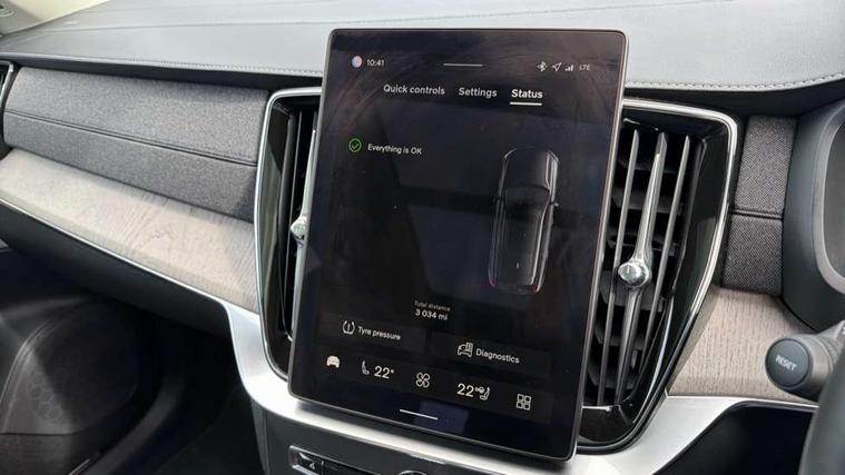 11.2" centre console touch screen, 12.3" Progressive Driver Display, 360 degree surround view parking camera with side proximity sensors, Adjustable steering wheel force, Apple carplay (wired), Bluetooth handsfree system, Driver alert control with lane keeping aid, Driver assistance (pilot assist and adaptive cruise control), Driver awareness - Blind spot information system with steer assist, cross traffic alert with autobrake and rear collision warning and mitigation, Emergency call service, Front and rear park assist, Google Automotive Services - Navigation with Voice recoginition and google assistant, Handsfree power tailgate opening and closing, Intelligent speed assistance, Oncoming Lane Mitigation, PAS, Power operated tailgate, Service interval indicator, Speed sensitive steering, Trip computer, Volvo on call, Wireless/Inductive Mobile Phone Charging, 8 speed automatic transmission with start/stop + manual change functions, Active four C chassis - four corner adaptive dampers with electronic air suspension, DAB Radio (Digital Audio Broadcasting), Premium Sound by Bowers and Wilkins, dirac live, dolby pro logic II surround sound, 18 speakers/1400W output and fresh air subwoofer, Steering wheel remote infotainment controls, Adaptive brake lights with high level LED brake lights, Auto dimming interior + exterior mirrors, Auto folding and heated power door mirrors, Automatic headlight levelling system, Automatic matrix LED headlights with Adaptive shadow technology and Active high beam, incorporating Day running lights, Body colour bumpers, Dark tinted windows - rear side windows and rear screen, Front and rear power windows, Headlight cleaning system, High gloss black door mirrors and window surround, High gloss black front and rear bumper deco, High gloss black front grille and deco, Home safe and approach lighting, Integrated roof rails in high gloss black, Laminated side and rear windows, Power glass tilt and slide panoramic sunroof with sun curtain, Puddle lights, Rain sensor with automatic windscreen wiper activation, Rear side wing doors, Rear wash/wipe with intermittent wipe setting, Roof antenna, Roof spoiler, Visible VIN plate, 12V socket in luggage compartment, 2nd Row centre armrest with and cupholders, 3 Spoke tailored sport steering wheel with chrome trim, 4 zone electronic climate control with Clean zone air quality system + pollen filter, A-pillar parking ticket holder, Air conditioning for 3rd row of seats, Air purifier PM2.5, Ambient door and instrument panel lighting, B Pillar ventilation, Bright metal luggage scuff plate, Centre console cupholders and storage, Floor mats, Front and rear courtesy lights, Front and rear door pocket illumination, Front footwell and side step illumination, Front headrests, Front reading lights, Front seat cushion extensions, Front tunnel storage illumination, Glovebox compartment light, Heated front seats, Heated rear seats, Heated steering wheel, Height/reach adjustable steering column, Illuminated front and rear aluminium tread plates, Illuminated luggage compartment, Illuminated tailgate, Illuminated vanity mirrors + ticket holder, Inner door release handle illumination, Integrated sun curtains in rear doors, Isofix outer rear child seat preparation in 2nd row, Load cover, Load protection net, Lockable glovebox compartment, Luggage compartment divider with grocery bag holder, Outboard armrest with cupholder and storage for third row passengers, Power driver seat with multi directional lumbar support and memory for seat and exterior mirrors, Power folding 2nd row headrests, Power passenger seat with multi directional lumbar support and memory, Rear footwell and side step illumination, Rear headrests, Rear reading lights, Second row integrated child seat for centre seat, Single front passenger seat, Three 2nd row individual folding passenger seats with fore/aft adjustment, Two 3rd row individual folding passenger seats, Underfloor luggage compartment storage, 7 three point seatbelts, City safety with steering support includes pedestrian, cyclist detection, front collision warning with full auto brake and rear auto brake, Driver and passenger airbags, Drivers knee airbag, First aid kit, Front seats SIPS airbags, Hill descent control - off drive mode, Hill start assist, IC (Inflatable Curtains) - Full Length, Passenger airbag cut-off switch, Power child locks on rear doors, Power parking brake with auto hold function, Road sign information display, Run off Road Protection, Seatbelt reminder and pretensioners for all seats, SIPS (Side Impact Protection System), Slippery road and hazard light alert, Stability and Traction Control with Spin control, Engine Drag Control and Corner Traction Control, Tyre pressure monitoring system, Vehicle deceleration control with Anti-lock Brake System, Electronic Brake Distribution and Emergency Brake Assist, Warning triangle, WHIPS whiplash protection system - front, 2x Key integrated remote control central locking + deadlocking system and auto open/close windows, Anti-theft alarm including immobiliser/volume sensor + level sensor, Keyless drive includes keyless entry and keyless start, Locking wheel nuts, Tailored instrument panel and door tops, Tempa spare wheel and jack,