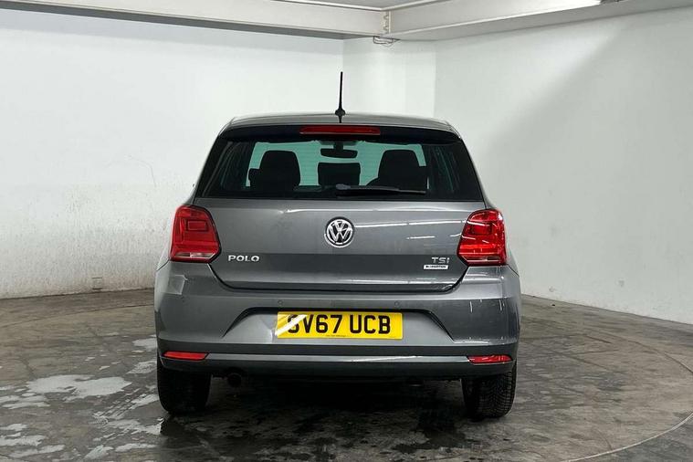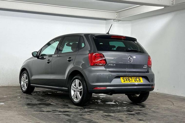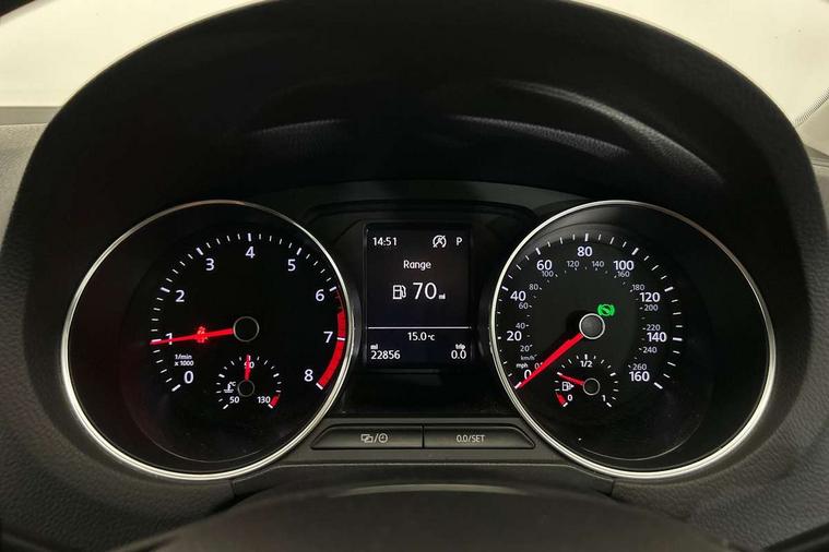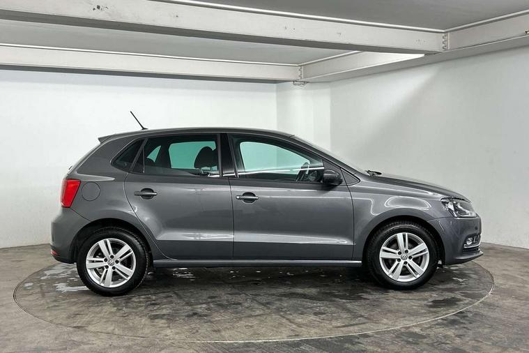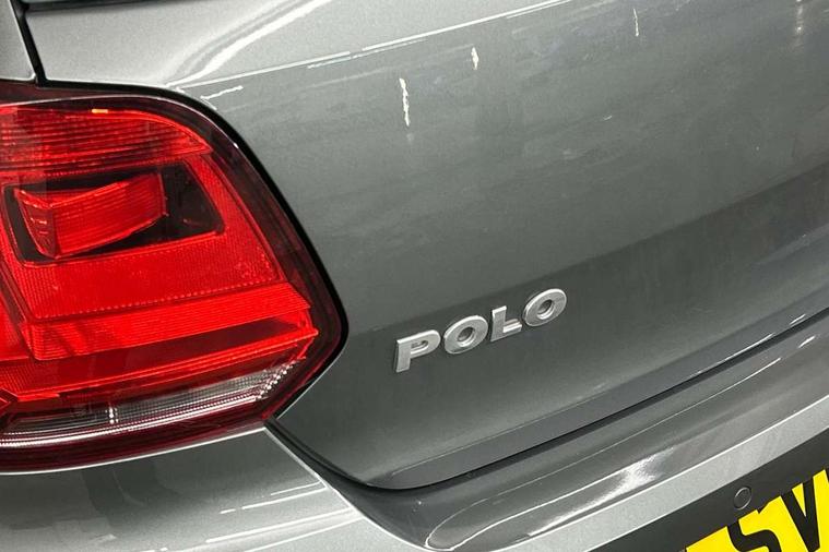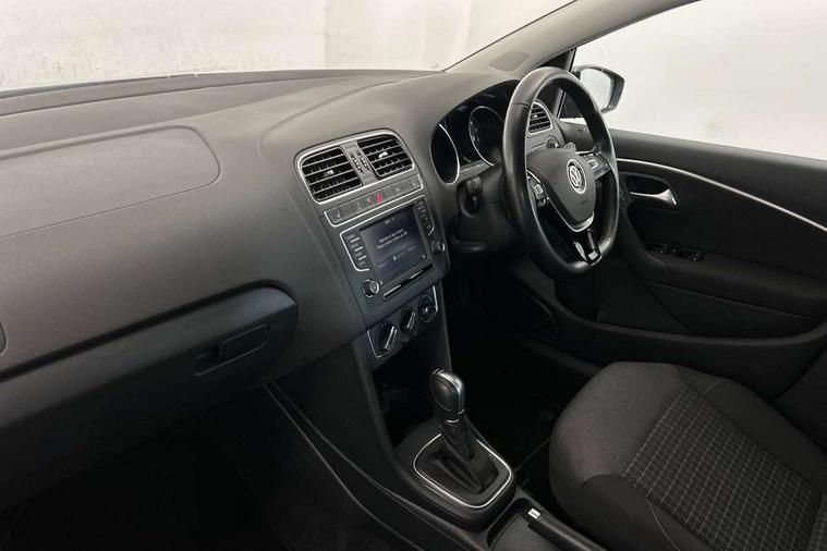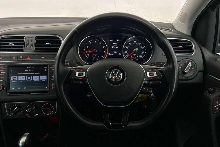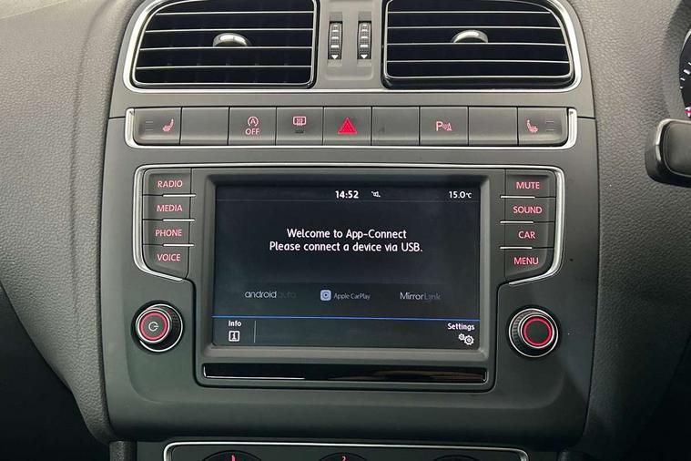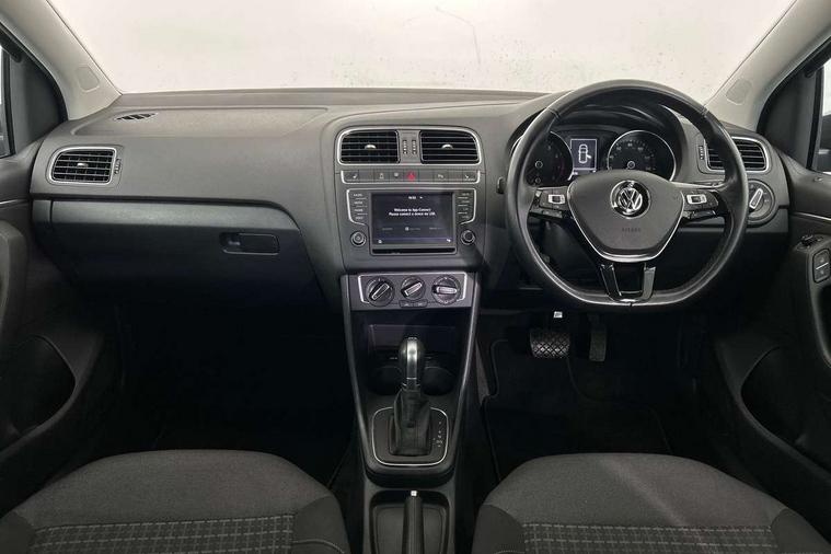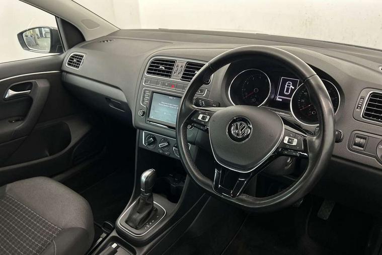 App-Connect, Bluetooth Telephone preparation, Driver alert system, Multi function display, Multifunction computer, PAS - speed related, Service interval indicator, Ultrasonic front and rear optical and audible parking sensors, Warning buzzer and light for front seatbelts unfastened, 6 speakers, Composition media system with radio, glovebox mounted CD, colour touch screen, SD card, aux-in, USB, multimedia interface, DAB Digital radio, Black grille with chrome surround, Body colour bumpers, Body colour door handles, Body colour door mirrors, Body coloured side sills, Chrome trimmed front air intake surrounds, Electric folding door mirrors, Electric front windows, Electric operated/heated door mirrors, Front fog lights with static cornering function, Front wash/wipe with interval delay, Heat insulated tinted glass 65% light absorbing from B pillar back, Heated rear window with auto timer, Rear electric windows, Rear windscreen washer and wiper with interval delay, 12V power socket in centre console, 2 bag hooks in luggage compartment, 2 cupholders, 3 rear head restraints, 3 spoke steering wheel, 4 grab handles, 60/40 split folding rear seat, Centre console storage, Chrome interior door handles, Driver and passenger sunvisors, Driver seat height adjust, Dust/pollen filter, Front door pockets, Front passenger seat height adjust, Front seat backrest storage nets, Front/rear reading lights, Glovebox, Height/reach adjustable steering column, Illuminated vanity mirror, Interior light with delay, Isofix Preparation 2 Rear child seats, Luggage compartment cover, removable, Luggage compartment lighting, Matt chrome gear lever gaiter surround, Multifunction leather steering wheel with leather gear knob/handbrake grip, Storage compartment in front doors, Storage compartment in rear doors, Sunglasses holder, Variable boot floor, Light and sight pack - Polo, 3 point height adj front seatbelts + pretensioners, 3x3 point rear seatbelts, ABS, Automatic post collision braking, Driver/front passenger airbag, Driver/Passenger whiplash optimised head restraints, ESC - Electronic Stability Control + traction control, ESP with EDL + ASR, Hill hold control, Hydraulic Brake Assist (HBA), Tyre pressure monitoring system, Alarm with remote central locking and interior protection, Electronic engine immobiliser, Air vents in Matt chrome, Matt chrome interior trim, 15" steel spare wheel,