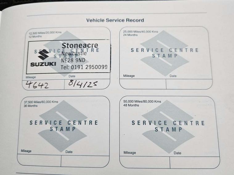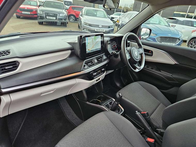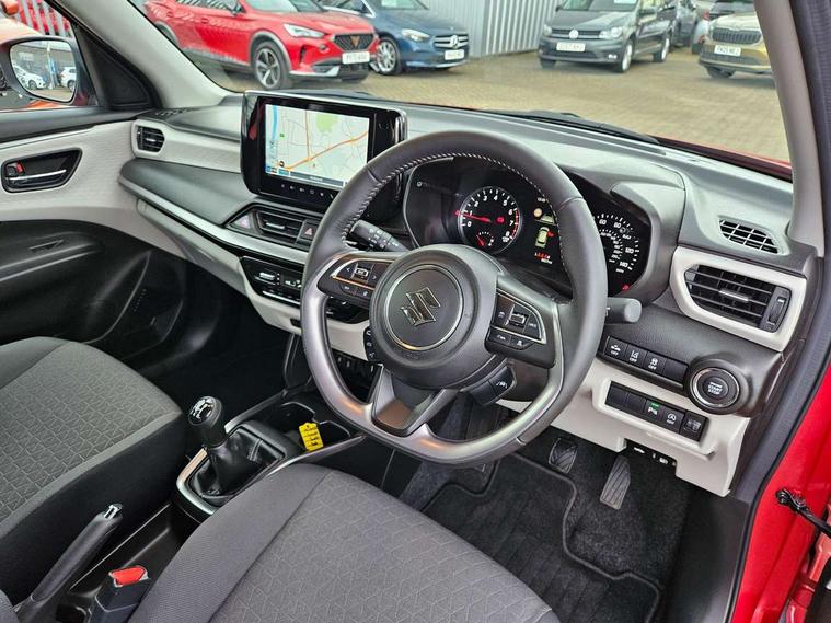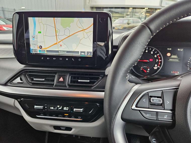 Adaptive cruise control, Automatic start/stop system, Blind spot monitoring, Colour LCD information display, Digital clock, Driver monitoring system, eCall, Fuel consumption display (average/instantaneous) and range display, Intelligent speed control support, Lane departure prevention, Lane departure warning system, Lane keeping assist (LKA), Low fuel level warning light, Navigation system, Outside temperature display, PAS, Rear cross traffic alert, Rear parking camera, Rear parking sensors, Remote fuel cap release, Smartphone integration with Apple CarPlay and Android auto, Suzuki connect, Tailgate, Traffic sign recognition, Weaving alert, 4 speakers + 2 tweeters, 9-inch infotainment display, Auxiliary input socket, Bluetooth audio streaming, DAB Digital radio, Steering wheel audio controls, USB Type A and C, 'Guide me home' headlamps, 1 speed with intermittent rear wiper + washer, 2 speeds front wiper with intermittent + washer, Automatic headlights, Black coloured A & B pillars, Black Upper and lower front grille, Body colour door mirrors and handles, C pillar trim moulding, Door mirrors with built-in turn signal lamp, Electric door mirrors, Electric folding door mirrors, Electric front windows, Electric rear windows, Green tinted glass, Heated door mirrors, High beam assist, LED daytime running lights, LED High mounted stop light, LED number plate light, LED position lamps, LED projector headlamps, LED rear combination lamp, Manual headlamp level control, Rain sensor, Rear fog lights, Rear privacy glass, Rear side wing doors, Rear spoiler, Side spoiler, 1 cup holder in rear, 12V Accessory socket in front console, 2 cup holders in front, 2 Isofix seat anchors, 3 bench rear seats in 2nd row, 3 rear head restraints, 3 spoke leather covered steering wheel, 60/40 split rear seats, Accessory socket, Automatic air conditioning, Centre console storage, Centre lower box, Child seat tether anchorages x 2, Chrome handbrake release button, Chrome interior door handles, Cloth upholstery, Door pockets with bottle holder, Driver/passenger sunvisors with ticket holders + vanity mirrors, Front cabin lights, Front headrests, Front map light, Front passenger side assist grip, Glovebox, Heated front seats, Heater, Height adjustable driver's seat, Luggage area lamp, Painted interior door trim ornament, Parcel shelf, Passenger seat back pocket, Pollen filter, Rear assist grips x2, Rear heater duct, Single front passenger seat, Tilt adjustable steering wheel, Tilt/telescopic adjustable steering wheel, 3 point ELR seatbelts for centre seat, 3 point ELR seatbelts front and rear, ABS+EBD+Brake assist, Curtain airbags, Driver airbag, Dual sensor brake support, ESP + traction control, Front and rear seatbelt reminder, Front passenger airbag, Front passenger airbag deactivation, Front seat seatbelts shoulder height adjuster, Front seatbelt pretensioners with force limiters, Hill hold control, Rear child proof door locks, Rear seatbelts with pre-tensioners and load limiters, Side airbags with incorporated into front seats, Tyre pressure indicator, Deadlocks, Freewheeling key cylinders, Immobiliser, Keyless entry and start, Light - on and Key in reminder, Locking wheel nuts, Remote central locking, Painted instrument panel ornament, 16" Polished alloy wheels, Emergency flat tyre repair kit,