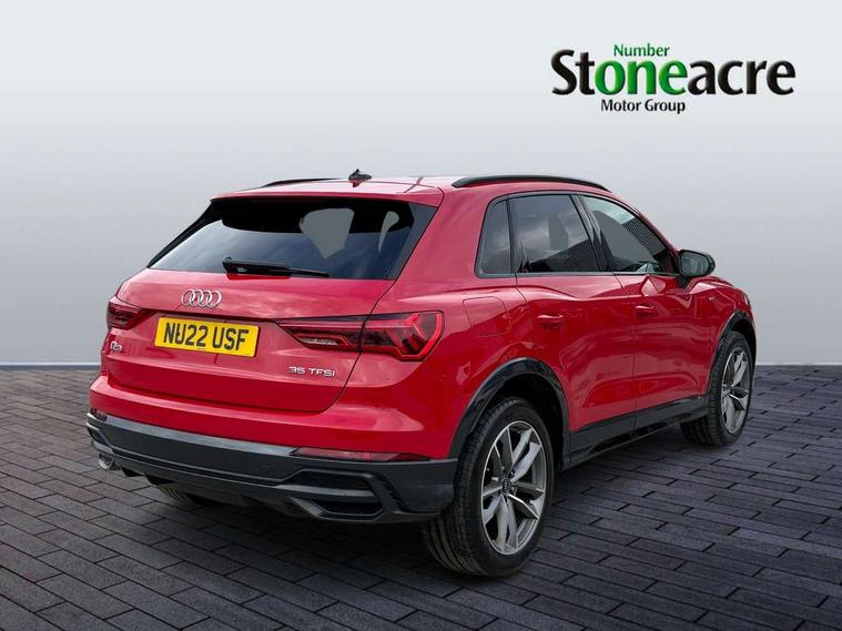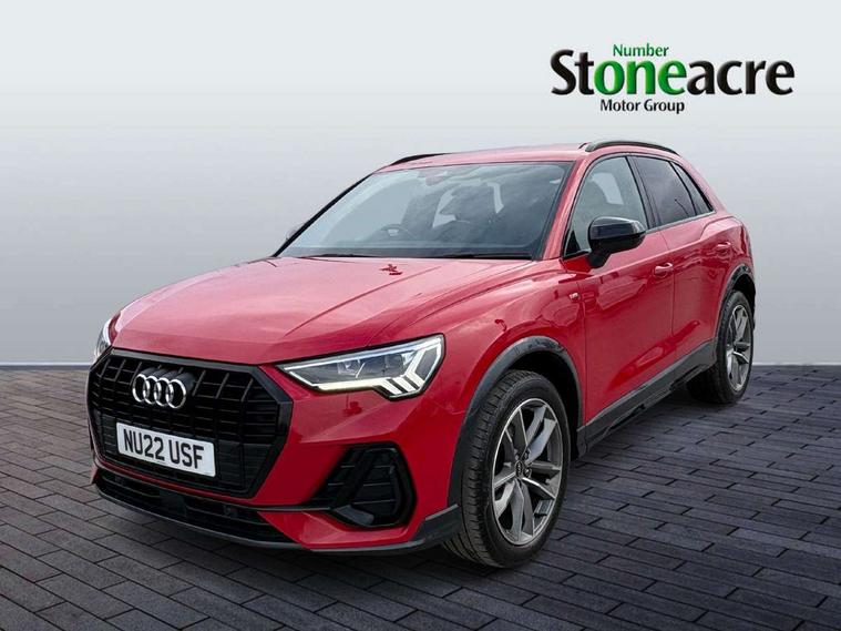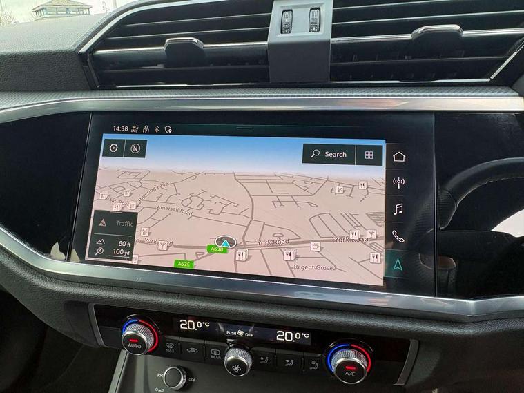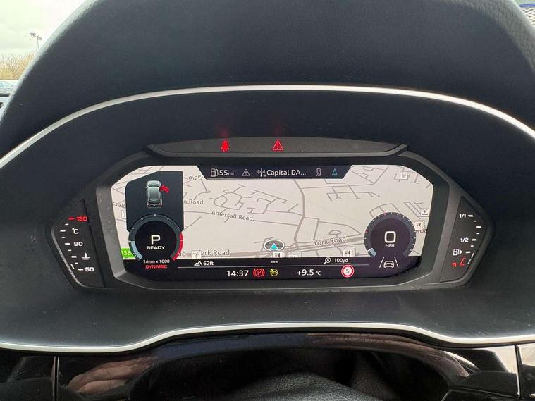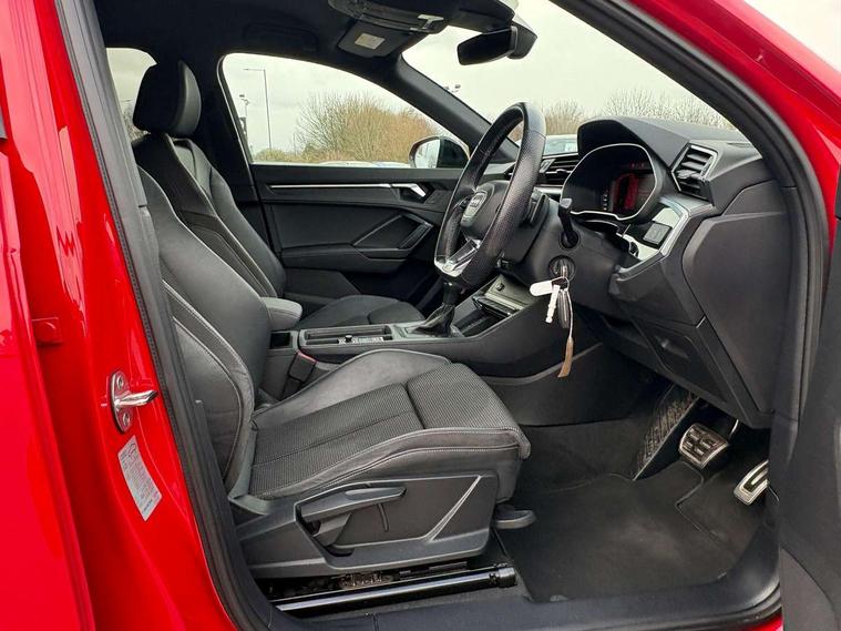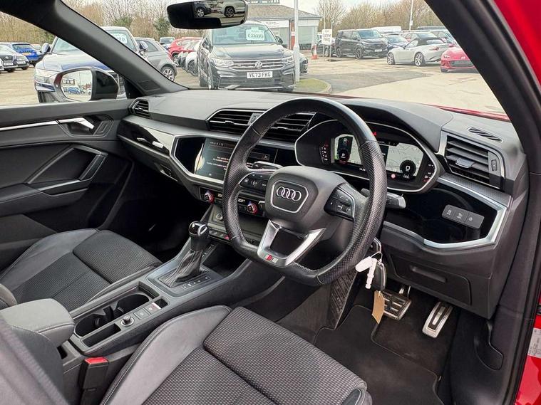 Amazon alexa Integration, Audi connect safety and service (e-call), Audi drive select, Audi lane departure warning, Audi Virtual Cockpit - 10.25" display, Bluetooth interface, Camera based traffic sign recognition, MMI Navigation Plus with high resolution 10.1 inch touchscreen colour display, Power operated tailgate, Progressive steering, Service interval indicator, Smartphone interface includes wireless Apple carplay/Android Auto, Start stop system with recuperation, Voice control system with natural language interaction, 48V Mild hybrid technology, Sports suspension, 2 USB-C ports with charge and data functions, 6 passive loudspeakers, DAB digital radio module, Acoustic windscreen, Auto dimming frameless rear view mirror, Black roof rails, Electrically folding, adjustable and heated door mirrors with integrated LED side indicators and kerb view function for passenger side, Front and rear electric windows, Front fog lights, Grille vertical bars in aluminium silver/Matt, High gloss black finish B and C pillars, LED headlights with LED daytime running lights, LED rear lights, LED third brake light, Privacy glass dark tinted rear and rear-side windows (from B-pillar backwards), Rain and light sensors, Rear diffuser strip in matt titanium black, Rear side wing doors, Rear wiper, S line bumpers in contrasting Manhattan grey, Variable front intermittent wipers, 12V socket in rear centre console, 3 seat bench in 2nd row, 40:20:40 folding with manual adjustment for 60:40 forwards/backwards position and backrest angle, Adjustable rear seat bench/backrest with centre armrest and cupholder, Black cloth headlining, Dual zone electronic climate control, Front and rear black floor mats with contrast stitching in rock grey, Front and rear headrests, Front and rear roof module including reading lights, Front centre armrest, Glove compartment lighting, Height and reach adjustable steering wheel, Illuminated door sill trims with S logo, ISOFIX child seat mounting for front passenger with airbag deactivation and outer rear seat including top tether attachment point for outer rear seats, Luggage compartment light, Manual front seats with height adjustment, Perforated leather gearknob, Single front passenger seat, Stainless steel luggage compartment sill finisher, Stainless steel pedals, Black styling pack - Q3, Non smoking pack - Q3, 3x3 point rear seatbelts, 6 airbags - Driver, front passenger, curtain and side windows, Audi pre-sense front with pedestrain and cyclist recognition, Electromechanical parking brake, Electronic stabilisation control including ABS, ASR and EDL, Front seatbelt reminder, Hill descent control, Hill hold assist, Manual child lock in rear doors, Pre sense basic, Seatbelt monitoring, Tyre pressure warning, Warning triangle and first aid kit, Anti theft alarm, Anti theft wheel bolts, Immobiliser, Remote central locking, Detail dashboard around MMI touch colour display in glass look, black with surround in aluminium look, Leatherette door armrest, Piano black inlay, Tool kit, Tyre repair kit,