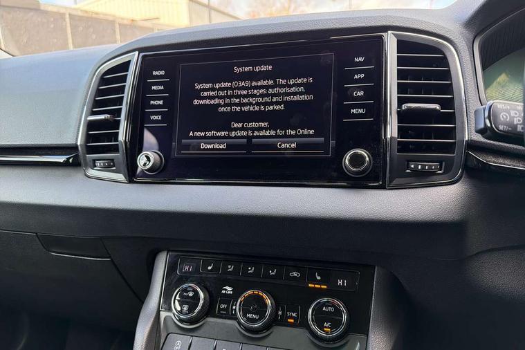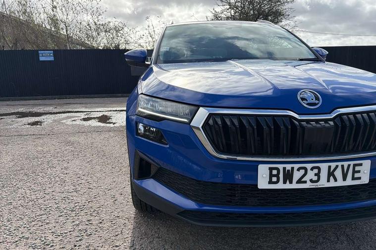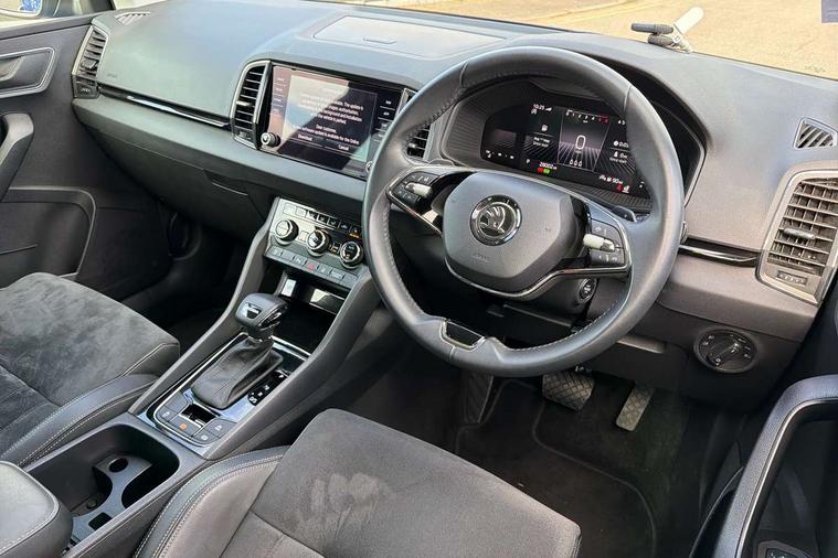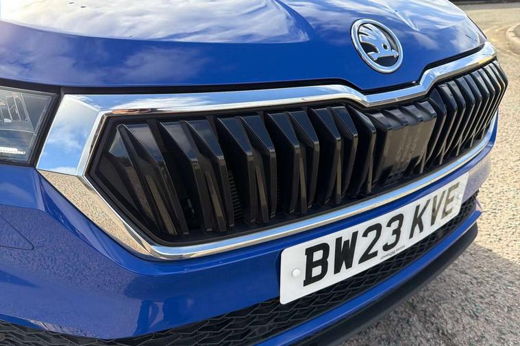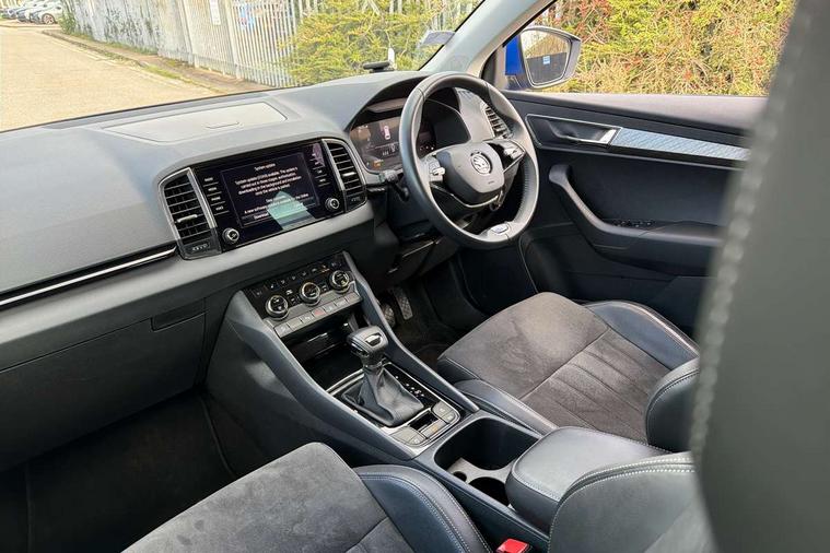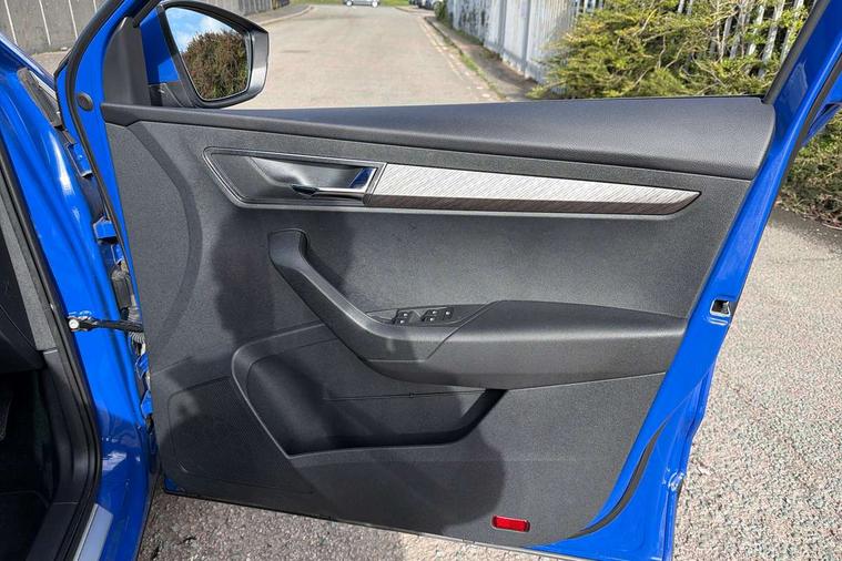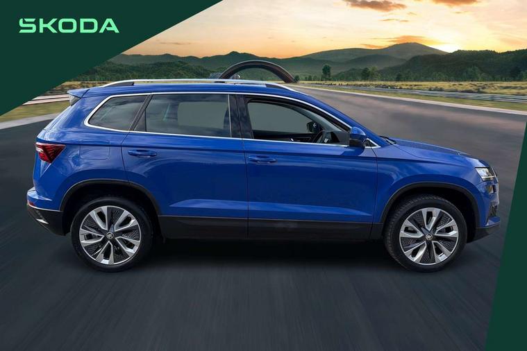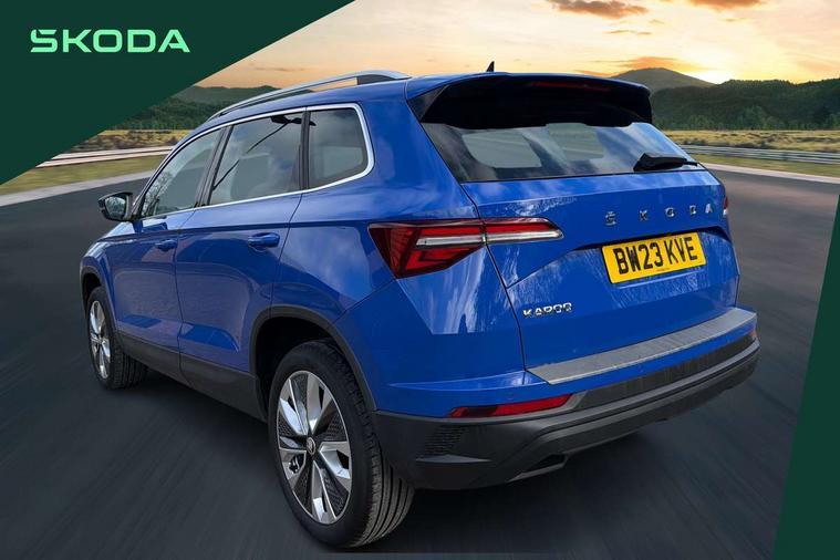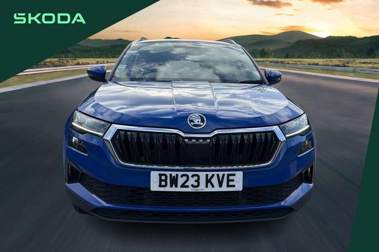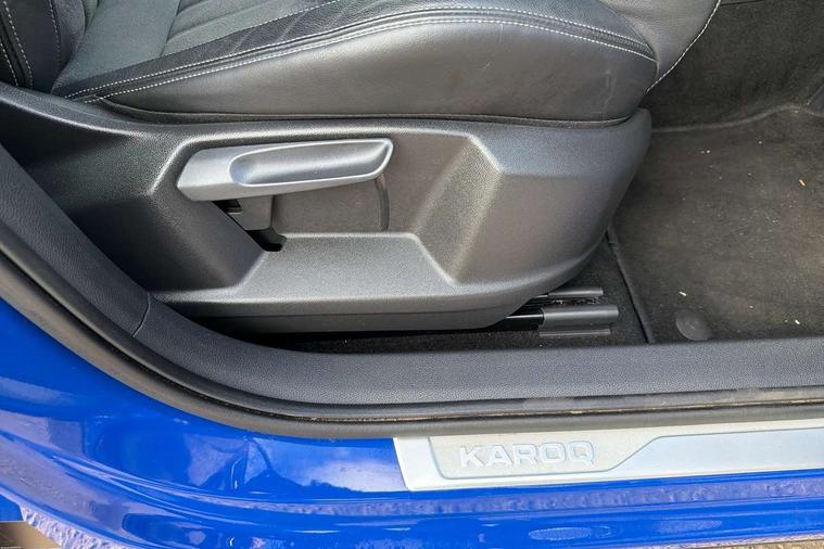 8" Digital display, Care connect, Driver fatigue sensor, Emergency services call system, Outside temperature gauge, Service interval indicator, SmartLink wireless for Apple and wired for Android, Start/stop system with regenerative braking, USB C Port x 2 in front centre console, 8 Speakers, DAB radio with Bluetooth, USB connection, Acoustic glass, Aero front windscreen wipers with intermittent function, Auto dimming rear view mirror with light and rain sensors, Black electric window control buttons, Body colour door mirrors and handles, Dynamic headlight range control with cornering light function, Electric front and rear windows with child proof lock, Heated rear windscreen, LED daytime running lights, LED rear lights with high functionality welcome effect and dynamic indicators, Light assistant (coming/leaving home/tunnel light), Plastic scuff plates, Privacy glass, Rear side wing doors, Rear spoiler, Rear window wiper with washer system and intermittent control, Safety reflectors on front doors, 1.5 litre bottle holders in driver and front passenger door panels, 12V socket in boot, 12v socket in front centre armrest with storage compartment and rear air vents, 2 spoke leather heated multifunction steering wheel with DSG paddles, 2 x Tablet holder, 3 rear height adjustable headrests, 3 seat bench in 2nd row, 4 foldable roof handles with rear coat hooks, Black floor carpet, Chrome inner door handles, Decorative door sills with KAROQ badging, Double sided boot floor, Foldable hooks in the boot, Front head restraints, Height adjustable front three point seats belts with tensioners, Height/reach adjust steering wheel, Ice scraper, Illuminated glovebox, Illuminated luggage compartment, Isofix child seat preparation for front passenger seat, Isofix child seat preparation outer rear, Manual lumbar support for front seats, Pen holder, Pollen filter, Rear boot cover, Rear reading lights, Rubbish bin door, Safety vest holder, Single front passenger seat, Storage box in upper central dashboard closed, Sunvisors with illuminated vanity mirrors, Textile floor mats, Ticket holder, VarioFlex seats with standard rear seat release, Boot pack - Karoq, Chrome roof rails + chrome pack - Karoq, Parking pack - Karoq, Automatic door unlocking in case of crash, Automatic fuel cut off in case of crash, Child locks on rear doors, Driver airbag, Electronic parking brake with auto hold function, Emergency rear braking signal, ESC including ABS, MSR, ASR, EDS, HBA, DSR, RBS, MKB and traction control, Front side airbags, Hill hold control, Knee airbags, Passenger airbag with switch-off function, Pedestrian monitor, Seatbelt reminder signalisation and pretensioner for all seats, Three point seatbelts rear, Two tone horn, Tyre pressure display, Tyre pressure monitor, Alarm with interior monitoring, back up horn and tilt sensor with safe function, Electronic engine immobiliser, Keyless entry and start/stop, Remote central locking with 2 remote folding keys, Chrome framed air vents, 18" Procyon silver alloy wheels with anthracite aero inserts, Anti-theft wheel bolts protection, Storage on wheel cover, Tool kit,
