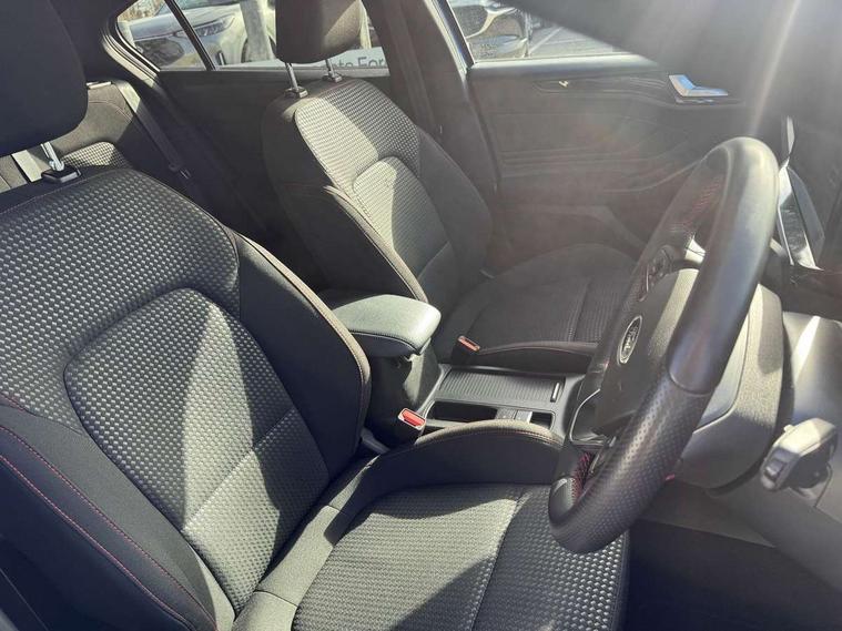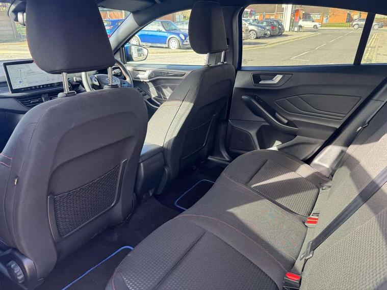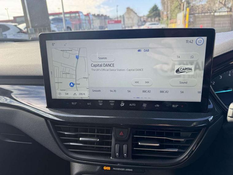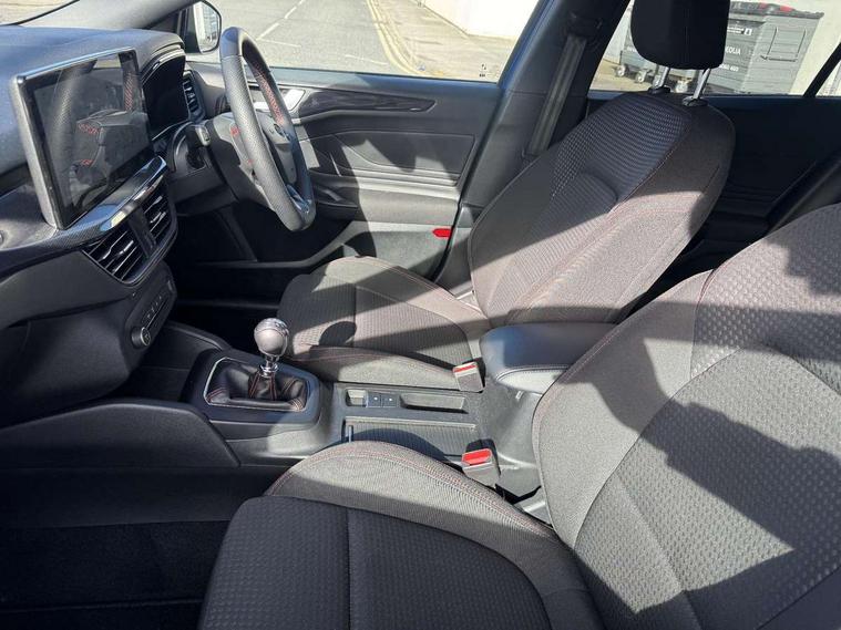 4.2" Colour TFT Ice blue illumination analogue cluster with trip computer, Bluetooth system, Digital clock, Easy fuel capless refuelling system, Eco mode, Ford SYNC 4 Navigation with 13.2'' touchscreen, DAB radio, Emergency Assistance, Apple Carplay & Android Auto, 6 speakers & FordPass Connect, Lane keeping system - lane keeping alert and lane keeping aid, PAS, Rev counter, Selectable drive mode, Service interval indicator, Sports tuned suspension, 2 USB ports, Auto headlamps (on/off), Body coloured door handles, Electrically operated front and rear windows with one touch opening and closing, Electrically operated heated power fold door mirrors with puddle lamp with side indicators, Front variable intermittent wipers with electric wash, Full fixed LED headlamps, Heated rear window, LED daytime running lamp, LED rear lamps, LED third brake light, Polished twin tailpipe, Privacy glass, Quickclear heated windscreen, Rain sensor, Rear side wing doors, Tailgate wash/wipe, Unique ST-Line grille, full bodystyling kit, and large body coloured rear spoiler, 3 rear headrests, 3 seat bench in 2nd row, Cloth upholstery, Dual zone electronic air temperature control, Height adjustable front headrests, Isofix child seat preparation, Reach + rake adjustable steering column, Single front passenger seat, 3x3 point rear seatbelts, ABS+Electronic Brake force Distribution, Auto hold function, Driver airbag, EDL traction control, Electronic parking brake, Electronic stability control, Front and rear seatbelt reminder, Front inertia reel height adjustable seatbelts with pre-tensioners, Front passenger airbag, Front side airbags, Passenger airbag deactivate switch, Post collision braking, Pre collision assist with autonomous emergency braking and pedestrian/cyclist detection, Remote/power child rear door locks, Side curtain airbags, Three rear inertia reel lap/diagonal seatbelts, Tyre pressure monitoring system, Keyless entry and keyless start, MyKey system, Remote central locking & engine immobiliser, Thatcham alarm with power door dead locks, 17" 5 spoke Rock mettalic finish alloy wheels with mini spare wheel,