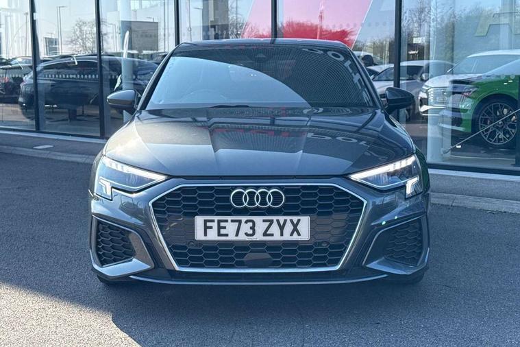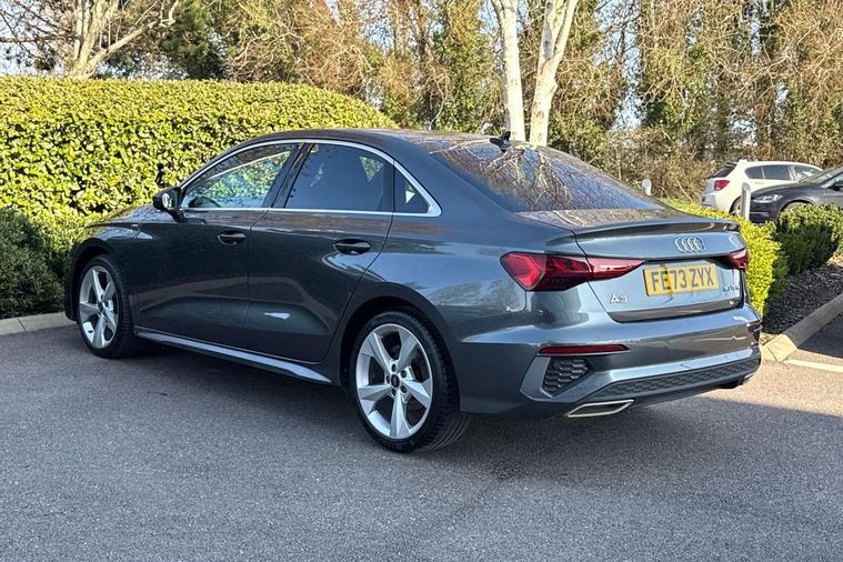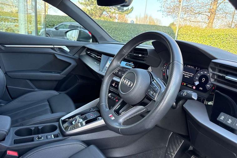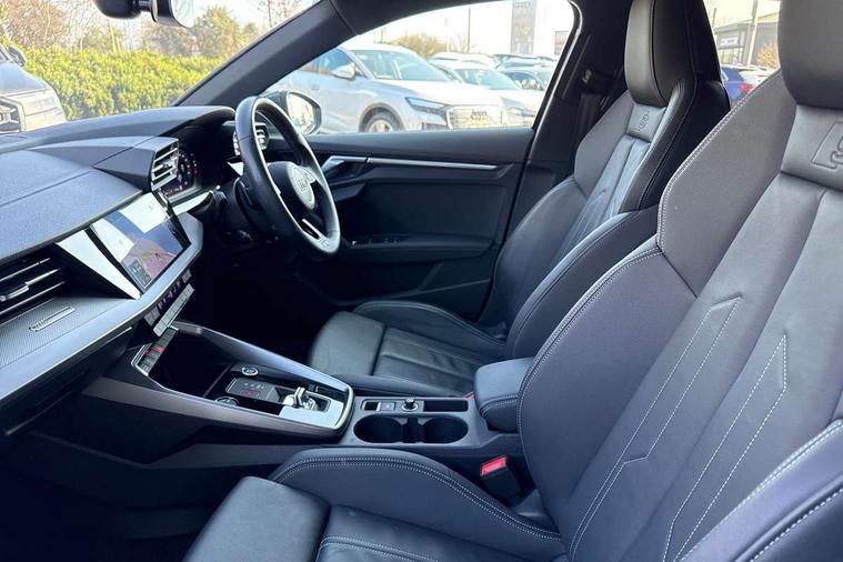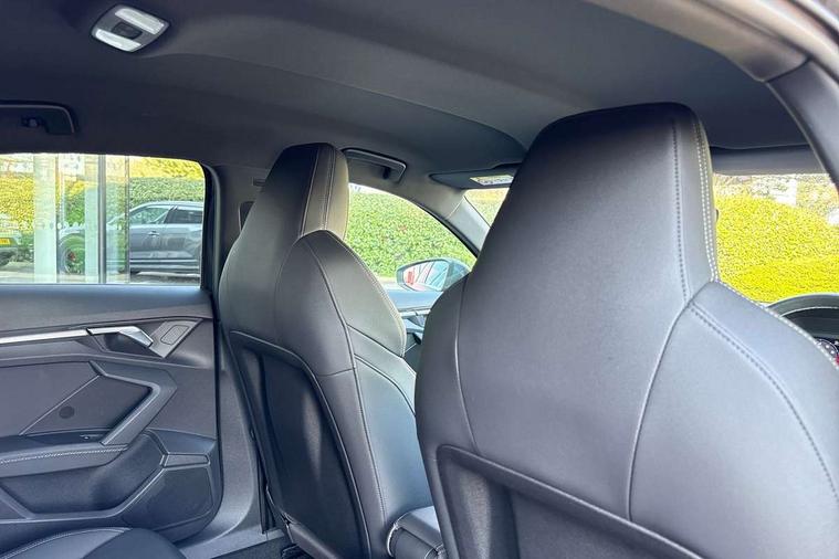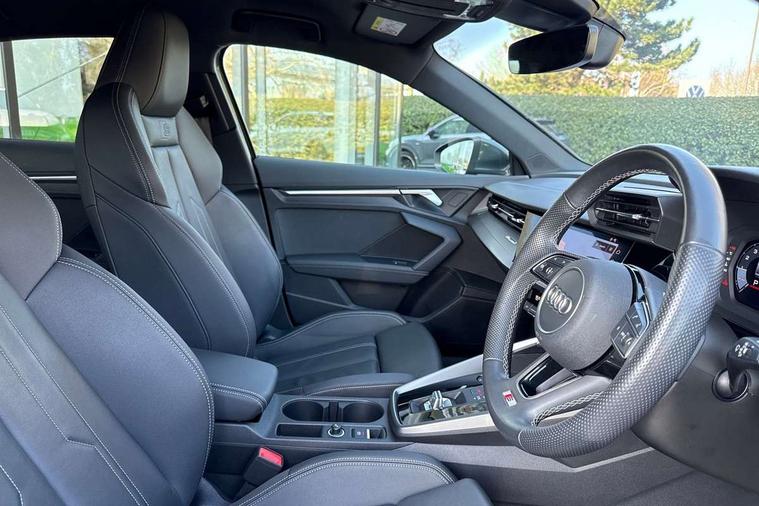 Audi drive select (Auto, Comfort, Dynamic and Individual), Audi smartphone interface, Audi Virtual Cockpit - 10.25" digital and colour instrument cluster, Automatic start/stop system with recuperation, Bluetooth interface, Camera based traffic sign recognition, Collision avoidance assistant, e-Call (emergency call), Electromechanical power speed sensitive steering, Lane departure warning system, MMI Navigation Plus with high resolution 10.1" colour touch screen display, Service indicator, Trip computer, Voice control system with natural language interaction, Sports suspension, 2xUSB-C connection with data and charging functions, 6 passive loudspeakers, CD player, DAB Digital radio, 3rd brake light, Acoustic glass windscreen, Aluminium window trim, Auto dimming frameless rear view mirror, Body colour exterior mirrors, Electrically adjustable/heated/folding/auto dimming door mirrors with integrated LED indications + kerb view function for passenger side, Front electric windows, Illuminated door sills with aluminium inserts at the front with S logo, LED daytime running lights, LED headlights with LED rear lights and dynamic rear indicators, Light and rain sensors, Model and engine designation badges at rear, Privacy glass - dark tinted rear window, rear door and side windows, Rear boot, Rear electric windows, Rear side wing doors, S line bumpers, S roof spoiler, 12V socket and storage compartment in front centre console, 3 seat bench in 2nd row, 3 spoke leather multifunction steering wheel with gear shift paddles, 4 way electrically adjustable lumbar support for driver and front passenger, 60/40 split folding rear seat bench, Black cloth headlining, Dual zone electronic climate control, Front and rear centre armrest in artificial leather, Front and rear headrests, Front/rear floor mats, Height and reach adjustable steering wheel, Interior lighting - glove compartment light and right hand side, Luggage compartment floor covering, Manual boot compartment lid, Manually adjustable front seats, Seat side bolsters, Single front passenger seat, Stainless steel pedals and front footrest in black, Twin leather upholstery with front sports seats S embossed logo, Aluminium interior elements pack - A3, LED interior lighting pack - A3 Saloon, S line styling pack - A3 Saloon, 3x3 point rear seat belts, Driver and front passenger airbag with passenger airbag deactivation, Electronic Stabilisation Control (ESC) including ABS, ASR and EDL, First aid kit with warning triangle and 2 safety vests, Front side airbags with head airbags and interaction airbag, Pre-sense front with pedestrian and cyclist detection, Seatbelt monitoring, Tyre pressure loss indicator, Anti theft alarm, Anti-theft wheel bolts, Electronically operated child locks, Immobiliser, Remote control central locking, Aluminium air vent surrounds, Dark spectrum aluminium inlays, accent surfaces in the dashboard and centre console in platinum grey silk effect paint finish,