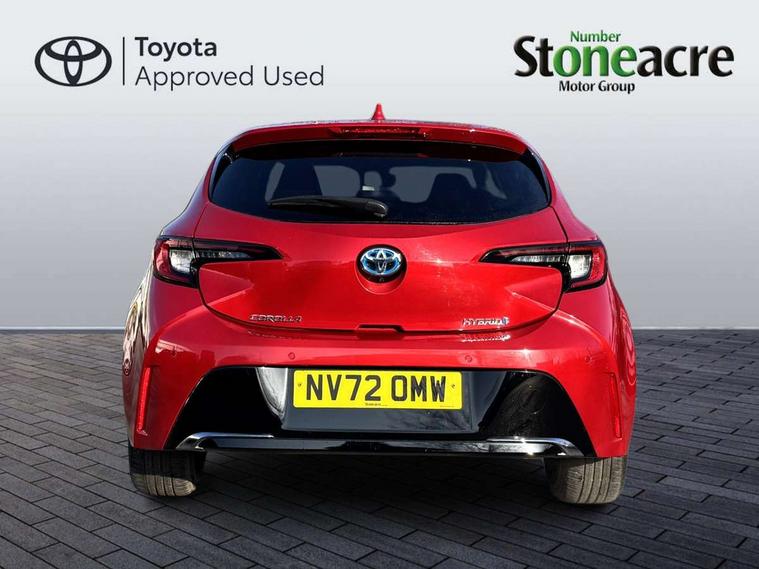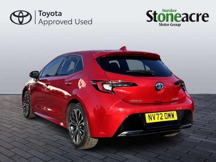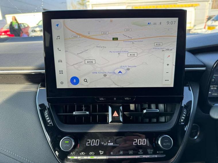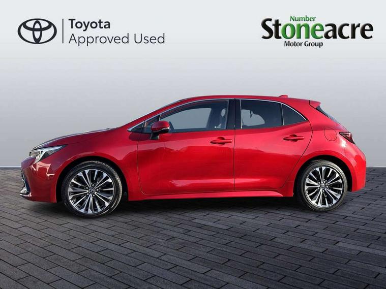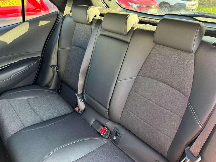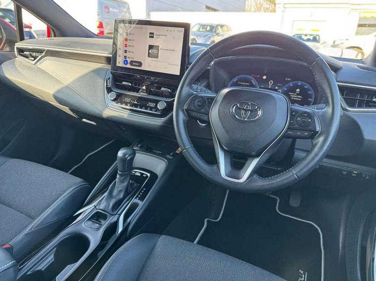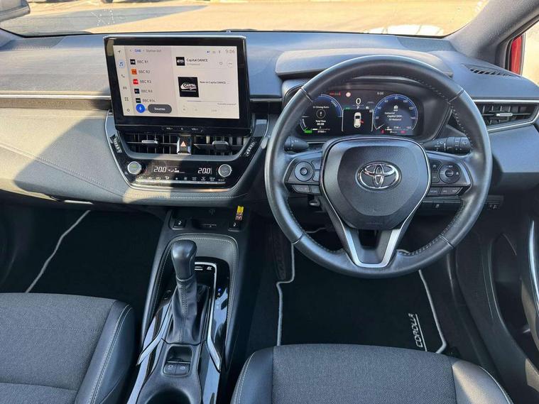 10.5" Multimedia display screen, Attention assist, Bluetooth telephone connectivity, Connected car functionality upgrade, tracker, remote status and e-care, Drive mode select (Eco, Normal), E-call, Electrically assisted power steering, EV drive indicator, Front and rear parking sensors with auto brake, Full Digital 12.3" TFT Digital Combimeter, Key reminder warning, Lane Departure Alert (LDA) switch on steering wheel, Memory on adjustable speed limiter, MyT connected services, Proactive driving assist (PDA), Reversing camera, Smartphone integration with Apple CarPlay and wired android auto, Tailgate, Toyota remote services, Toyota smart connect navigation, Wireless charger, Gasoline particulate filter, Vehicle Stability Control (VSC), 6 speakers, AM/FM radio, DAB Digital radio, Front USB-C in dashboard, Smart voice assist/ Voice recognition, USB and Aux in connectors + 12V front outlet, Anti-jam protection on power windows, Auto up and down function on all power windows, Automatic folding mirrors, Automatic headlights with high beam assist, Black centre and side air vents, Black metallic meshed front grille, Black toyota logo in front, Body coloured bumpers, Body coloured door mirrors, Body coloured front spoiler, Body coloured outside door handles, COROLLA alloy door scuff plates, Electrochromatic mirror, Follow me home headlights, LED daytime running lights, LED dual beam projector headlights, LED front fog lights, LED High mounted stop light, LED multi reflector in headlights, LED rear combi lights with LED lightguide, Manual headlight levelling system, New grille pattern, Noise reduction layer on windscreen, Piano black diffuser, Power adjustable heated door mirrors, Power front windows, Power rear windows, Privacy glass with UV filter, Rain sensing wipers, Rear bumper decoration with chrome plated inserts, Rear side wing doors, Rear under guard with chrome ornament, Rear window defogger, Rear window wiper, Reverse tilting door mirrors, Roof spoiler, Satin chrome insert on front air vents, Satin chrome insert on front door assist grips, Shark fin antenna, Tailgate release with push button, Time adjustment on intermittent wiper, Turning signal integrated indicators in door mirrors, Unique lower skirt, Unique side rocker with black insert, UV-filter on driver and passenger windows, 2 Shopping bag hooks in luggage compartment, 3 rear headrests, 3 seat bench in 2nd row, 3 spoke leather steering wheel with satin insert + gear knob, 4 tie down hooks in luggage compartment, 60/40 split folding rear seat, Adaptive cruise control (ACC) switch on steering wheel, Adjustable speed limiter switch on steering wheel, Audio, multimedia and telephone switches on steering wheel, Black armrest on centre console box, Black gear shift console, Boot light, Centre room light, Driver and front passenger personal light, Driver and passenger assist grip, Driver and passenger sun visor with mirror and light, Dual zone automatic air conditioning with ECO mode switch, Fabric/synthetic leather upholstery, Front and rear cup and bottle holders, Front door pockets, Front head restraints, Front passenger seat, Front sliding synthetic leather armrest, Heated seats, Illuminated entry system in room lamp, ISOFIX seat fixing (2 fixings on rear outer seats), Leather gear shift with satin chrome on gear shift console, Manual height adjustable for driver and front passenger seat, Manually tilt with sliding driver and front passenger seat, Parcel shelf, Passenger seat back pocket, Pollen filter, Power adjustable lumbar support on driver seat, Power window switches with satin chrome inserts, Rear armrest with 2 cupholders, Rear passenger coat hooks (2), Remote air conditioning, Satin chrome inside door handles, Satin chrome surround on heater control panel, Satin chrome surround on speedometer, Sliding armrest on centre console box, Slow opening glovebox with lights, Textile floor mats, Tilt/telescopic steering column, Voice recognition switch on steering wheel, Whiplash Injury Lessening (WIL) feature (active headrest) for seats, White ambient lighting on open tray and front cup holder, Toyota safety sense 3 pack - Corolla, 3x3 point rear seatbelts, Adjustable driver and front passenger seat belt extender to top anchor point, Anti lock braking system + Electronic brake force distribution, Brake assist function, Child locks on rear doors, Downhill Assist Control (DAC), Electronic parking brake, Emergency brake light signal (EBS), Front passenger airbag on/off switch, Front seatbelt reminder, HAC - Hill start assist control, Rear seat belt reminder, Seatbelt pretensioners and force limiters, Supplemental restraint system (SRS) 7 airbags - dual driver, dual side curtain, side impact and driver knee airbags, Traction control, Tyre pressure warning system, Acoustic vehicle alert system (AVAS), Alarm with motion sensor and immobilizer, Power passenger window lock, Remote central locking + deadlocks, Satin chrome dash trim, Soft touch texture on upper dashboard, Stitching on lower dashboard, 17" Black machined face 5 double spoke alloy wheels, Tyre repair kit, Unique wheel finish with red wheel cap,