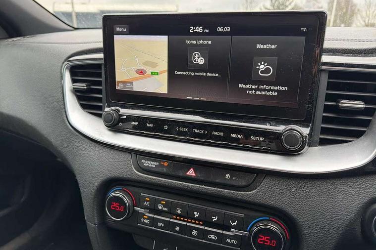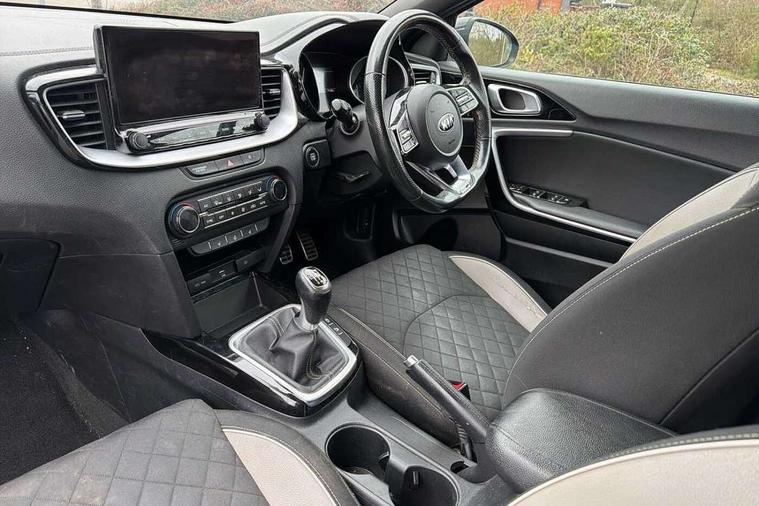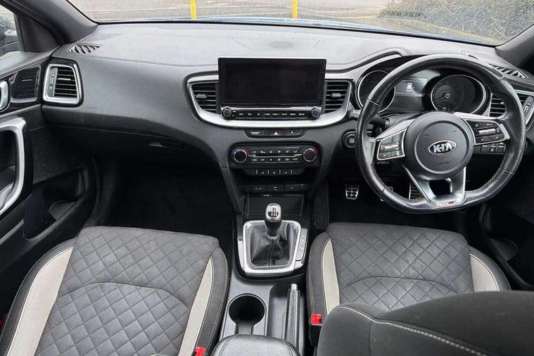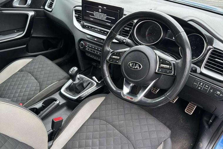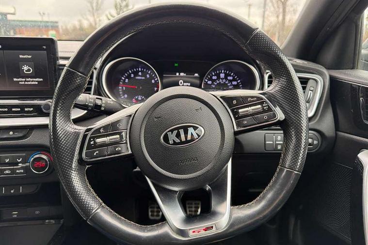 10.25" touchscreen satellite navigation including telematics, 4.2" supervision colour cluster display, Apple car play/Android Auto with voice control, Bluetooth with Voice Recognition & Music Streaming, Cruise control + speed limiter, Driver attention warning, Emergency stop signalling system, Forward Collision-Avoidance Assist (FCA) - City/Pedestrian, Kia connected services featuring TomTom live, Lane keep assist, Motor driven power steering, Outside temperature gauge, Rear parking sensor, Reversing camera with dynamic guide lines, Service interval indicator, Trip computer, Intelligent Stop and Go, 6 speaker audio system, DAB Radio with MP3, Illuminated USB & aux ports, Steering wheel mounted controls, USB & AUX Ports for Connection of a Media Device, USB Fast Charger in Front Centre Console, Air intake with black accent lower lip, All-round Electric Windows with Front Auto Up & Down Function, Auto dimming rear view mirror, Automatic defog system, Automatic headlights, Body colour bumpers, Body colour exterior door handles, Body coloured rear roof spoiler with high gloss black trim, Chrome window surround, Electric adjustable/heated/folding door mirrors with LED Indicators and Kerbside Lights, Front fog lights, Front wiper de-icer, Heated rear window with timer, High beam assist, High Gloss Black and Satin Chrome Radiator Grille, High gloss black door mirrors, High gloss black side sill mouldings, Illuminated front door handles, LED daytime running lights, LED High-mounted Brake Light, LED rear fog light, LED rear lights, Privacy glass (rear side windows and rear screen), Projection headlights, Rain sensing front wipers, Rear bumper with dual exhaust, Rear wash/wipe, Tinted glass, Wide view drivers door mirror, Windscreen Washer Level Warning, 12V socket in luggage compartment, 3 x passenger assist grips, 60/40 split folding rear seat, All-round height adjustable headrests, Aluminium pedals, Black headlining, Centre console storage box/armrest, Cloth/faux leather upholstery, Cupholders in centre console, Cupholders in rear armrest, Dash illumination dimmer switch, Driver & Front Passenger Sunvisors with Vanity Mirror Illumination & Ticket Holder, Driver + front passenger electric lumbar support, Driver's seat height adjuster, Dual Height Luggage Area Floor, Dual zone automatic air conditioning, Faux leather door trim, Front and rear door storage, Front map light with sunglasses case, Front Passenger Seat Height Adjuster, Front seat and rear pockets, Gear shift indicator, Heated front seats, Heated steering wheel, Interior door lock/unlock function, ISOFIX Child seat top tethers and anchor fixings, Leather D-Cut steering wheel with grey stitching, Leather handbrake, Leather steering wheel and gearshift, Luggage area light, Luggage area parcel shelf, Luggage hooks, Rear centre armrest, Rear coat hooks, Satin chrome interior door handles, Tilt/telescopic adjustable steering wheel, ABS with Electronic Brakeforce Distribution (EBD) and Brake Assist System (BAS), All round 3-point seatbelts, Dual front side airbags, Dual horn, Electronic stability control (ESC) and vehicle stability management (VSM), Front passenger airbag deactivation, Height adjustable front seatbelts, Hill start assist control (HAC), Impact sensing auto door unlocking, Rear door child safety locks, Seatbelt reminder warning, Traction control, Twin curtain airbags, Twin front airbags, Tyre pressure monitoring system, Alarm system, Engine Immobiliser & Deadlocks, Engine Start/Stop Button with Smart Entry System, Locking wheel nuts, Speed sensitive auto door locking, Black high gloss front console tray garnish & door trim, Satin Chrome Fascia Trim, 17" GT-Line alloy wheels, Tyre mobility kit,