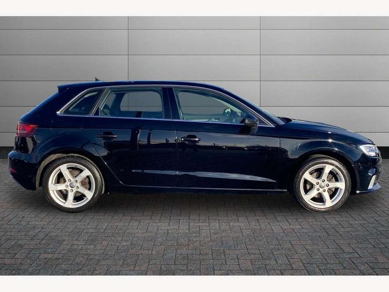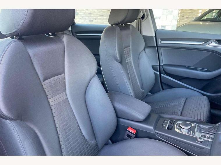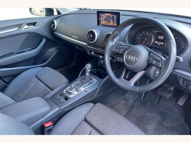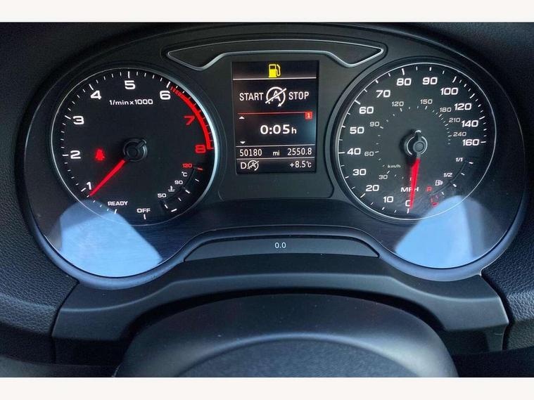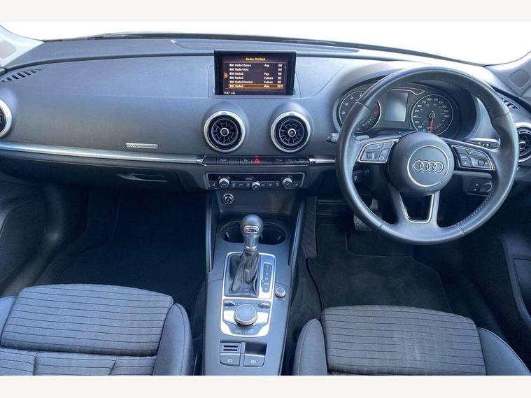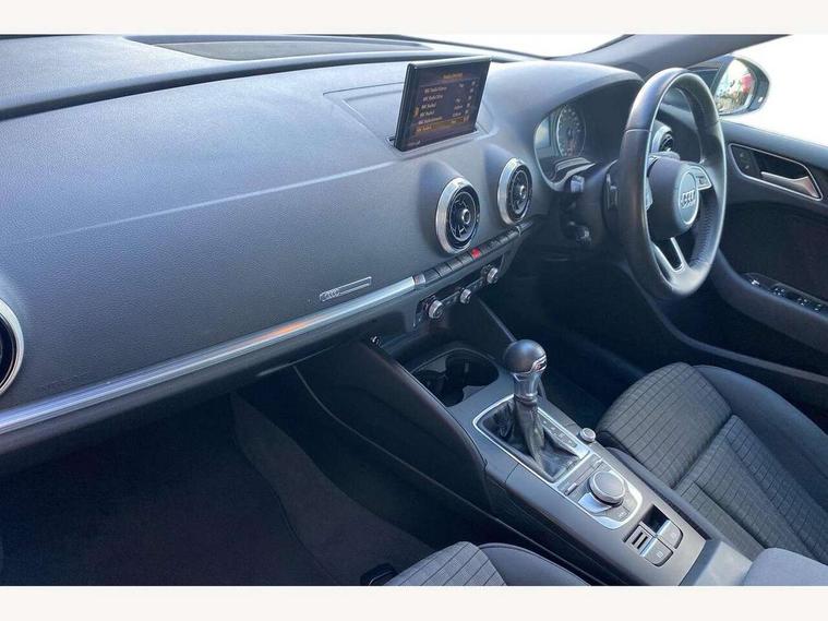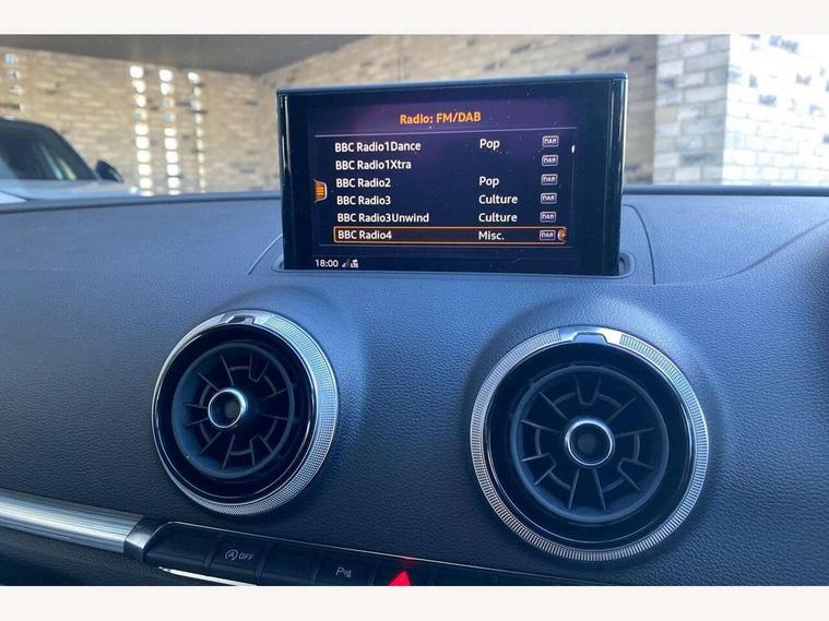 Audi connect, Audi drive select, Audi smartphone interface, Colour driver's information system display, Electro-mechanical PAS, HDD satellite navigation system radio single CD/DVD player MMI control system, Mobile telephone preparation - bluetooth interface, Service interval indicator, Speed limit display, Voice control system, 2 USB ports, Audi music interface, Auxiliary input socket, CD player, DAB Digital radio, MMI radio plus with 7" colour MMI screen and MMI controller, Aluminium window trim, Auto dimming rear view mirror with light and rain sensors, Body colour bumpers, Body colour door mirrors with integral indicators, Body colour roof spoiler, Chrome exhaust tailpipes, Electric front windows, Electric operated/heated door mirrors, Electric rear windows, Heated windscreen washer jets, LED daytime running lights, Matt black radiator grille, Rear wiper, Sport specific side air inlet grille and diffuser insert, Xenon headlights, 3 adjustable rear headrests, 4 lashing points to secure luggage, Adjustable front armrest, Aluminium door sill trims, Dual zone electronic climate control, Front and rear interior lights with delay, Front passenger seat isofix location point, Front sports seats, Front/rear floor mats, Height/depth adjustable steering column, Illuminated glovebox, ISOFIX child seat preparation+airbag deactivation, Jack and tool kit, Rock grey headlining, Steering wheel gearshift paddles, Storage compartment in centre console, Storage compartment under front seats, Storage compartments in doors, Non smoking pack - A3, 3 point seatbelts on all seats, ABS/EBD, Active bonnet, Active front headrests, ASR, Curtain airbags, Driver and passenger side airbags, Driver/Front Passenger airbags, Drivers knee airbag, EDL, Electromechanical parking brake, ESC - Electronic Stability Control + traction control, Front passenger airbag deactivation, Manual rear child locks, Multi-Collision braking, Seatbelt warning, Tyre pressure warning, Warning triangle and first aid kit, Anti theft alarm, Anti-theft wheel bolts, Remote control central locking, Thatcham category 1 alarm + immobiliser, Aluminium air vent surrounds, Aluminium mistral silver inlay, Aluminium trim elements, 17" 5 Arm design alloy wheels, Space saver spare wheel,