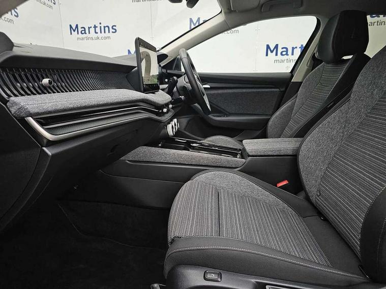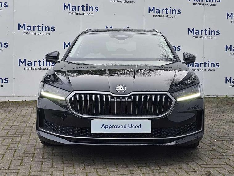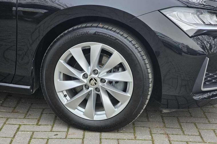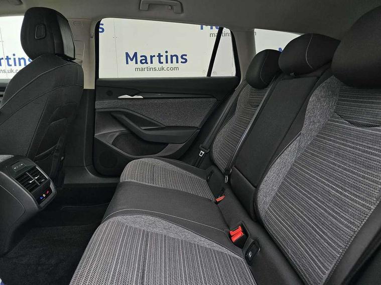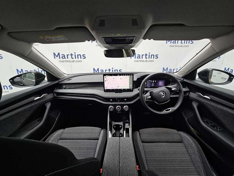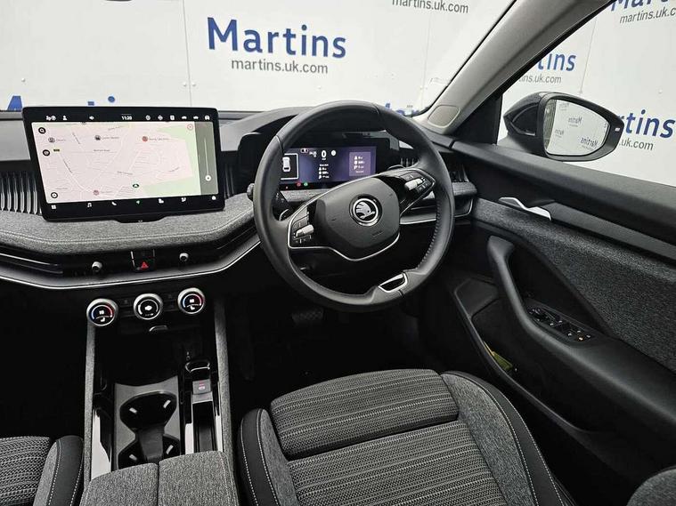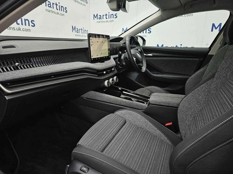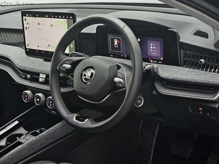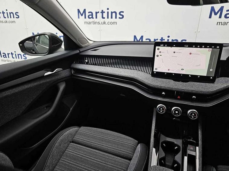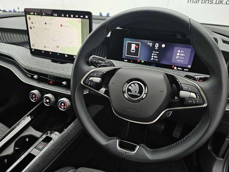 13" touchscreen display with satellite navigation, 4x USB-C ports (2x in front centre console and 2x in rear) (45W), Adaptive cruise control with speed assist, lane assist plus and traffic tram assist, Blind spot detection with door exit warning, Bluetooth system, CareConnect and Emergency Call, ChatGPT functionality, Driver fatigue sensor, Front assist with extended predictive pedestrian protection, Front cross traffic assist, PAS, Quick start all heating software functionality, Rear view camera with washer, Stop/start engine system, Traffic sign recognition, Turn assist with evasive assistance, Virtual Cockpit - 10.25" digital display, Voice control system, Wireless charging for one smartphone (15W) with cooling function, Wireless smartlink apple carplay, SmartLink+ android auto, 8 Speakers, DAB Digital radio, Display cleaner, FM radio connection, Web radio connection, Acoustic side windows and interior noise suppression, Backdrop lighting, Body colour door handles, Body coloured door mirrors, Chrome roof rails, Chrome window surround, Electrically adjustable, heated, folding and driver side auto-dimming door mirrors with integrated indicators and logo projection, Frameless auto-dimming rear view mirror with USB-C, Front windscreen with heat-insulating glass, Ice scraper in fuel tank cap, LED 3rd brake light, Light assist with High beam control, Light assistant (coming/leaving home/tunnel light), Privacy glass, Rear fog light (x1), Rear roof spoiler, Rear side wing doors, Rear windscreen wiper, Tow bar preparation, Unique dark chrome design logo on alloy wheels, Unique dark chrome grille surround with dark chrome rib elements, Windscreen wipers with rain sensor, 12V socket 1x centre console 1x boot, 12V socket and 2x cargo elements in boot, 2 spoke multifunction steering wheel with DSG paddles, 3 seat bench in 2nd row, 4x foldable bag hooks in boot, 60:40 Split folding rear seats, Bottle holders in the front doors 1.5 litre bottle and rear 1.5 litre bottle, Cup holder in front with easy open mat, Front and rear footwell illumination, Front armrest with storage box, Front comfort seats, Heated front seats, Height adjustable driver and front passenger seats with 2-way electric tilt, 4-way pneumatic lumbar support, and extendable thigh support, Height adjustable front and rear head restraints, Height adjustable front passenger seat, Illuminated glovebox, Interior lights with control switches, Isofix child seat fittings in outer rear and front passenger seats, LED front and rear reading lights, Massage function for front seats, Single front passenger seat, Skoda lettering on steering wheel, Storage pockets on back of front seats, Sun visors with illuminated vanity mirrors, Ticket holder on A Pillar, Tri zone climate control, Umbrella in driver's door, 3 rear seatbelts, 8 Airbags - Front driver and passenger, front side driver and passenger, centre, curtain front and rear, drivers knee, Crew protect assist, Driver and passenger seatbelts with warning light, Electronic parking brake, ESC including ABS, EBV, MSR, ASR, EDS, HBA, DSR, RBS, CBC, multi-collision brake (MKB) and Auto hold, Hill hold assist, Power operated child lock in rear doors, Alarm with interior monitoring tilt sensor and back up horn, Backrest remote release from trunk, Electronic engine immobiliser, Keyless start/stop, Remote central locking with SAFE system, Third key, Decorative front door sills,