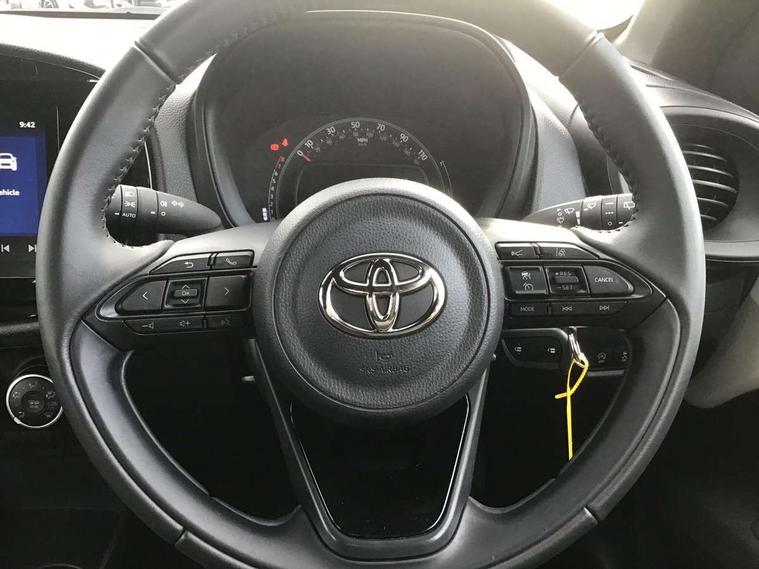4.2" TFT colour screen, Adjustable speed limiter, Analogue speedometer, Bluetooth connectivity, Digital tachograph, Driver attention alert system, eCall emergency call system, ECO-driving indicator, Electric power steering, Intersection turn assist, Key reminder warning, Noise reduction kit, Pre collision system with emergency steering assist, Reversing camera with static guide lines, Smart phone integration with Apple car play/Android Auto, Speed limit display, Start and stop, Vehicle Stability Control (VSC), 4 speakers, 9" HD multimedia display touch screen with Toyota smart connect, DAB digital audio broadcast, USB connector, Auto headlights, Automatic headlights cut-off, Bicycle towing hook, Black lower front grille, Black rear bumper, Black side protection mouldings, Black upper front grille, Black wheel arch mouldings, Body colour door handles, Body coloured front bumper, Boot door scuff plate, Electric heated door mirrors, Follow me home headlights, Front power windows, Gloss black door mirrors, Headlight cut-off reminder, LED daytime running lights, LED front light guide, LED High mounted stop lamp, Manual day/night rear view mirror, Manual headlight levelling, Pagoda roof, Power adjustable door mirrors, Power back door, Projector halogen headlights, Rain sensor, Rear combination lights LED bulb type, Rear side wing doors, Rear windscreen defogger, Rear windscreen wiper, Short antenna, Variable intermittent windscreen wipers, 12v power outlet - front, 2 seat bench in 2nd row, 3 spoke leather steering wheel, 50/50 split folding rear seat, Adhesive roof headlining, Adjustable speed limiter switch on steering wheel, Audio and telephone switches on steering wheel, Black insert on steering wheel, Boot light, Centre room light, Chrome interior door handles, Chrome surround on air conditioning buttons, Clean air filter, Fabric upholstery, Floor mats, Front and rear cup holders, Front head rest deco art, Front head restraints, Gear shift indicator, Height adjustable driver seat, Intelligent adaptive cruise control switch on steering wheel, ISOFIX child restraint system on rear seats, Lane departure alert switch on steering wheel, Leather gearshift knob, Light grey roof lining, Manual air conditioning, Manual tilt steering wheel, Manually reclining and sliding driver seat, Manually reclining and sliding front passenger seat, Multimedia switches on steering wheel, Pollen filter, Rear door pockets, Rear head restraints, Resin console box storage, Satin silver insert on gear shift knob, Silver stitching on gear shift knob, Single compartment glovebox with lights, Single front passenger seat, Soft tonneau cover, Sun visors with mirror on driver and passenger side, Voice recognition switch on steering wheel, Toyota safety sense pack - Aygo X, Anti lock braking system + Electronic brake force distribution, Child safety door lock, Emergency brake light signal (EBS), Hill start assist control (HAC), Passenger airbag on/off switch, Seat belt reminder for front and rear seats, Supplement restraints system (SRS) - 6 airbags, Traction control, Tyre pressure warning system, Immobiliser, Remote power door locks, Black air vent surround, Black wheel centre caps, Tyre repair kit,