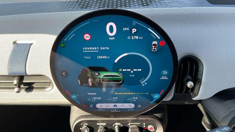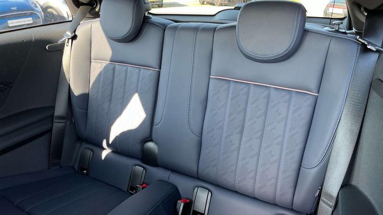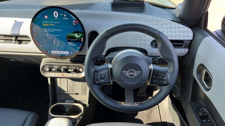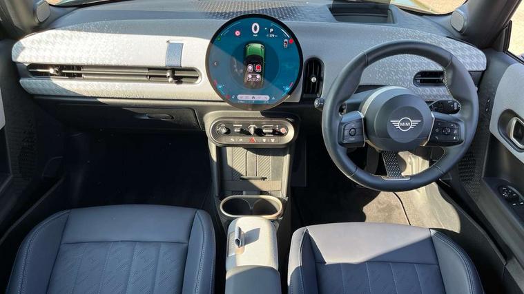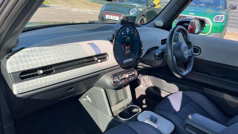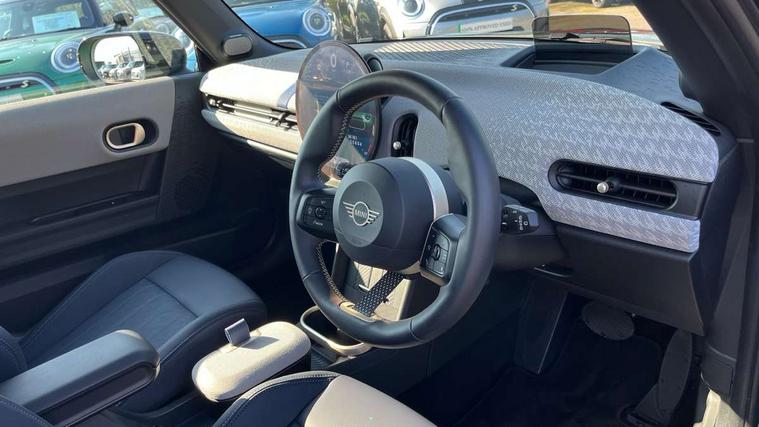 Central toggle bar, Circular OLED Screen, Compatible mobile phone bluetooth with audio streaming, Cruise control, Digital instrument cluster, Electro-mechanical speed dependant steering assistance, Emergency call service, MINI Experience Modes, Mini navigation system, On board computer, Service interval indicator, 7 speed steptronic transmission with double clutch, DAB Digital radio, Personal eSim, Auto headlights, Electric adjustable heated door mirrors, Electric front windows, Heated rear window, Heated windscreen washer jets, LED daytime running lights, LED Headlights, LED indicator lights, LED rear lights, Logos in Vibrant Silver, Rain sensor window wipers, Rear fog lights, Rear window wiper, Vibrant silver grille surround, 2 seat bench in second row, 2 zone automatic air conditioning, 60/40 rear seat bench, Ambient lighting, Cupholders, Dark headliner, Floor mats, Front and rear head restraints, Front compact armrest, Heated steering wheel, Height adjustable passenger seat, Lidded storage box in grey knit, Luggage compartment lighting, Single front passenger seat, Sport Vescin Steering Wheel, Sunvisors with vanity mirrors, Vescin synthetic leather upholstery, Driving assistant pack - Cooper Hatchback, Park assistant pack - Cooper Hatchback, 3 point seatbelts on all four seats, 6 Airbags - front, side, head and seat belt tensioners, Acoustic pedestrian protection, Anti-lock braking system (ABS), DSC - Dynamic Stability Control, Electronic parking brake, Front and rear disc brakes, Front ISOFIX (iSize), Front passenger airbag deactivation, Traction control, Tyre pressure monitoring system, Alarm, Immobiliser, Remote central locking, Blue decorative dash strap, Light Beige/Grey dash knit, Tyre repair kit,