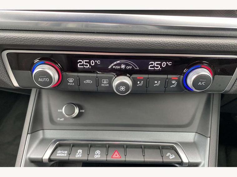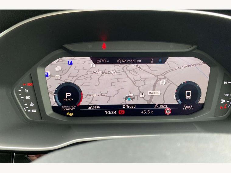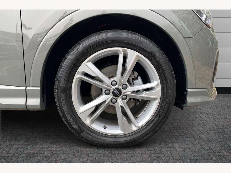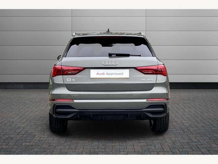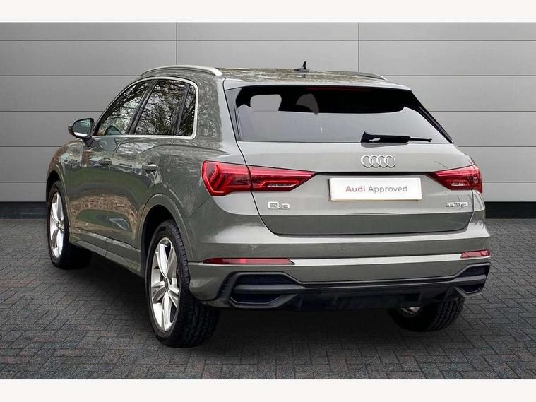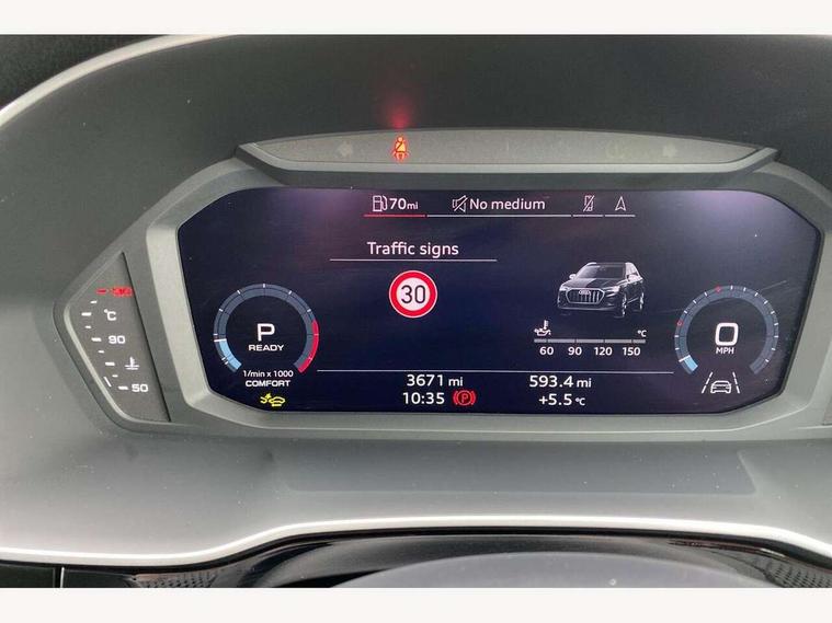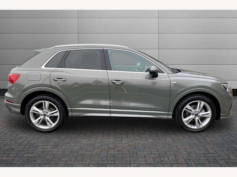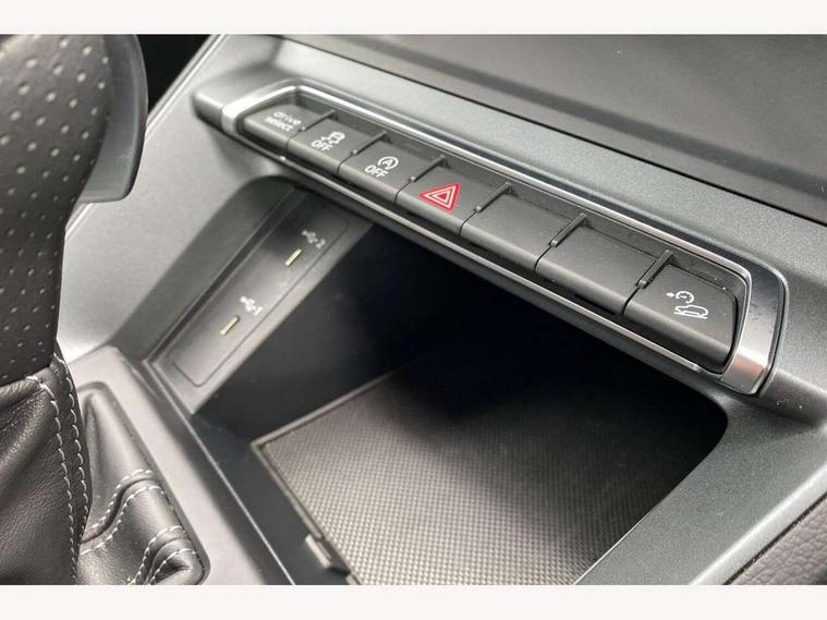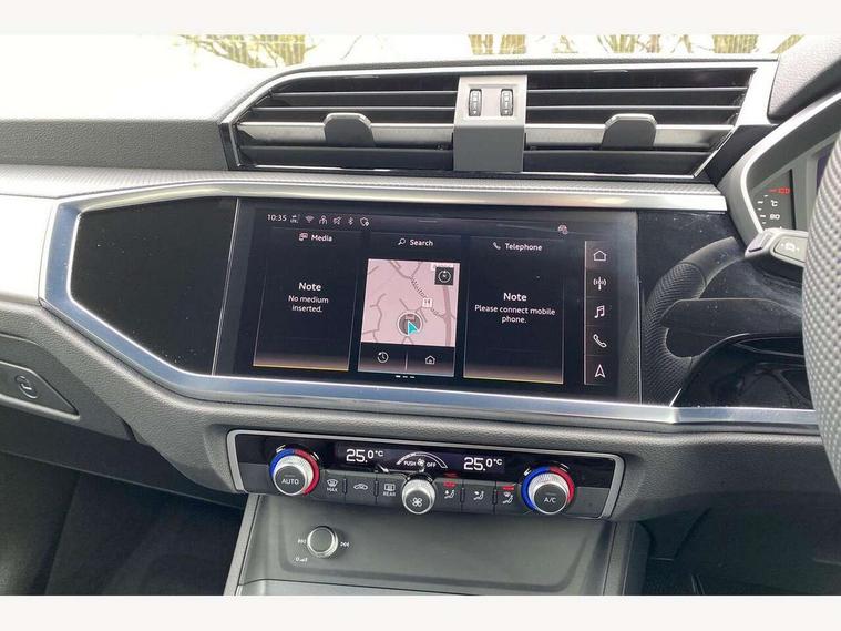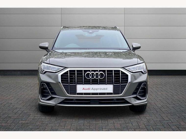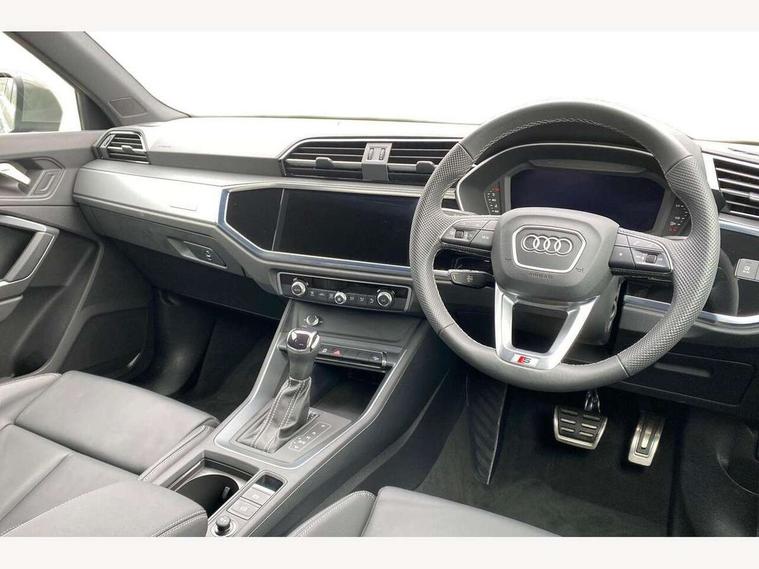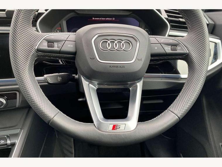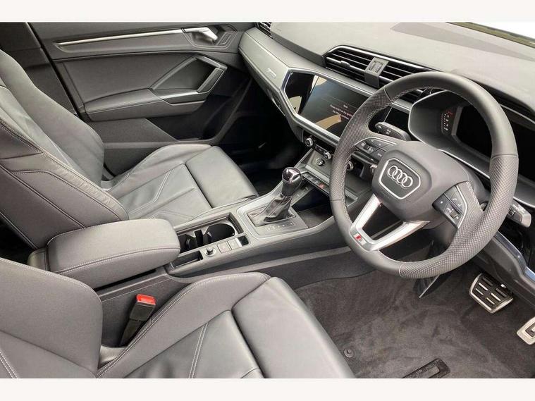 Amazon alexa Integration, Audi connect safety and service, Audi drive select, Audi lane departure warning, Audi Virtual Cockpit - 10.25" display, Bluetooth interface, Camera based traffic sign recognition, Distraction and Fatigue warning, Legal emergency call, MMI Navigation Plus with high resolution 10.1 inch touchscreen colour display, Power operated tailgate, Progressive steering, Service interval indicator, Smartphone interface includes wireless Apple carplay/Android Auto, Start stop system with recuperation, Voice control system with natural language interaction, Sports suspension, 2 USB-C ports with charge and data functions, 6 passive loudspeakers, DAB digital radio module, Acoustic windscreen, Aluminium roof rails, Aluminium window trim, Anthracite black radiator grille, Auto dimming door mirrors, Auto dimming frameless rear view mirror, Body colour front spoiler blade, Electrically folding, adjustable and heated door mirrors with integrated LED side indicators and kerb view function for passenger side, Front and rear electric windows, Front fog lights, Front side air inlets in matt platinum grey, Grille vertical bars in aluminium silver/Matt, High gloss black finish B and C pillars, LED Dynamic rear indicators, LED headlights with LED daytime running lights, LED rear lights, LED third brake light, Privacy glass dark tinted rear and rear-side windows (from B-pillar backwards), Rain and light sensors, Rear diffuser grille in grained matt black, Rear diffuser strip in matt anthracite black, Rear side wing doors, Rear wiper, S line badges on front wings, S line front and rear bumpers and side skirts in contrasting Manhattan grey paint finish, Side skirt insert in matt Platinium grey, Variable front intermittent wipers, 12V socket in rear centre console, 3 seat bench in 2nd row, 3 spoke leather multifunction steering wheel features S badging and grips in perforated leather with contrast stitching, 40:20:40 folding with manual adjustment for 60:40 forwards/backwards position and backrest angle, Adjustable rear seat bench/backrest with centre armrest and cupholder, Black cloth headlining, Dual zone electronic climate control, Electric lumbar support, Front and rear black floor mats with contrast stitching in rock grey, Front and rear headrests, Front centre armrest, Height and reach adjustable steering wheel, Illuminated door sill trims with S logo, ISOFIX child seat mounting for front passenger with airbag deactivation and outer rear seat including top tether attachment point for outer rear seats, Manual front seats with height adjustment, Perforated leather gearknob, Single front passenger seat, Stainless steel luggage compartment sill finisher, Stainless steel pedals, Twin leather upholstery with front sport seats + S embossing, Non smoking pack - Q3, 3x3 point rear seatbelts, 6 airbags - Driver, front passenger, curtain and side windows, Audi pre-sense front with pedestrain and cyclist recognition, Electrically operated child locks on rear doors, Electromechanical parking brake, Electronic stabilisation control including ABS, ASR and EDL, Front seatbelt reminder, Hill descent control, Hill hold assist, Pre sense basic, Seatbelt monitoring, Tyre pressure warning, Warning triangle and first aid kit, Anti theft wheel bolts, Immobiliser, Remote central locking, Thatcham approved category 1 anti theft alarm, Aluminium look interior elements, Dark matt brushed aluminium inlay, Detail dashboard around MMI touch colour display in glass look, black with surround in aluminium look, Leatherette door armrest,