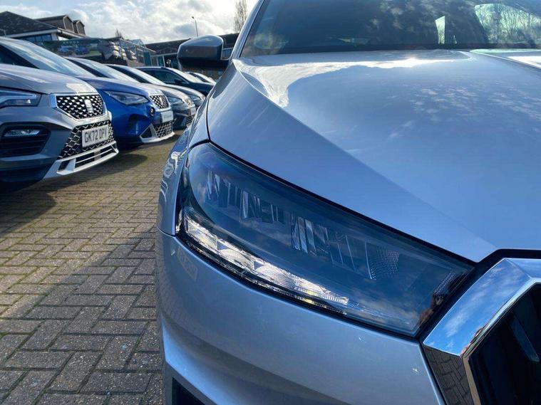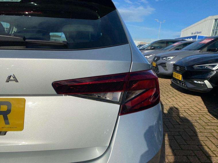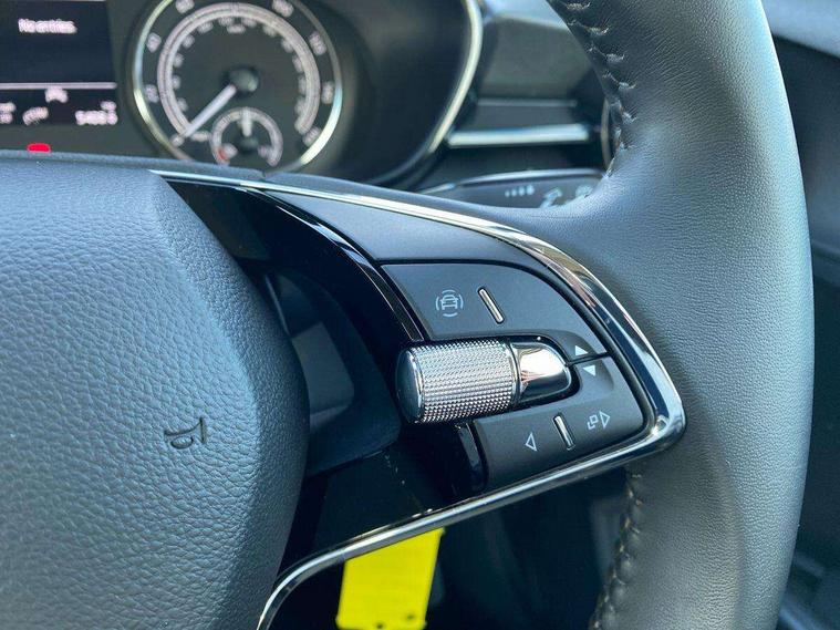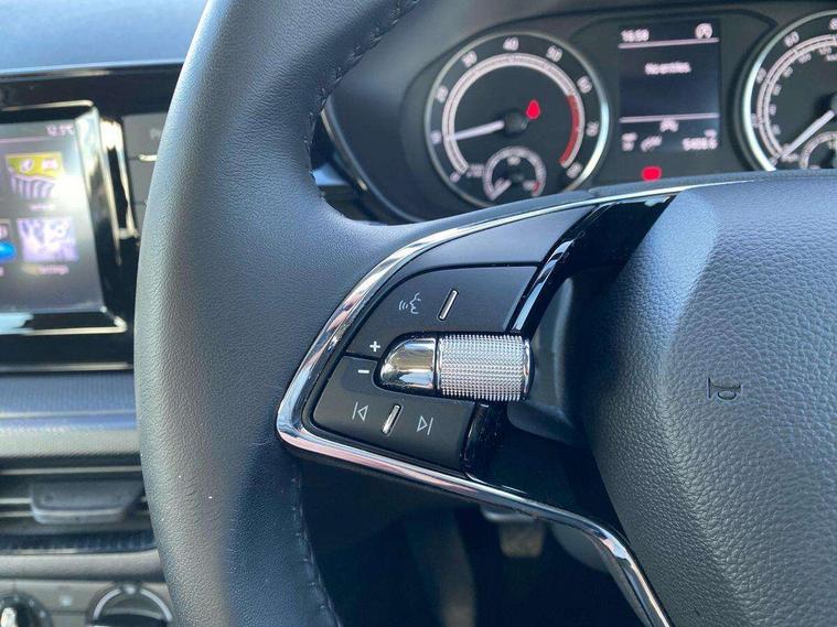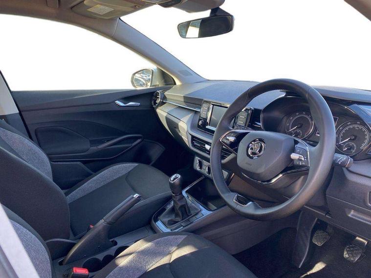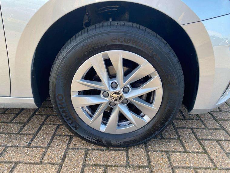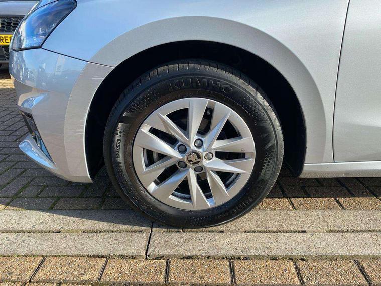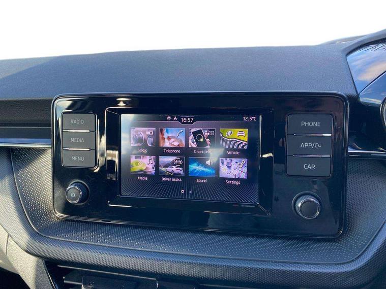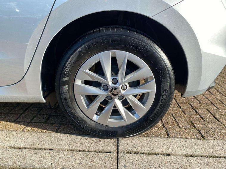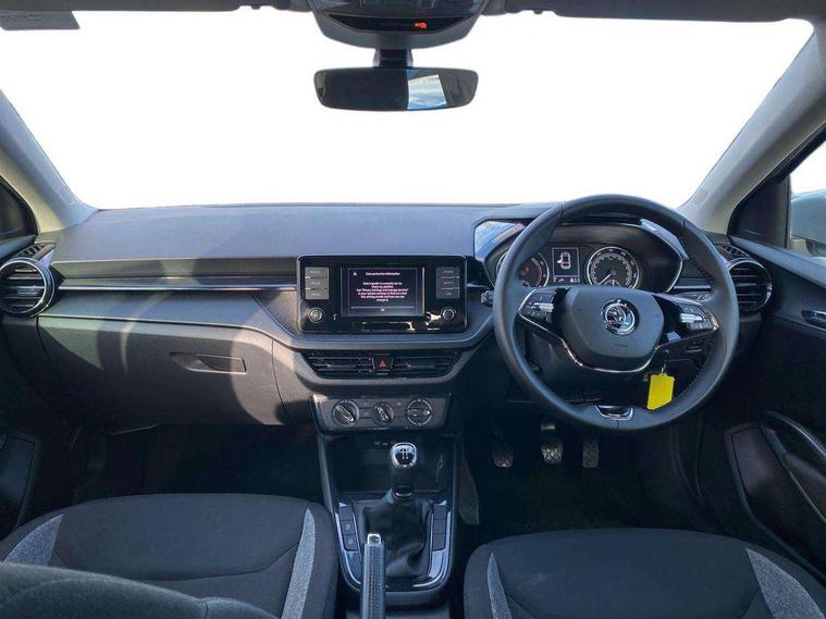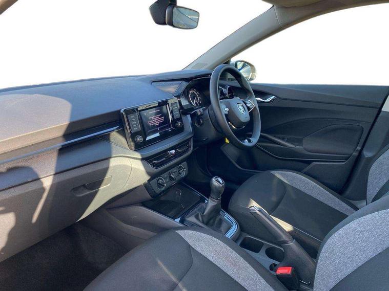 Bluetooth connection, Driver alert system - DAS, Electromechanical power steering, Exterior temperature gauge, Lane assist including road edge detection, Multifunction trip computer in black and white, Service interval indicator, Speed limiter, 2x USB-C in the front (for data transmission and charging), 4 speakers in front, Auxiliary socket for external MP3 player, DAB digital radio reception, Radio Swing with 6.5" colour display, Basic LED Headlights, Basic rear lights, Body colour door mirrors, Body coloured bumpers, Dimming rear view mirror with black frame, Door mirror integrated indicators, Electrically adjustable and heated door mirrors, Electrically adjustable front windows with function auto up/down, Front fog lights, Front window wiper intermittent control, Headlight range control - Automatic, Ice scraper in fuel cap, LED daytime running lights with coming and leaving home feature, Mechanical adjustable rear windows, Rain sensor, Rear LED fog light, Rear side wing doors, Rear window wiper with washing nozzles, Roof mounted spoiler, SKODA tailgate lettering in chrome, Third brake light, 2 reading lights in front and 2 reading lights in rear, 2 spoke leather multifunction steering wheel, 3 rear headrests, Backrest split and folding, Central console with fixed cup holder and storage box, Chrome handbrake release button, Fabric upholstery, Gearshift knob/handle in leather, Grain satin black interior door handles, Hand brake lever handle in leather, Height adjustable front headrests, Height adjustable front seats, Height adjustable steering wheel, ISOFIX and TopTether anchorage points to the outer rear seats, ISOFIX and TopTether on the front passenger seat, Luggage compartment lighting, Manual air conditioning, Manually adjustable lumbar support in front seats, Pollen filter, Rear seat bench unsplit, Single front passenger seat, Storm grey headlining, Sun visors with mirror and airbag label on passenger side, Ticket holder, 3-point height adjustable front seats belts with pretensioner and force limiter, Automatic warning lights in case of crash, Driver and passengers airbag with switch off function, e-Call+, ESC including ABS, MSR, ASR, EDS, HBA and XDS, Front and rear seat belt warning, FRONT ASSIST (AEB City and AEB Inter Urban), Front side airbags, Head airbags, One tone horn, Pedestrian protection, Three rear 3-points safety seat belts with pretensioner and force limiter including stop function for outer rear seat belts, Tyre pressure monitoring system, Anti-theft alarm system including immobiliser, interior monitoring, backup horn, and towing protection, Central locking with radio remote control, interior controls, SAFE function and 2 foldable keys, Black painted air vents, Glossy black decorative trim, Grain satin black central console cover, Grain satin black lower decorative trim, Satin black door and side trim panel in front, Anti-theft wheel bolts protection, Super-low rolling resistance tyres,