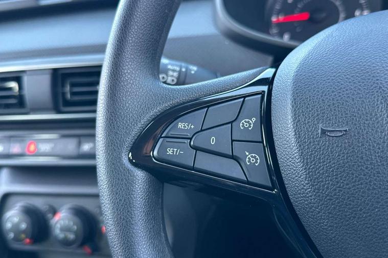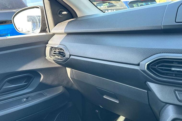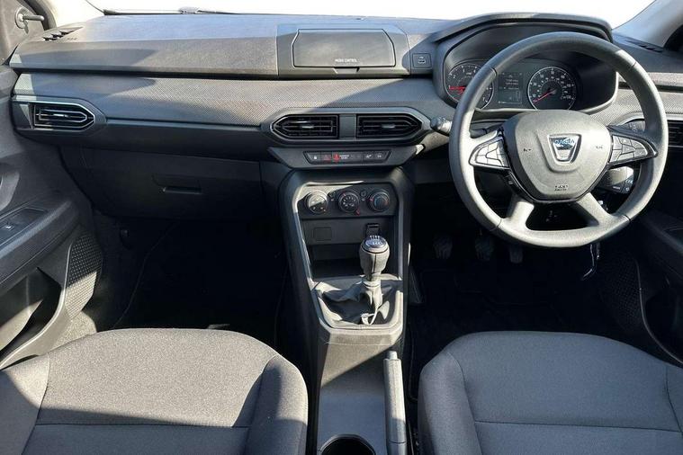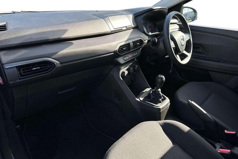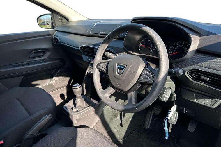 3.5" TFT instrument panel with on-board computer, Cruise control with speed limiter, eCall emergency call system, Eco mode, Electric power assisted steering, Rev counter, Stop/start system, Media Control - DAB Radio with display on instrument panel, Bluetooth, 2 Speakers, Pre-wiring for radio and speakers, USB connection for data transfer and charging, USB socket, 3 speed windscreen wipers, Auto lighting, Black door handles, Black door mirrors, Black radiator grille, Body coloured bumpers, Front electric windows, Heated rear window, High level third brake light, LED automatic daytime running lights, LED Y shape Dacia signature lighting, Manually adjustable door mirrors, Rain sensor, Rear manual windows, Rear side wing doors, Rear wash/wipe, Tinted windows, 1/3 to 2/3 split folding rear seats, 12 volt front socket, 3 height adjustable rear headrests, 3 seat rear bench, Black interior door handles, Fabric upholstery, Fixed smartphone holder on dashboard, Front armrest, Gear shift indicator, Height adjustable driver seat, Height adjustable front headrests, Height/depth adjustable steering wheel, Isofix points for child seats in both outer rear seats, Manual air conditioning, Satin chrome air vents, Single front passenger seat, Steering wheel controls, 3x3 point rear seatbelts, ABS and Emergency brake assist, Automatic emergency braking system, Child locks on rear doors, Door open warning, Driver airbag, ESC (Electronic Stability Control), ESP (Electronic Stability Program) + Hill Start Assist, Front curtain airbags, Front seatbelt pretensioners, Front side airbags, Height adjustable front seatbelts, Passenger airbag, Seatbelt reminder for driver and front passenger, Tyre pressure monitor, Automatic central locking, Immobiliser, Remote central locking, 15" Steel wheels with full wheel cap, Tyre inflation kit,