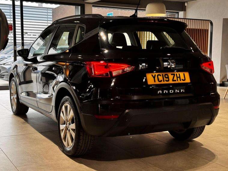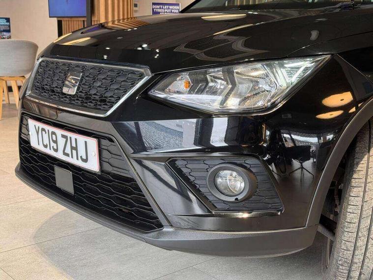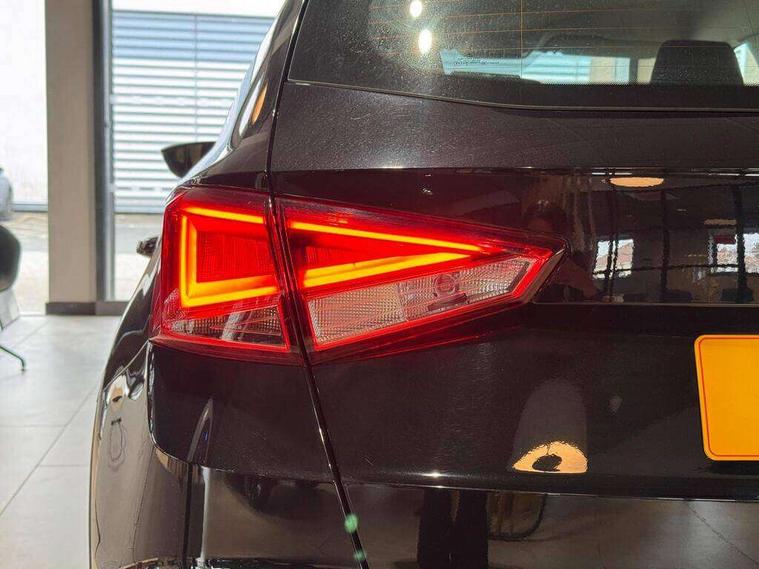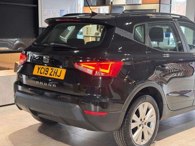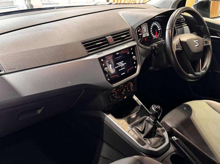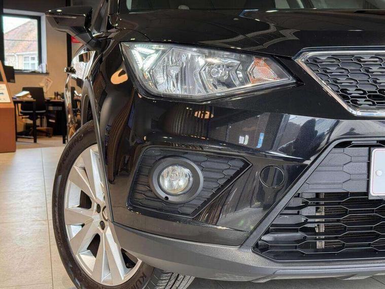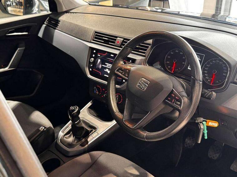 'Lights On' Reminder warning buzzer, Cruise control, Digital clock, Electric speed sensitive power steering, Front assistant collision mitigation, Full Link Smartphone Integration with Mirror Link, Apple Car Play, Google Android Auto, Low fuel warning light, Outside temperature display, Rear parking sensor, RPM counter, Trip computer, Comfort suspension, 6 speakers, Bluetooth interface for hands free and audio streaming, DAB Digital radio, SEAT USB media cable, Steering wheel mounted audio controls, Anti theft roof antenna, Automatic activation of hazard warning lights, Automatic headlights, Black roof rails, Black window surrounds, Body coloured bumpers, Body coloured door handle inserts, Chrome grille surround, Electric adjustable door mirrors, Electric front/rear windows with one touch/auto up/down, Electric headlight adjustment, Front fog lights with static cornering function, Halogen headlights, Hidden exhaust pipe, LED daytime running lights, LED licence plate lighting, LED tail lights, Rear fog lights, Rear window wash/wipe, Visible VIN plate, Windshield wiper with intermittent control and potentiometer, 2 cupholders, 3 rear height adjustable headrests, 60/40 split folding rear seat, Active head restraints, Air conditioning, Ambient interior lighting, Card holder, Cloth upholstery, Double boot floor, Driver and passenger sunvisors, Driver/front passenger seat height adjustment, Dust/pollen filter, Footwell ambient lighting, Front courtesy lights, Front reading light, Gear shift indicator, Height/reach adjustable steering column, Illuminated boot, Instrument lighting with brightness control, Isofix attachments on rear seats, Leather handbrake, Leather steering wheel and gear knob, Connectivity pack plus - Arona, 3 point seatbelts on all rear seats, ABS+EBA, Child locks on rear doors, Driver/Front Passenger airbags, Electronic stability control, Front and rear seatbelt reminder, Front side/curtain airbags, Height adjustable active front headrests, Hill hold control + Tyre Pressure monitor, Multi-Collision braking, Passenger airbag deactivate switch, Tiredness recognition system, Traction control, 2 folding remote keys with window open/close function, Immobiliser, Locking wheel bolts, Remote central locking + deadlocks, Interior chrome line trim, 17" Dynamic alloy wheels,