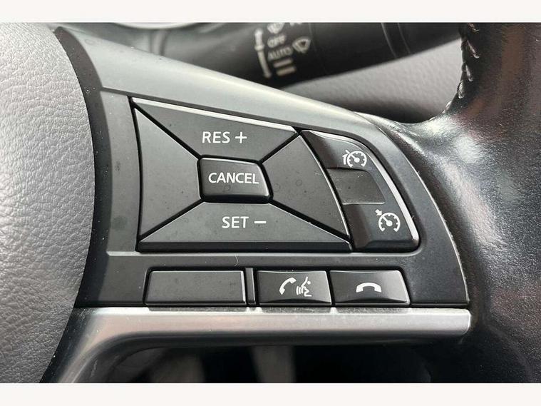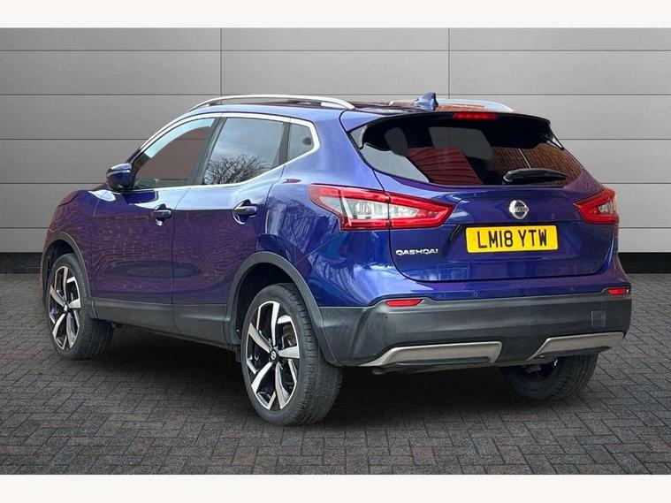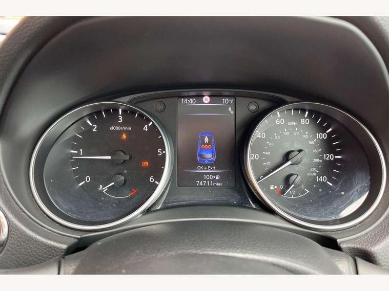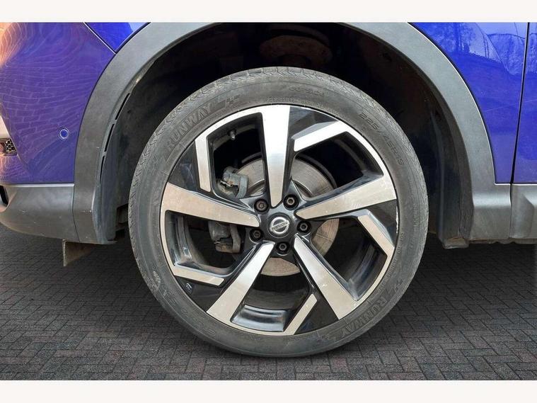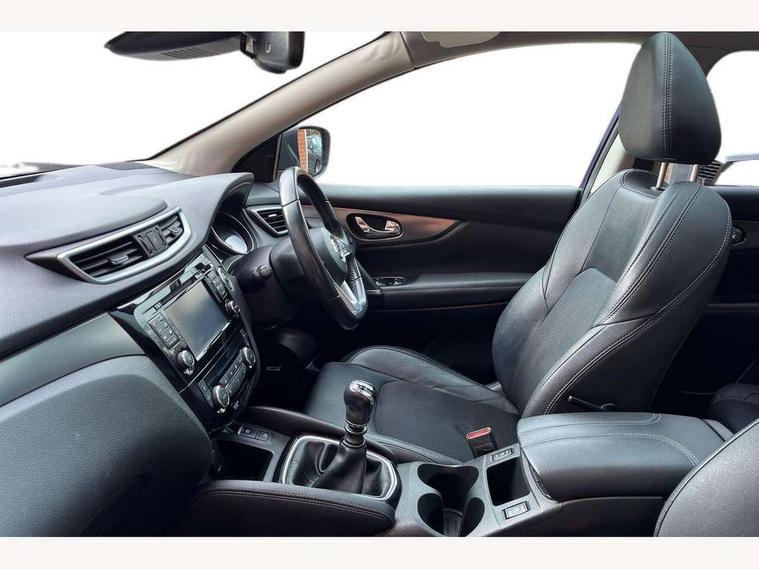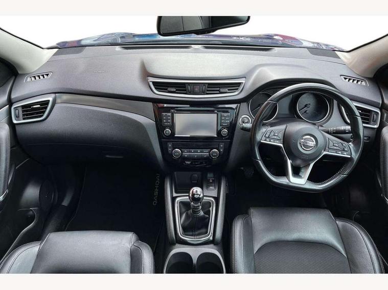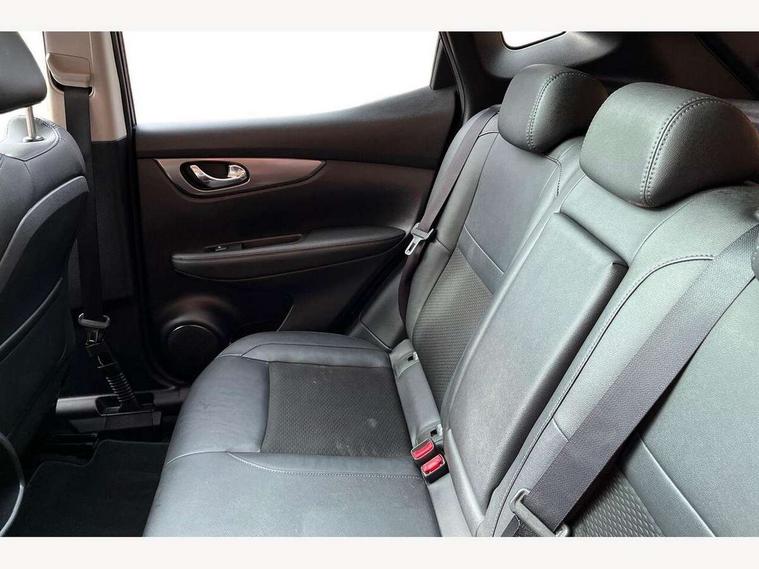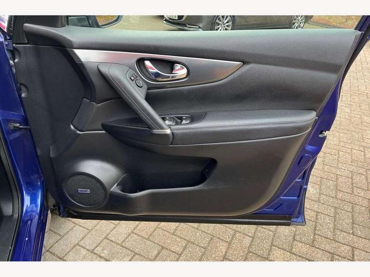 5" TFT driver information centre, Around View Monitor, Blind spot monitoring, Bluetooth phone integration system, Cruise control, Electric speed sensitive power steering, Front and rear parking sensors, Intelligent parking assist, Lane departure warning system, Nissan connect sat nav system, Outside temperature display, Push button starter, Rear view camera, Service interval indicator, Speed limiter, Traffic sign recognition, Trip computer, Diesel particulate filter, 'Shark fin' mobile antenna, Bose premium 8 speaker system, DAB Digital radio, Radio/CD, Smartphone apps, Steering wheel mounted audio controls, USB/aux input socket, Automatic headlamp activation, Body colour bumpers, Body colour door handles, Body colour door mirrors, Chrome window surround, Electric folding and heated door mirrors, Front fog lights, High beam assist, Interior mirror with auto anti dazzle, LED indicators in door mirrors, Matt silver roof rails, One touch electric front/rear windows, Privacy glass, Rain sensor windscreen wipers, Rear roof spoiler, Rear wiper, 2 X front 12v power sockets, 60/40 split folding rear seat, Ambient interior lighting, Centre console with armrest, Chrome interior door handles, Configurable luggage board system, Driver + front passenger lumbar support, Dual zone climate control, Electric adjust driver's seat, Front and rear door pockets with bottle holders, Front headrests, Front seat belt pre-tensioners with load limiters, Height adjustable driver's seat, Height adjustable passenger seat, Illuminated electric window switch, Isofix child seat preparation, Leather gearknob, Leather interior door handles, Leather knee rest, Leather steering wheel, Luggage compartment lighting, Parcel shelf, Part leather upholstery, Pollen filter, Rake/reach adjustable steering wheel, Rear armrest with 2 cupholders, Rear headrests, Heat package - Qashqai, LED pack - Qashqai, ABS, brake assist and EBD, Child locks on rear doors, Curtain airbags, Driver/front passenger airbag, Electronic parking brake, ESP + traction control, Forward emergency braking, Front passenger airbag deactivation, Height adjustable front seatbelts, Hill start assist, Seatbelt warning, Side airbags, Three 3 point rear seatbelts, Tyre pressure monitoring system, Alarm, Immobiliser, Intelligent Key, Remote central locking, Graphite interior trim, Tyre puncture repair kit,