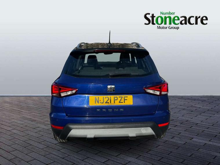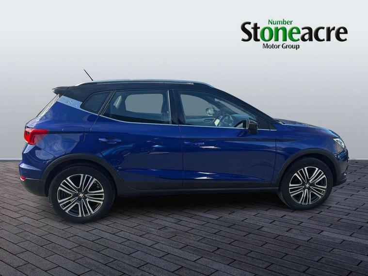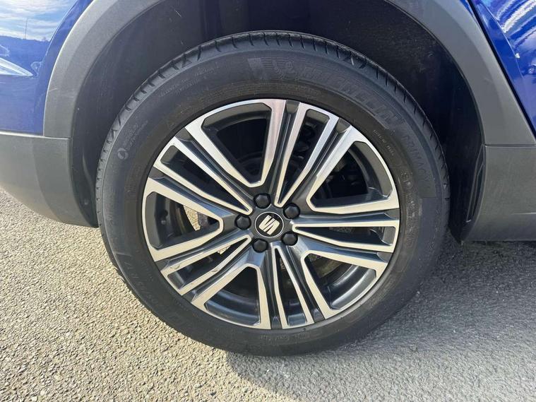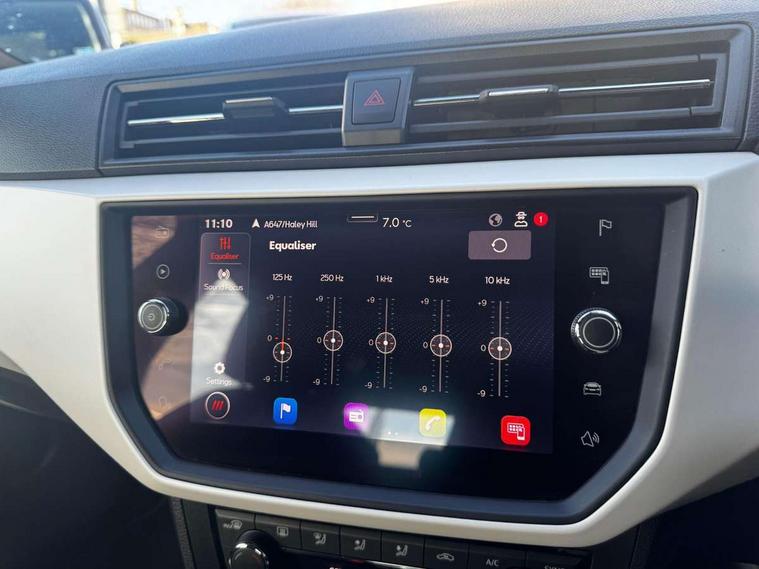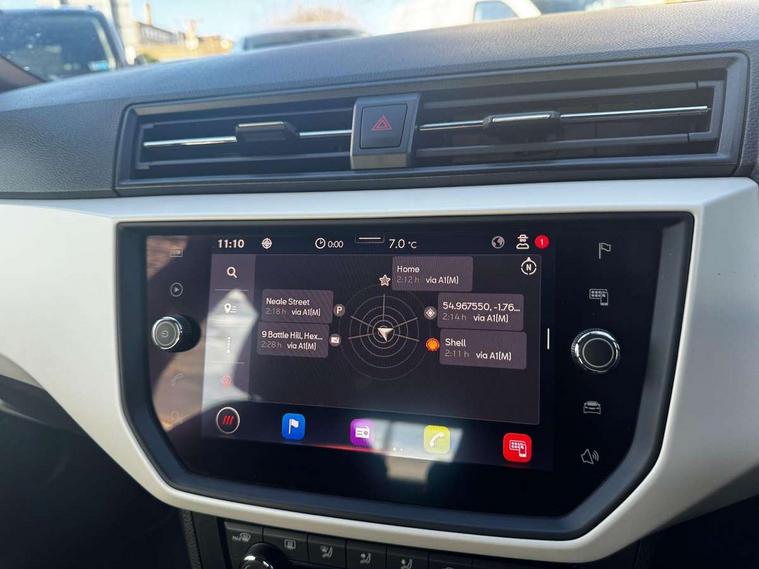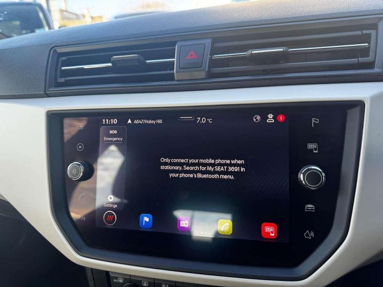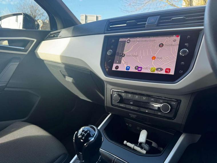 'Lights On' Reminder warning buzzer, Adaptive cruise control, Blind spot monitor, Digital clock, Electric speed sensitive power steering, Full Link Smartphone Integration with Mirror Link, Apple Car Play, Google Android Auto with USB Type C cable for Apple and Android compatibility, Low fuel warning light, Outside temperature display, Rear cross traffic alert, Rear parking sensor, RPM counter, Seat connect with safety, service, remote and online, Trip computer, Comfort suspension, 6 speakers, Bluetooth interface for hands free and audio streaming, DAB digital radio and AM/FM radio, Steering wheel mounted audio controls, Anti theft roof antenna, Auto dimming interior rear view mirror, Automatic activation of hazard warning lights, Automatic headlights, Body coloured bumpers, Body coloured door handle inserts, Chrome front grille frame, Chrome roof rails, Chrome window trim, Coming/leaving home lighting function, Electric front/rear windows with one touch/auto up/down, Electrically adjustable, heated and folding door mirrors, Front grille hot stamping, Full LED headlights dipped and mainbeam + front and rear fog lights, Hidden exhaust pipe, Ice metal door side panels, LED daytime running lights, LED rear tail lights and licence plate lights, Protective side mouldings, Rain sensing wipers, Rear window wash/wipe, Roof colour door mirrors, Visible VIN plate, Windshield wiper with intermittent control and potentiometer, 2 cupholders, 60/40 split folding rear seat, Aircare filter, Black interior roof, Cloth upholstery, Double boot floor, Driver sunvisor with covered mirror + card holder, Dual zone climate control, Front courtesy light with front reading lights, Front seat back storage pockets, Gear shift indicator, Height adjustable front seats, Height/reach adjustable steering column, Illuminated boot, Instrument lighting with brightness control, Interior light in footwell, central console and door panel, ISOFIX points in outer rear seats with top tether anchorage points, Leather steering wheel/gear knob/handbrake, Multi-colour ambient interior lighting, Passenger sunvisor with vanity mirror, Storage net on centre console, Two front and three rear height adjustable headrests, Connectivity pack plus - Arona, Interior chrome pack - Arona, Storage pack - Arona, 3 point seatbelts on all rear seats, ABS, Active front headrests, Child locks on rear doors, Driver and front passenger airbags with front passenger airbag de activation, front side and curtain airbags, Electronic stability control, Emergency Brake Assist (EBA) and front assist, Front and rear seatbelt reminder, Hill hold control, Multi-Collision braking, Tiredness recognition system, Traction control, Tyre pressure monitoring system, 2 folding remote keys with window open/close function, Alarm with back-up horn, Electronic engine immobiliser, KESSY Keyless entry and go, Locking wheel bolts, Remote central locking + deadlocks, Tow away protection, Interior chrome line trim, White dashboard, 17" Dynamic machined alloy wheels,