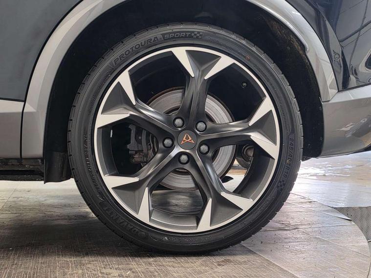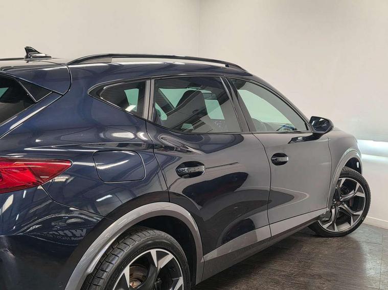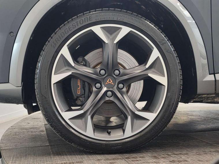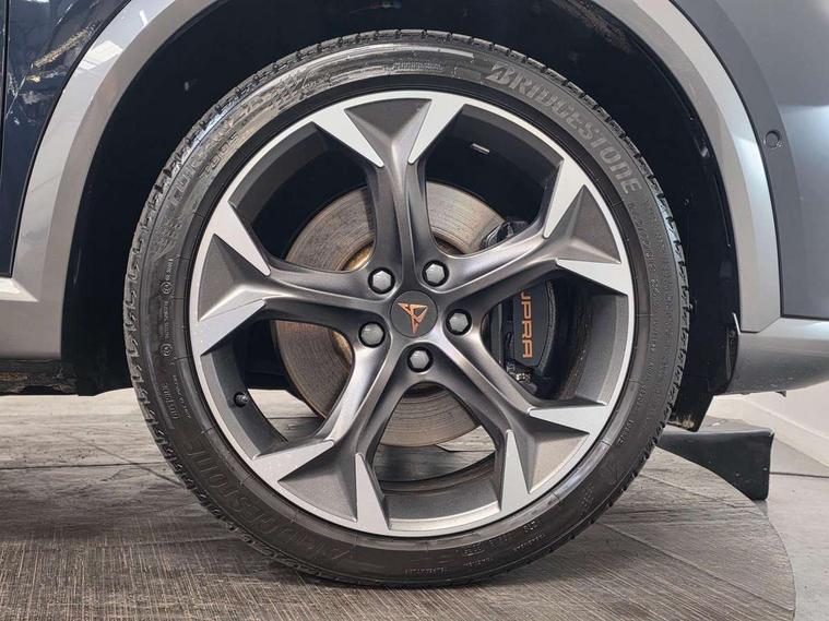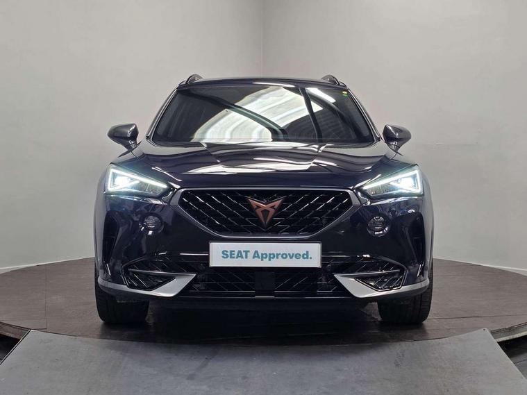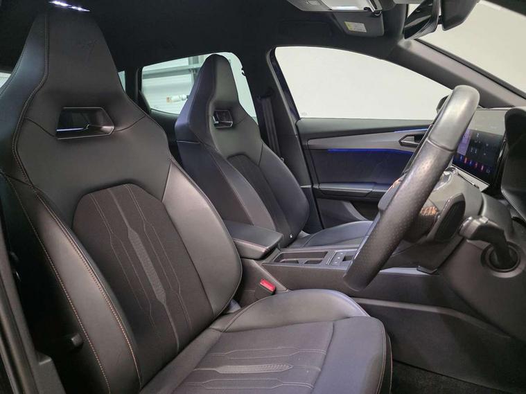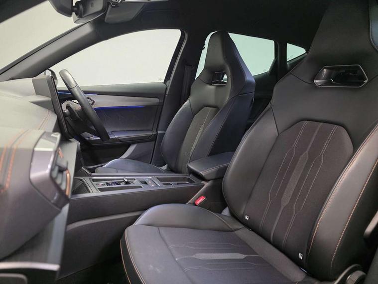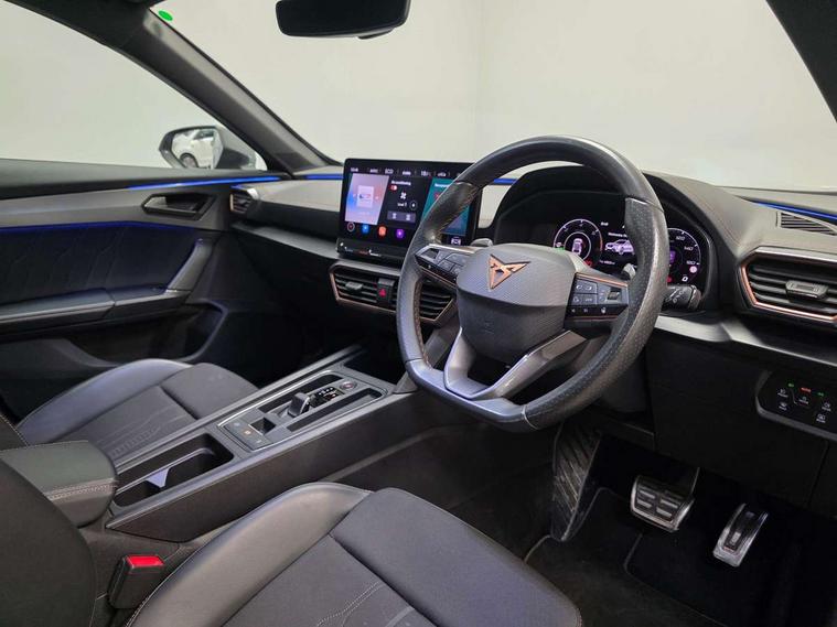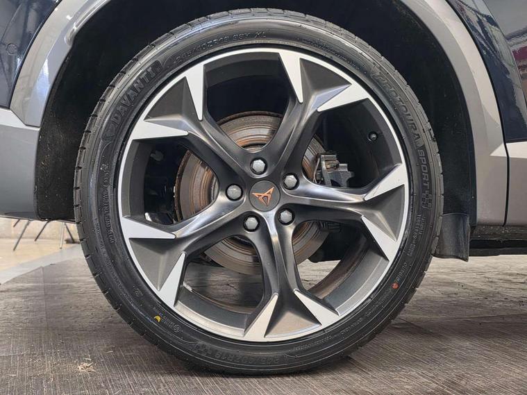 Digital cockpit and configurable dashboard, Driver alert system, Dynamic chassis control with driving profile selection (Comfort, Sport, CUPRA, Individual), Forward collision warning with automatic braking, Lane assist, Park assist (inc front/rear parking sensors), Predictive adaptive cruise control with speed limiter, Rear view camera, RPM, trip computer, outside temp gauge, instrument light brightness, low fuel warning light, lights on reminder, gearshift indicator, Service interval indicator, Speed sensitive power steering, Start/stop system with regenerative braking, Virtual pedal and electric tailgate, Wireless apple carplay, Wireless phone charger, 10 amp mode 2 charging cable, 16 amp mode 3 charging cable, 3.6 kw On-board charger, Electronic locking differential and dynamic traction support, Sports suspension with front shock absoption, 2 front and 2 rear USB type C sockets, 6 speakers, Auxiliary input socket, DAB radio, Auto dimming rear view mirror, Body colour door handles, Body coloured bumpers, Dark grey wing mirror, Daytime running light with automatic headlight control and coming home feature, Dynamic headlight range control, Electric front/rear windows, Electrically adjustable, heated and folding door mirrors, Front fog lamps with cornering function, Gloss black roof rails and window surrounds, LED Headlights, LED Taillights with dynamic indicator, Rain sensing wipers, Rear diffuser with single exhaust pipe on each side with simulated exhaust pipes, Rear wash/wipe, Sports bumpers, Tinted rear windows, Welcome lights, 12v power supply in centre console, 12V socket, 12v socket in loadspace, 2 front and 2 rear reading lights, 230V socket, 60/40 split rear bench seat with armrest and mechanical seat release, Black headlining, Cupra sports pedals, Dust/pollen filter, Front and rear head restraints, Front centre armrest, Height/reach adjust steering wheel, Illuminated interior front door sills, Illuminated sunvisor with mirror, Isofix, Leather multi function heated steering wheel with gear shift paddles, Luggage tie-down hooks, Manually adjustable height and lumbar support for front seats, PVC/Cloth upholstery with copper stitching + bucket seats, Three zone climate control with control panel in rear, Wraparound lighting, Navigation system pack - Formentor, 3 point seatbelts on all rear seats, ABS, Brake control system - ESC and brake booster, Child proof door locks, Driver and front passenger airbags with front passenger airbag de-activation, Electronic parking brake, Front and rear disc brakes, Front side curtain airbags, Hill hold control, Seat belt reminder for front and rear seats, Tyre pressure monitoring system, Anti theft alarm system, Keyless entry and start system (KESSY), Locking wheel bolts, Copper and aluminium interior detailing, 19" 'Exclusive' machined sport matte black and silver alloy wheels, Tyre repair kit,