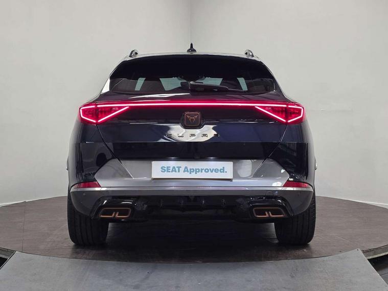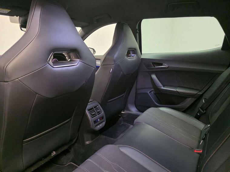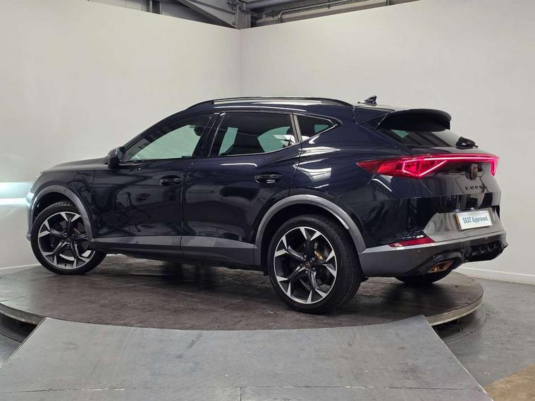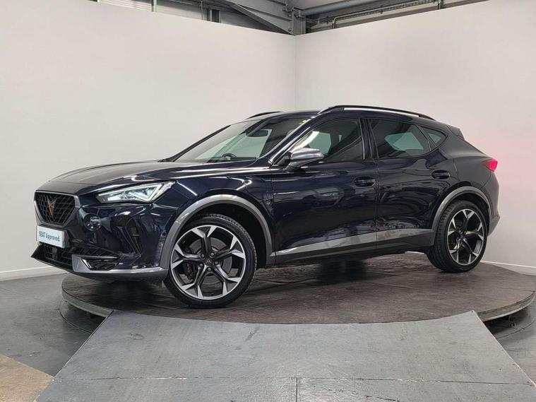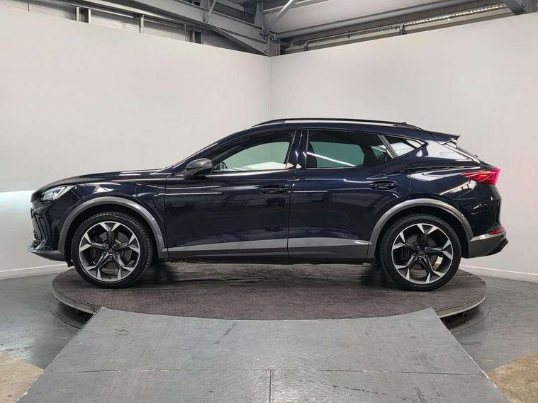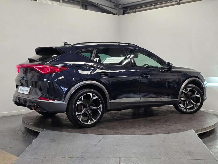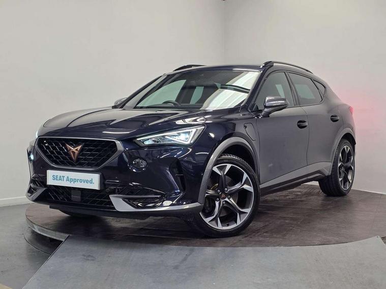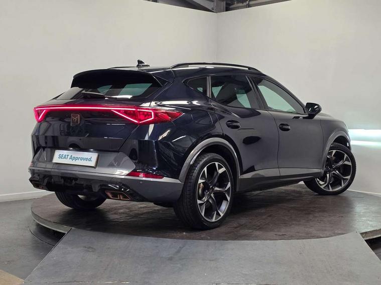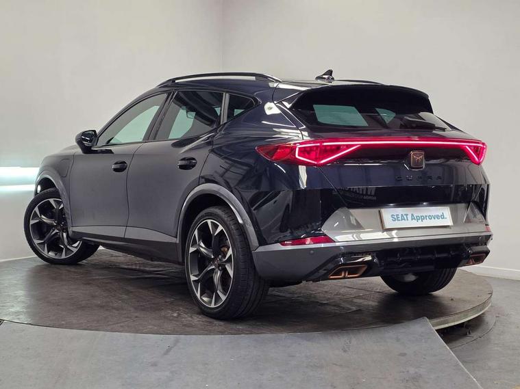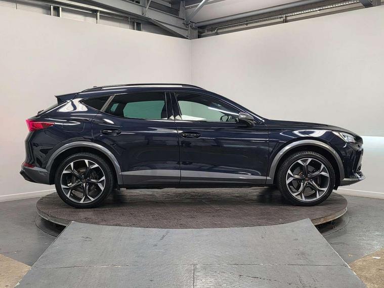 Digital cockpit and configurable dashboard, Driver alert system, Dynamic chassis control with driving profile selection (Comfort, Sport, CUPRA, Individual), Forward collision warning with automatic braking, Lane assist, Park assist (inc front/rear parking sensors), Predictive adaptive cruise control with speed limiter, Rear view camera, RPM, trip computer, outside temp gauge, instrument light brightness, low fuel warning light, lights on reminder, gearshift indicator, Service interval indicator, Speed sensitive power steering, Start/stop system with regenerative braking, Virtual pedal and electric tailgate, Wireless apple carplay, Wireless phone charger, 10 amp mode 2 charging cable, 16 amp mode 3 charging cable, 3.6 kw On-board charger, Electronic locking differential and dynamic traction support, Sports suspension with front shock absoption, 2 front and 2 rear USB type C sockets, 6 speakers, Auxiliary input socket, DAB radio, Auto dimming rear view mirror, Body colour door handles, Body coloured bumpers, Dark grey wing mirror, Daytime running light with automatic headlight control and coming home feature, Dynamic headlight range control, Electric front/rear windows, Electrically adjustable, heated and folding door mirrors, Front fog lamps with cornering function, Gloss black roof rails and window surrounds, LED Headlights, LED Taillights with dynamic indicator, Rain sensing wipers, Rear diffuser with single exhaust pipe on each side with simulated exhaust pipes, Rear wash/wipe, Sports bumpers, Tinted rear windows, Welcome lights, 12v power supply in centre console, 12V socket, 12v socket in loadspace, 2 front and 2 rear reading lights, 230V socket, 60/40 split rear bench seat with armrest and mechanical seat release, Black headlining, Cupra sports pedals, Dust/pollen filter, Front and rear head restraints, Front centre armrest, Height/reach adjust steering wheel, Illuminated interior front door sills, Illuminated sunvisor with mirror, Isofix, Leather multi function heated steering wheel with gear shift paddles, Luggage tie-down hooks, Manually adjustable height and lumbar support for front seats, PVC/Cloth upholstery with copper stitching + bucket seats, Three zone climate control with control panel in rear, Wraparound lighting, Navigation system pack - Formentor, 3 point seatbelts on all rear seats, ABS, Brake control system - ESC and brake booster, Child proof door locks, Driver and front passenger airbags with front passenger airbag de-activation, Electronic parking brake, Front and rear disc brakes, Front side curtain airbags, Hill hold control, Seat belt reminder for front and rear seats, Tyre pressure monitoring system, Anti theft alarm system, Keyless entry and start system (KESSY), Locking wheel bolts, Copper and aluminium interior detailing, 19" 'Exclusive' machined sport matte black and silver alloy wheels, Tyre repair kit,