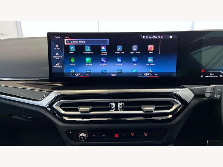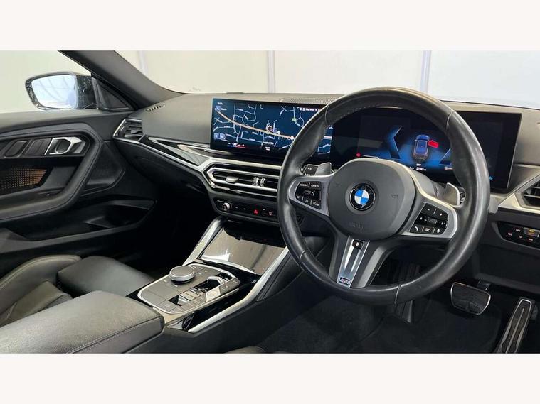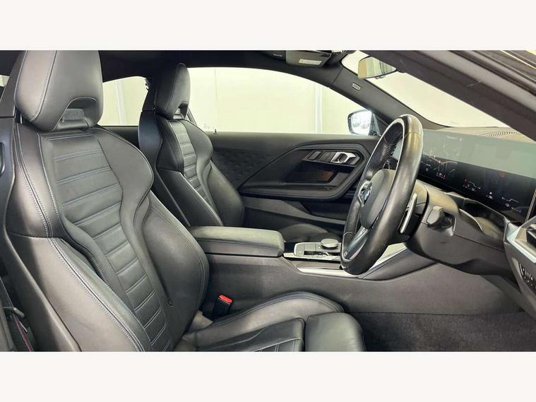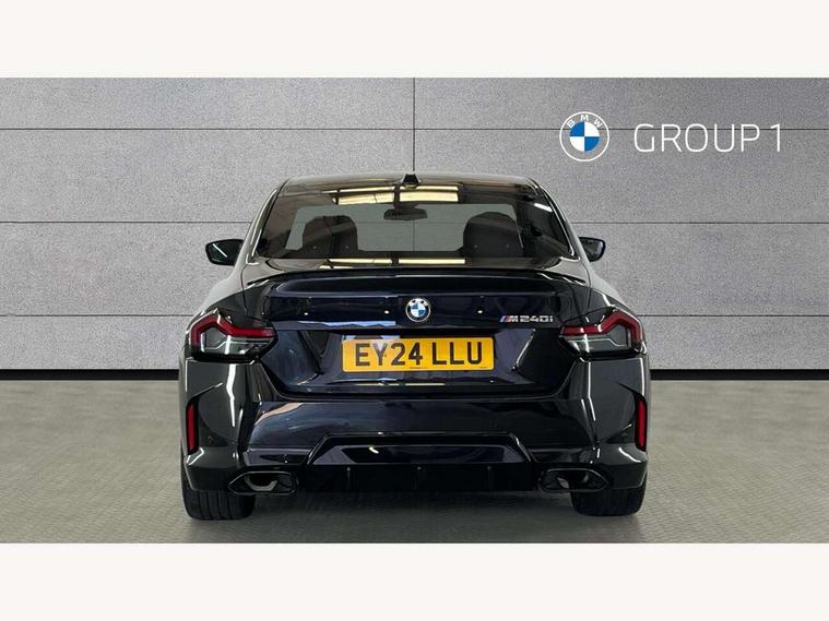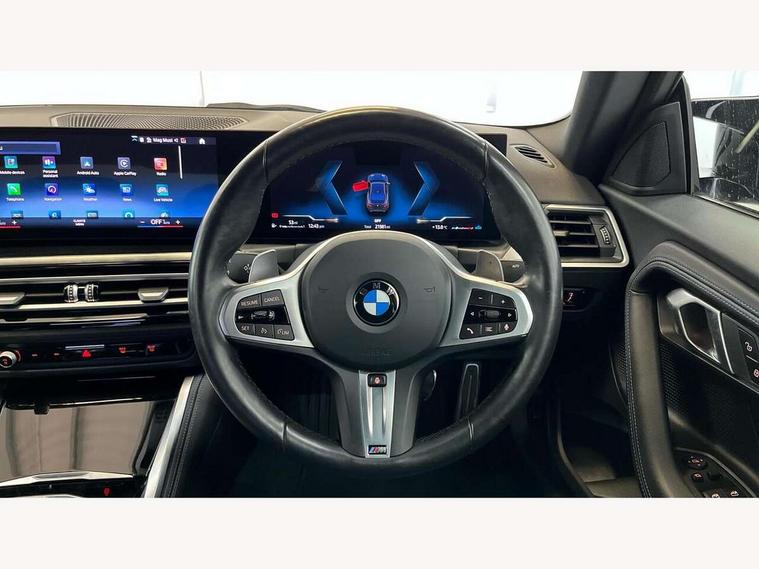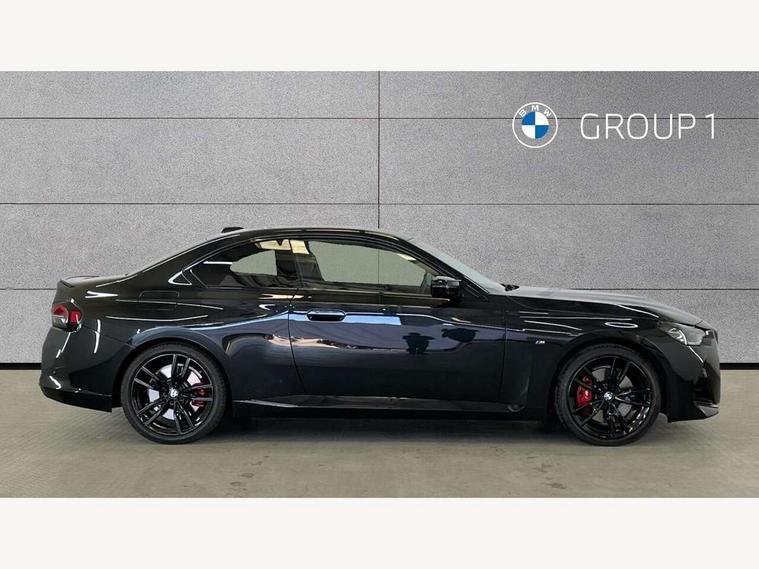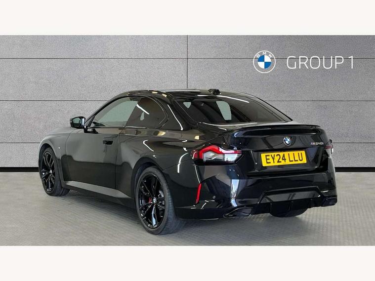 2 USB connections for charging and transferring data, 4G LTE connectivity with hard wired 4G network sim card, Attentiveness assist, Bluetooth with USB, BMW ConnectedDrive online services, BMW Intelligent Personal Assistant, BMW operating system 8 with variable, configurable widgets display information in real time, BMW Teleservices, Check Control warning system for monitoring of lights and door/luggage compartment open warning, Direct selection buttons, Drive off assistant, Driving experience switch with sport+ mode, Eco pro mode, Electric power steering, Front and rear parking sensors, Front/rear Parking distance control, iDrive controller with turn and press function, Integrated owners handbook, Intelligent functions, Live cockpit plus with nav function 12.3" instrument cluster and 14.9" centre display, Oil sensor for level and grade, Optimum shift indicator, Personal Profile, Touch operation on control display, Variable sport steering, Widescreen multi-media display, WiFi interface for wireless connection of mobile terminal devices, Aluminium lightweight construction, Balancer shaft, BMW TwinPower Turbo inline 6-cylinder petrol engine, Double VANOS, Drive performance control with ECO PRO comfort + sport mode, High precision injection, M Sport differential, Petrol Particulate Filter, Sport automatic steptronic transmission with gearshift paddles, manual gearshift time display, launch control, coasting idle ECO PRO/COMFORT modes, Twin scroll turbocharger with Valvetronic, xDrive with rear orientated application, DAB tuner, Acoustic windscreen wipers for reduced driving noise, Adaptive LED Headlights, Automatic windscreen wipers and automatic headlight, Automatically dimming rear view mirror, BMW individual lights shadow line, Body colour door handles flush with door surface, Body colour front and rear bumpers, Daytime running lights, Electric windows - front and rear, with open/close fingertip control and trap release, Exhaust tailpipes x 2 - free form finisher in black chrome in left and right, Exterior air inlets in front bumper with embellishers in high gloss black, Fading support, Flap controlled M Sport exhaust system, Front and rear bumper system with replaceable deformation elements, Front door sill finishers in black plastic with BMW designation, Front ornamental grille frame in high gloss black, Front windscreen wipers with integrated washer jets, Green tinted heat protection glazing, High beam assistant, High gloss black exterior M mirror caps, High gloss black sill, bumper trim sides and diffuser insert, High gloss shadowline exterior trim in mirror triangle cover, mirror cover panel, mirror bezel and window border, High level third brake light, Indicators integrated int mirror housing, LED registration plate light, LED technology rear tail lights, brake lights and turn indicators, Lightweight engineering, M Sport spoiler - Gurney in body colour, Model designation and M badges in cerium grey, Model designation on right side of tailgate, Rear boot, Rear fog lights, Reversing light in rear light cluster, Shark fin antenna, Side frame decorative moulding black high gloss, Single part LED rear lights with smoked glass components, Sun protection glass, Trailer stabilisation logic, Visible VIN plate, xDrive designation on left tailgate, 12V power socket in front centre console with blanking plug, 2 cupholders in front centre console, 2 zone automatic air conditioning, Ambient lighting, Compartment in front of cupholder, Conditioned based service, Driver seat backrest width adjustment, Electric front seat adjustment with driver memory, Front and rear side armrests integrated into door trim, Front armrest, Front door pockets, Front head restraints, Front M Sport seats, Front passenger seat lumbar support, Heated front seats, Illuminated glove compartment with separate small compartment, Lumbar support for driver, M headliner Anthracite, M sport leather steering wheel, M240i badge in instrument cluster, Manually adjustment steering wheel column, Rear seat backrest with manual 40:20:40 split folding, Rear seat centre foldable armrest with integrated cup holder, Single front passenger seat, Storage compartment between rear seats, Storage tray and compartment with cover in centre console, Sun visors with vanity mirrors and insert tab, Through loading system with 40/20/40 split folding 2 rear seat in 2nd row, Two folding rear seat headrests, Velour floor mats, Vernasca leather upholstery, Additional storage compartment pack without USB - 2 Series Coupe, Connected pack professional - 2 Series Coupe, Interior and exterior mirror pack - 2 Series Coupe, M Sport exterior styling aerodynamics pack - 2 Series Coupe M240i, 2 tone horn, Anti lock braking system (ABS) with cornering brake control, Automatic Stability Control (ASC), BMW emergency call, Brake drying, Child seat ISOFIX attachment for the two outer rear seats, Crash sensor activating of airbags, Unlocking doors, hazard warning lights, interior light, safety battery terminal, Deactivation of fuel pump in the event of a crash, Driver and front passenger airbags, Driver and front passenger side airbags, integrated in the door side seat backrest bolsters for all seat variants, Dynamic brake control, Dynamic stability control + (DSC+), Dynamic Traction Control - DTC, Electrically operated hand brake including automatic hold function and automatic release when driving off, Front and rear disc brakes, Head airbags for all 4 outer seats, M seat belts, M Sport brake with red calipers, Manual deactivation of front passenger airbag, Seat belt security check for driver and front passenger, Seatbelt warning, Side impact protection, Three point seat belts on 4 seats including front belt stopper, pyrotechnic belt tensioners and belt force limiters, Tyre pressure sensor, Warning triangle and first aid kit, Alarm system (Thatcham 1) with remote control and electronic engine immobiliser, Central locking switch for all doors, fuel filler cap and luggage