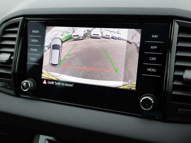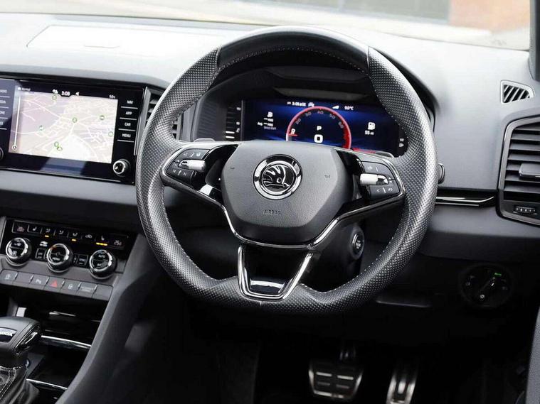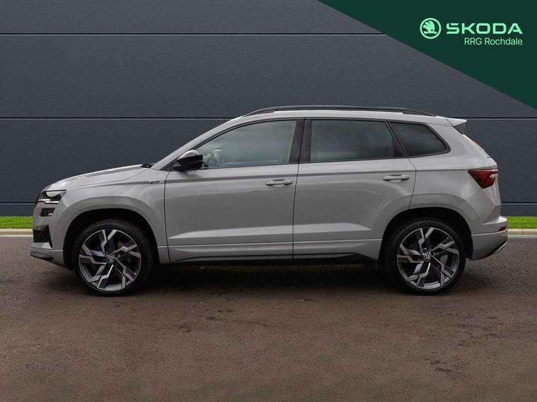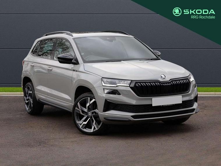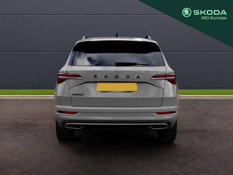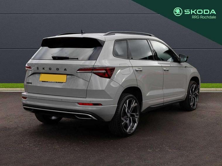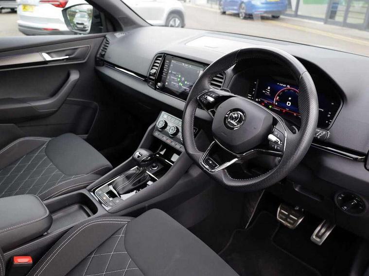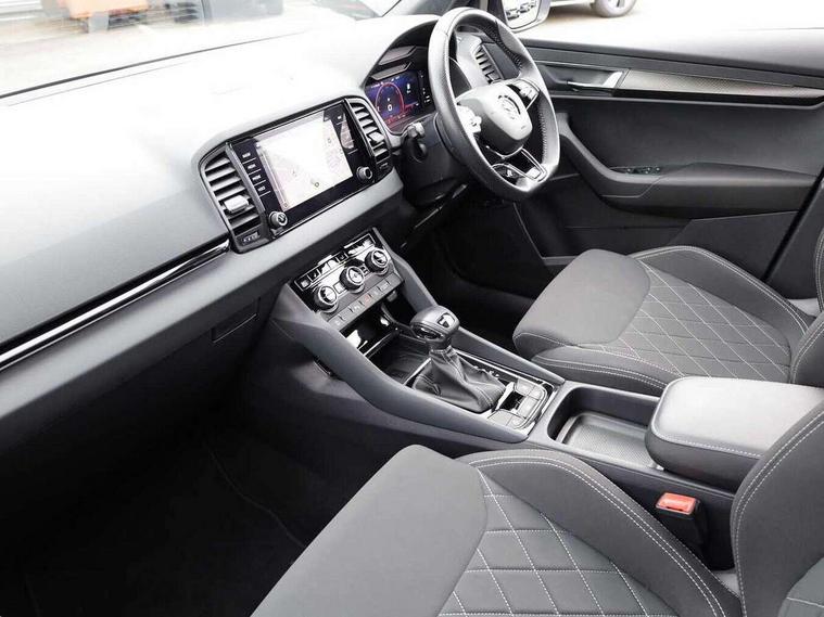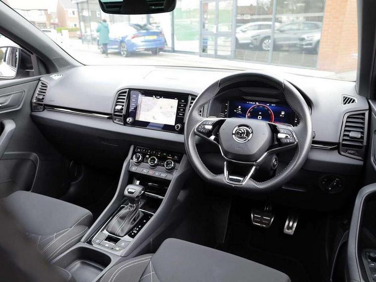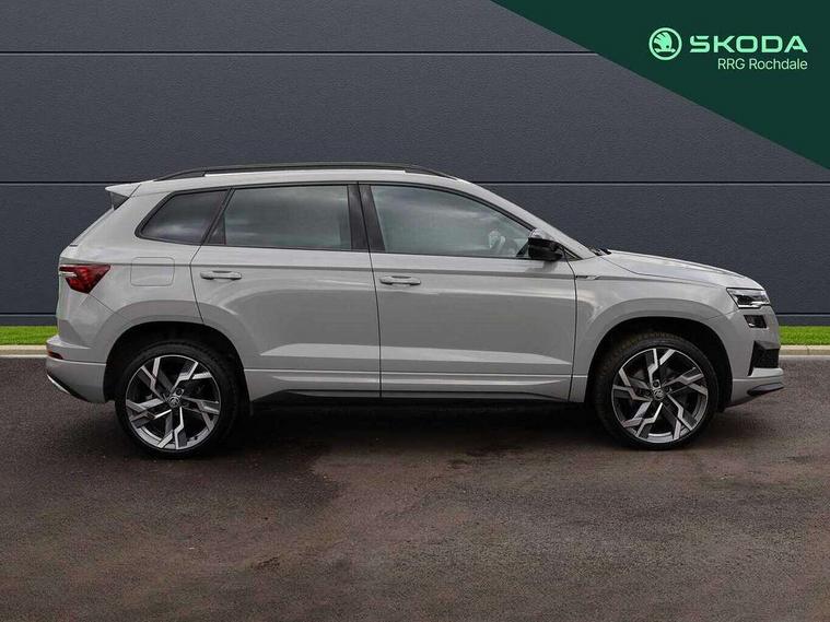 8" Digital display, Advanced driver attention and drowsiness monitor, Emergency services call system, Outside temperature gauge, Sensor for driver assistance systems, Service interval indicator, SmartLink wireless for Apple and wired for Android, Start/stop system with regenerative braking, USB C Port x 2 in front centre console, Virtual Cockpit - 10.25" digital display, Virtual pedal with electrically operated boot door, Wireless smartphone charging, Canton sound system, DAB radio with Bluetooth, USB connection, Acoustic glass, Aero front windscreen wipers with intermittent function, Auto dimming rear view mirror with light and rain sensors, Black door mirrors, Black electric window control buttons, Black radiator grille, Black roof rails, Body colour door handles, Electric front and rear windows with child proof lock, Front door steps with SportLine logo, Heated rear windscreen, LED 3rd brake light, LED daytime running lights, LED rear lights with high functionality welcome effect and dynamic indicators, Light assistant (coming/leaving home/tunnel light), Panoramic sliding sunroof, Plastic scuff plates in door apertures, Privacy glass, Protective door side sills in body colour, Rear diffuser, Rear side wing doors, Rear spoiler, Rear window wiper with washer system and intermittent control, Safety reflectors on front doors, Skoda lettering on tailgate in black, Sportline badge on front fender, Sportline decorative inserts with badging, Sports front and rear bumpers, 1.5 litre bottle holders in driver and front passenger door panels, 12V socket in boot, 12v socket in front centre armrest with storage compartment and rear air vents, 2 x Tablet holder, 3 rear height adjustable headrests, 3 seat bench in 2nd row, 3 spoke leather sports multifunction steering wheel and silver stitching with gear shift paddles, 4 foldable roof handles with rear coat hooks, Black floor carpet, Chrome inner door handles, Double sided boot floor, Foldable hooks in the boot, Front head restraints, Height adjustable front three point seats belts with tensioners, Height/reach adjust steering wheel, Ice scraper, Illuminated glovebox, Illuminated luggage compartment, Isofix child seat preparation for front passenger seat, Isofix child seat preparation outer rear, Manual lumbar support for front seats, Pen holder, Pollen filter, Rear boot cover, Rear reading lights, Rear seats fixed folding and divided 60:40, Rubbish bin door, Safety vest holder, Single front passenger seat, Storage box in upper central dashboard closed, Sunvisors with illuminated vanity mirrors, Textile floor mats, Ticket holder, Titan black interior ceiling, Umbrella under passenger seat, Under passenger seat storage compartment, Welcome animation with sportline logo, Light Pack - Karoq, Non Smokers pack, Automatic door unlocking in case of crash, Automatic fuel cut off in case of crash, Driver airbag, Electronic parking brake with auto hold function, Emergency rear braking signal, ESC including ABS, MSR, ASR, EDS, HBA, DSR, RBS, MKB and traction control, Front side airbags, Head airbags, Hill hold control, Knee airbags, Passenger airbag with switch-off function, Pedestrian monitor, Seatbelt reminder signalisation and pretensioner for all seats, Three point seatbelts rear, Two tone horn, Tyre pressure monitor, Alarm with interior monitoring, back up horn and tilt sensor with safe function, Electronic engine immobiliser, Keyless entry and start/stop, Remote central locking with 2 remote folding keys, Black air vent surround, Black centre console, carbon door decor, Satin black dashboard, Satin black door trim, 19" Sagittarius anthracite alloy wheels, Anti-theft wheel bolts protection, Breakdown and tool kit,