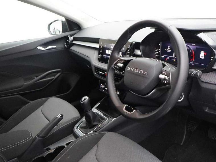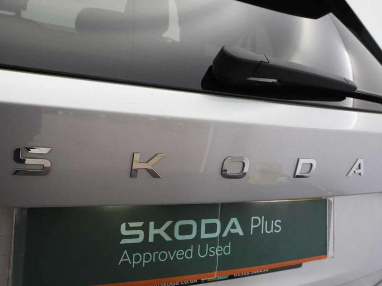 Advanced driver attention and drowsiness monitor, Bluetooth connection, Electromechanical power steering, Exterior temperature gauge, Service interval indicator, Traffic sign recognition, Virtual cockpit with 10.25" colour display, Wireless SmartLink for Apple CarPlay and Android Auto, 6 Speakers (4 in front and 2 in rear), Auxiliary socket for external MP3 player, DAB digital radio reception, Auto dimming rear view mirror, Body coloured bumpers, Door mirror integrated indicators, Front and rear electric windows, Front window wiper intermittent control, Headlight range control - Automatic, Ice scraper in fuel cap, LED 3rd brake light, LED daytime running lights with coming and leaving home feature, LED rear lights, Privacy glass, Rear LED fog light, Rear side wing doors, Rear window wiper with washing nozzles, Roof mounted spoiler, SKODA tailgate lettering in chrome, Unique dark chrome design logo on alloy wheels, 2 reading lights in front and 2 reading lights in rear, 3 rear headrests, Backrest split and folding, Central console with removable cup holder and storage box, Chrome handbrake release button, Dual zone air conditioning with climatronic electronic control, Fabric upholstery, Front centre armrest, Gearshift knob/handle in leather, Grain satin black interior door handles, Hand brake lever handle in leather, Height adjustable front headrests, Height adjustable front seats, Height adjustable steering wheel, ISOFIX and TopTether anchorage points to the outer rear seats, ISOFIX and TopTether on the front passenger seat, Luggage compartment lighting, Manually adjustable lumbar support in front seats, Pollen filter, Rear seat bench unsplit, Single front passenger seat, Skoda lettering on steering wheel, Storm grey headlining, Sun visors with mirror and airbag label on passenger side, Textile floor mats, Ticket holder, Umbrella in drivers door, 3-point height adjustable front seats belts with pretensioner and force limiter, Automatic warning lights in case of crash, Driver and passengers airbag with switch off function, e-Call+, ESC including ABS, MSR, ASR, EDS, HBA and XDS, Front and rear seat belt warning, FRONT ASSIST (AEB City and AEB Inter Urban), Front side airbags, Head airbags, One tone horn, Pedestrian protection, Three rear 3-points safety seat belts with pretensioner and force limiter including stop function for outer rear seat belts, Tyre pressure monitoring system, Anti-theft alarm system including immobiliser, interior monitoring, backup horn, and towing protection, Central locking with radio remote control, interior controls, SAFE function and 2 foldable keys, Black painted air vents, Grain satin black central console cover, Metallic grey upper decorative trim, Satin black door and side trim panel in front, Textile Kota grey lower decorative inserts, Anti-theft wheel bolts protection, Super-low rolling resistance tyres,