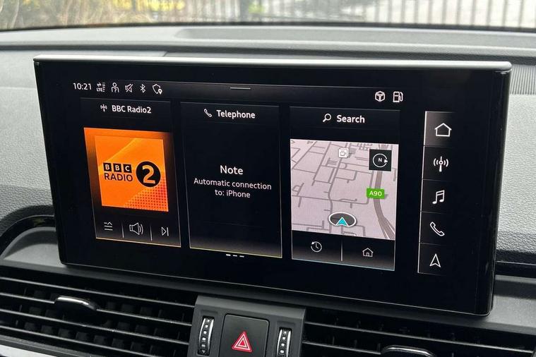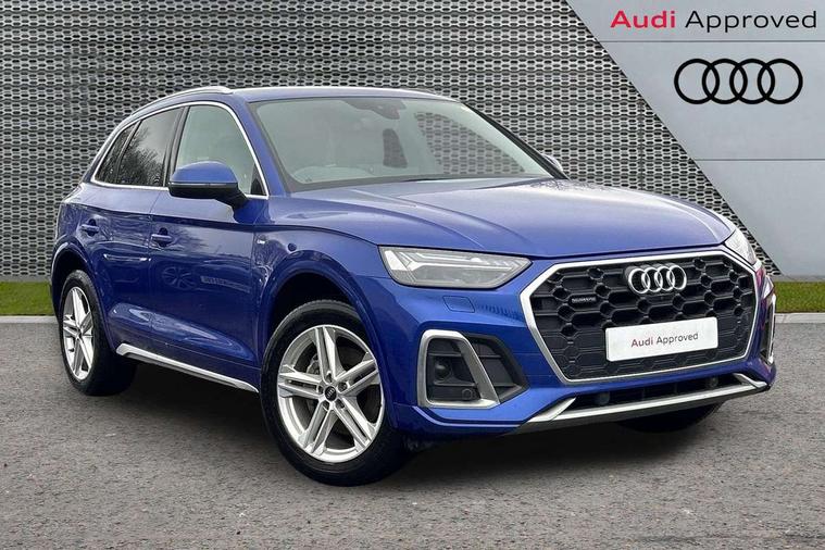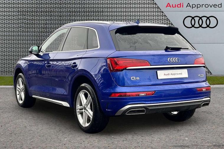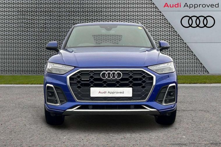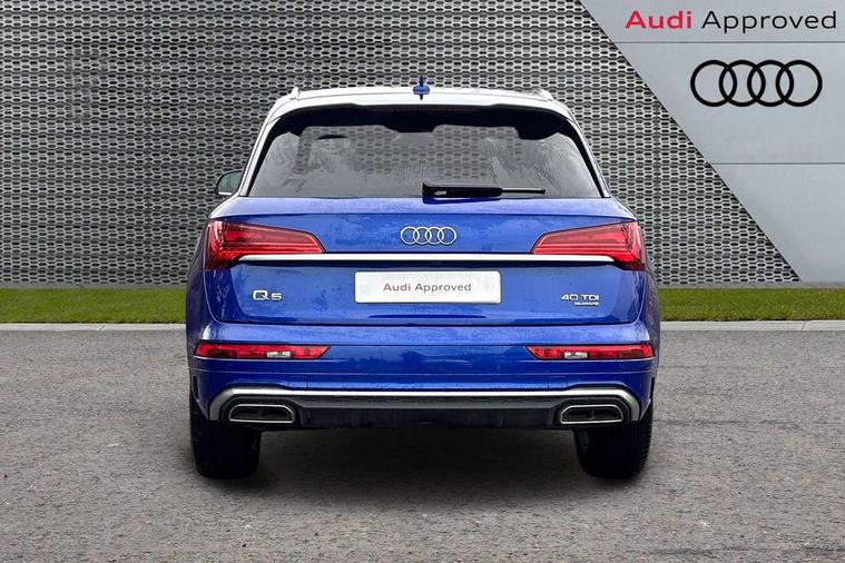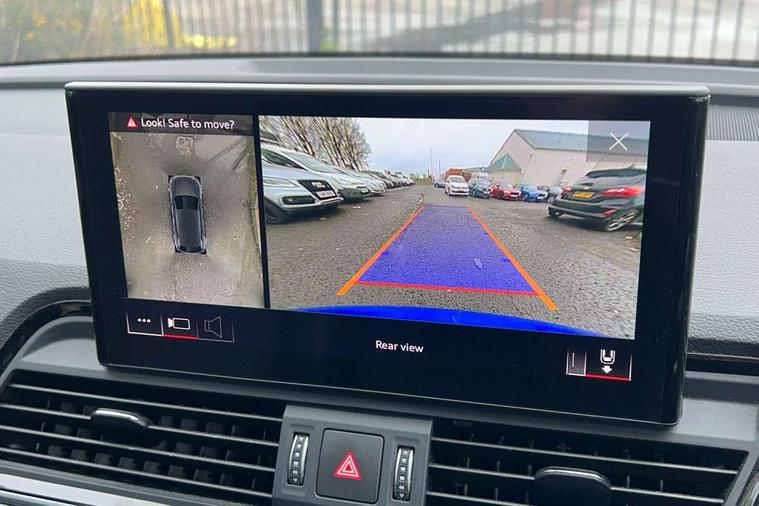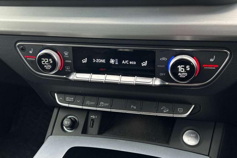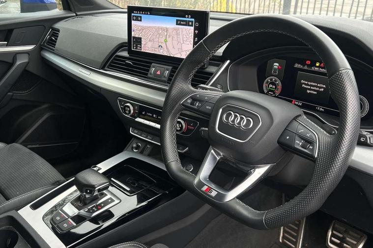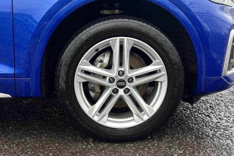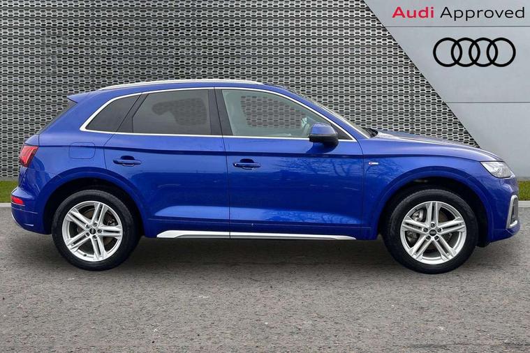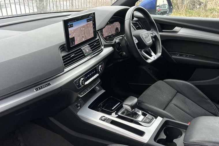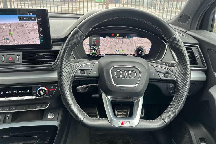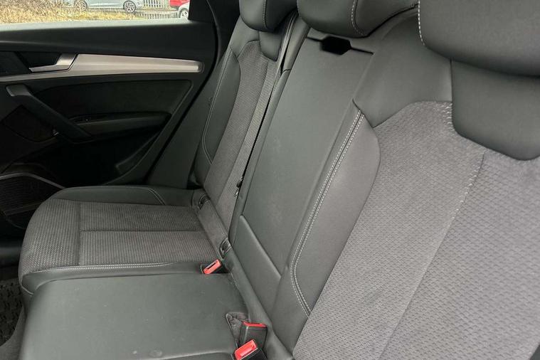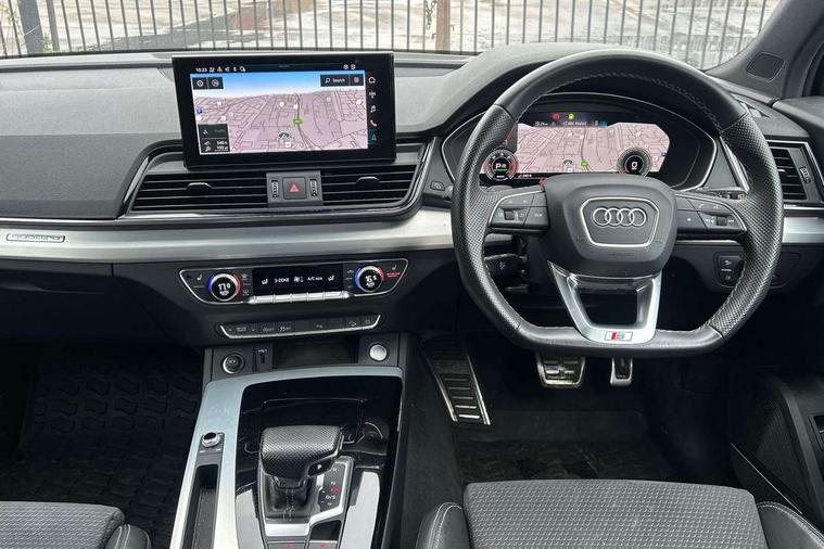 Acoustic front and rear parking sensor, Audi connect safety and service (e-call), Audi connect with Amazon Alexa Integration, Audi drive select, Audi virtual cockpit plus with 12.3" screen and three different layout designs, Audi wireless smartphone interface, Automatic start-stop system with coasting functionality and efficiency programme, Bluetooth interface, Electro - mechanical power assisted steering, MMI navigation plus with 10.1" touch screen, Power tailgate, Reversing camera, Service interval indicator, Voice control system with Audi hotword activation "Hey Audi", Diesel particulate filter, Quattro on demand, S line sports suspension, 2 x USB charging port with aux input socket, 8 loudspeakers, DAB Digital radio, Acoustic windscreen, Aluminium roof rails, Audi matrix LED headlights with dynamic front and rear indicators, Auto dimming door mirrors, Auto dimming frameless rear view mirror, Automatic headlight adjustment, Automatic headlights and windscreen wipers, Body colour bumpers, Body colour door mirrors, Body colour rear diffuser with matt aluminium silver surrounds, Body colour underbody protection, Chrome plated exhaust trims, Daytime running lights, Door sills in Selenite silver, Electric adjustable/heated/folding door mirrors, Front air inlet surrounds in aluminium, Front and rear electric windows, Front radiator grille in honeycomb design, Headlight washers, High level LED brake light, Lower bumpers painted in contrast Manhattan grey, Rear chrome trim strip below lights, Rear privacy glass and rear side windows, Rear side wing doors, Rear wiper, Roof bars, S Line badges on the front wings, S Line front and rear bumpers, S Line rear spoiler, S Line side skirts, 3 rear headrests, 3 spoke leather multifunction steering wheel with S badging perforated leather grips, 40:20:40 split folding 3 rear bench seat in 2nd row with rear centre armrest, Black cloth headlining, Comfort front centre armrest, Contrast stitching on seats, steering wheel and gear lever gaiter, Deluxe 3 zone electronic climate control, Front/rear floor mats, Gear lever in black leather, Heated front seats, Height adjustable front head restraints, Height/reach adjustable steering column, Illuminated door sill trims with S logo, Luggage compartment cover, Manual seat adjustment with 4-way electric lumbar support, Removable luggage compartment floor, Single front passenger seat, Stainless steel pedals, Sunvisors with vanity mirrors, High gloss pack - Q5, LED interior light pack - Q5, 3 point seatbelts on all seats, 6 airbags - Driver, front passenger, curtain and side airbags, Electrically operated child locks on rear doors, Electromechanical parking brake, Electronic stabilisation control including ABS, ASR and EDL, First aid kit with warning triangle and vests, Front passenger airbag deactivation, Hill descent control, Hill hold assist, ISOFIX child seat mounting for front passenger seat and ISOFIX child seat mounting with Top Tether for outer rear seats, Multi collision brake assist, Pop-up bonnet for pedestrian protection, Pre sense city, Seat belt force limiter, Seatbelt monitoring, Tyre pressure warning, Anti theft alarm, Anti-theft wheel bolts, Keyless Go access/ignition system, Remote central locking, Air vents inserts and centre console in gloss black, Matt brushed aluminium inlays,