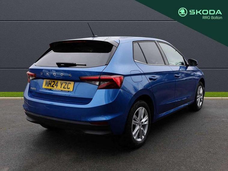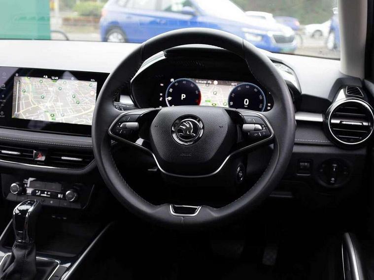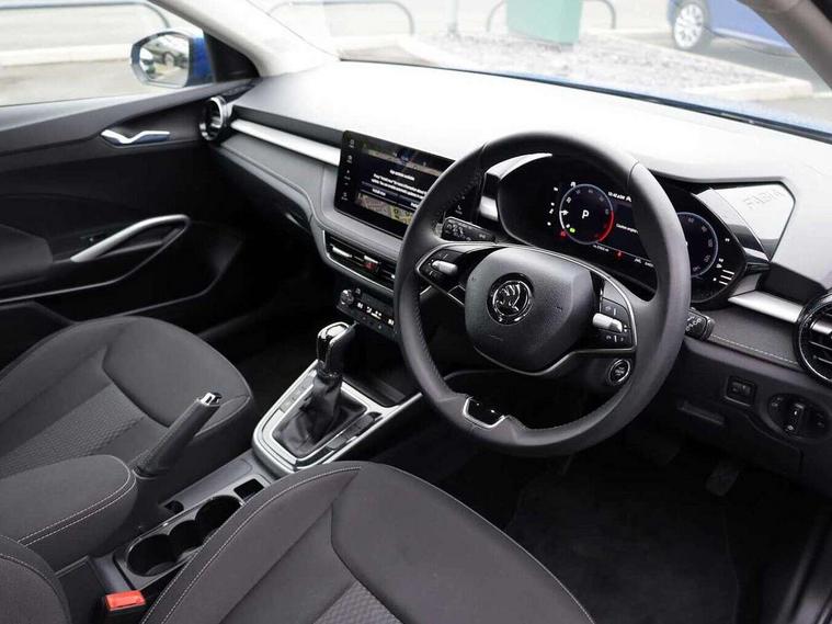 Advanced driver attention and drowsiness monitor, Bluetooth connection, Electromechanical power steering, Exterior temperature gauge, Service interval indicator, Traffic sign recognition, Virtual cockpit with 10.25" colour display, Wireless SmartLink for Apple CarPlay and Android Auto, 6 Speakers (4 in front and 2 in rear), 9.2" colour display skoda navigation system with voice control and web radio, Auxiliary socket for external MP3 player, DAB digital radio reception, Auto dimming rear view mirror, Body colour door mirrors, Body coloured bumpers, Chrome window surround, Door mirror integrated indicators, Front and rear electric windows, Front window wiper intermittent control, Headlight range control - Automatic, Ice scraper in fuel cap, LED daytime running lights with coming and leaving home feature, LED rear lights, Privacy glass, Rear LED fog light, Rear side wing doors, Rear window wiper with washing nozzles, Roof mounted spoiler, SKODA tailgate lettering in chrome, Third brake light, 2 reading lights in front and 2 reading lights in rear, 3 rear headrests, Backrest split and folding, Central console with removable cup holder and storage box, Chrome handbrake release button, Comfort seats, Door sills with fabia badging, Dual zone air conditioning with climatronic electronic control, Fabric upholstery, Front centre armrest, Gearshift knob/handle in leather, Hand brake lever handle in leather, Height adjustable front headrests, Height adjustable front seats, Height adjustable steering wheel, ISOFIX and TopTether anchorage points to the outer rear seats, ISOFIX and TopTether on the front passenger seat, Luggage compartment lighting, Manually adjustable lumbar support in front seats, Metallic grey interior door handles, Pollen filter, Rear seat bench unsplit, Single front passenger seat, Storm grey headlining, Sun visors with mirror and airbag label on passenger side, Textile floor mats, Ticket holder, Umbrella in drivers door, 3-point height adjustable front seats belts with pretensioner and force limiter, Automatic warning lights in case of crash, Driver and passengers airbag with switch off function, e-Call+, ESC including ABS, MSR, ASR, EDS, HBA and XDS, Front and rear seat belt warning, FRONT ASSIST (AEB City and AEB Inter Urban), Front side airbags, Head airbags, Hill hold control, One tone horn, Pedestrian protection, Three rear 3-points safety seat belts with pretensioner and force limiter including stop function for outer rear seat belts, Tyre pressure monitoring system, Anti-theft alarm system including immobiliser, interior monitoring, backup horn, and towing protection, Central locking with radio remote control, interior controls, SAFE function and 2 foldable keys, Chrome edged air vents, Metallic grey central console cover, Metallic grey upper decorative trim, Satin black door and side trim panel in front, Textile microsuede grey lower decorative trim with art grey stitching, Anti-theft wheel bolts protection, Super-low rolling resistance tyres,