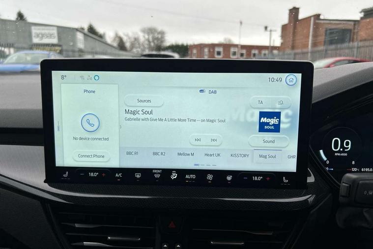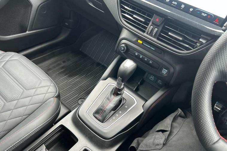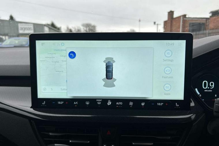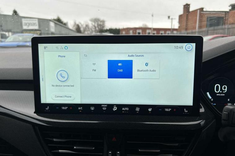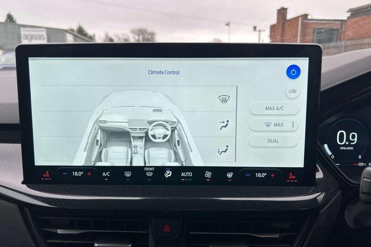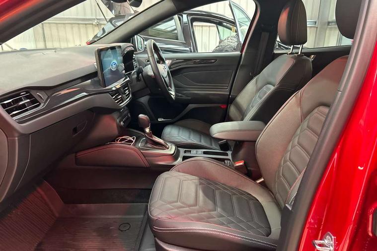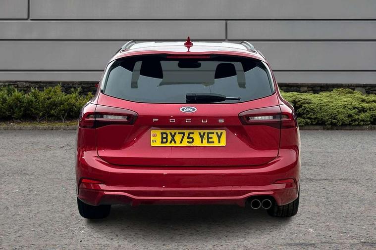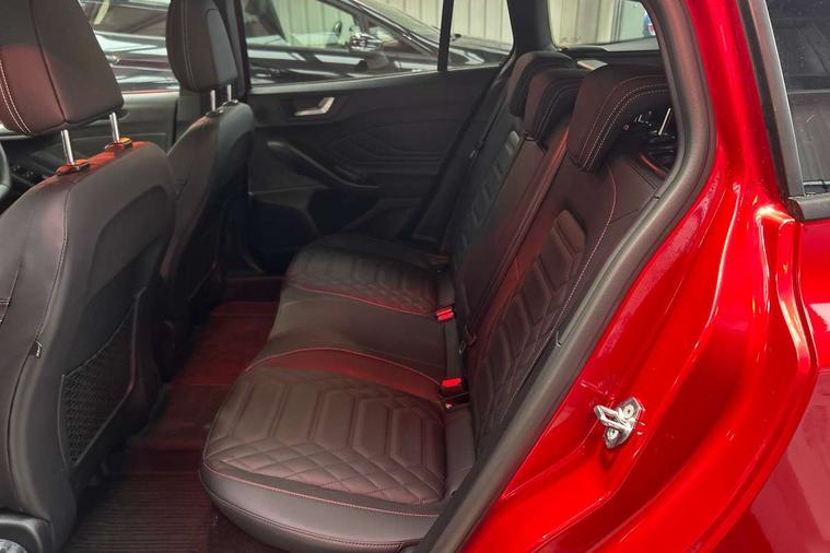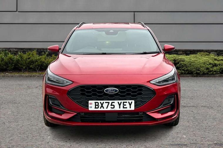 12.3" Digital instrument cluster, Bluetooth system, Digital clock, Easy fuel capless refuelling system, Eco mode, Ford SYNC4 Nav with 13.2'' touchscreen, DAB, Emergency Assistance, Apple Carplay & Android Auto, B&O Premium Audio with 10 speakers, FordPass Connect, Lane keeping system - lane keeping alert and lane keeping aid, PAS, Rev counter, Selectable drive mode, Service interval indicator, Trip computer, Wireless charging pad, Sports tuned suspension, 2 USB ports, Auto headlamps (on/off), Body coloured door handles, Electrically operated front and rear windows with one touch opening and closing, Electrically operated heated power fold door mirrors with puddle lamp with side indicators, Front variable intermittent wipers with electric wash, Heated rear window, LED daytime running lamp, LED rear lamps, LED third brake light, Polished twin tailpipe, Privacy glass, Quickclear heated windscreen, Rain sensor, Rear side wing doors, Tailgate wash/wipe, Unique ST-Line grille, full bodystyling kit, and large body coloured rear roof spoiler, 3 rear headrests, 3 seat bench in 2nd row, Dual zone electronic air temperature control, Full sensico premium upholstery, Height adjustable front headrests, Isofix child seat preparation, Load through ski hatch, Manual 2-way passenger seat adjust, Power 4-way driver seat adjust, with power lumbar adjust, Reach + rake adjustable steering column, Single front passenger seat, ST-Line Design pack - Focus, Winter pack - Focus, 3x3 point rear seatbelts, ABS+Electronic Brake force Distribution, Auto hold function, Driver airbag, EDL traction control, Electronic parking brake, Electronic stability control, Front and rear seatbelt reminder, Front inertia reel height adjustable seatbelts with pre-tensioners, Front passenger airbag, Front side airbags, Passenger airbag deactivate switch, Post collision braking, Pre collision assist with autonomous emergency braking and pedestrian/cyclist detection, Remote/power child rear door locks, Side curtain airbags, Three rear inertia reel lap/diagonal seatbelts, Tyre pressure monitoring system, Keyless entry and keyless start, MyKey system, Remote central locking & engine immobiliser, Thatcham alarm with power door dead locks, 18" 5x3 spoke pearl grey high gloss machined finish alloy wheels with mini spare wheel,