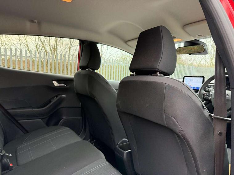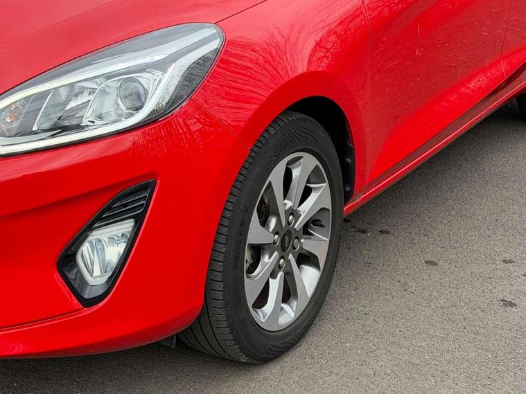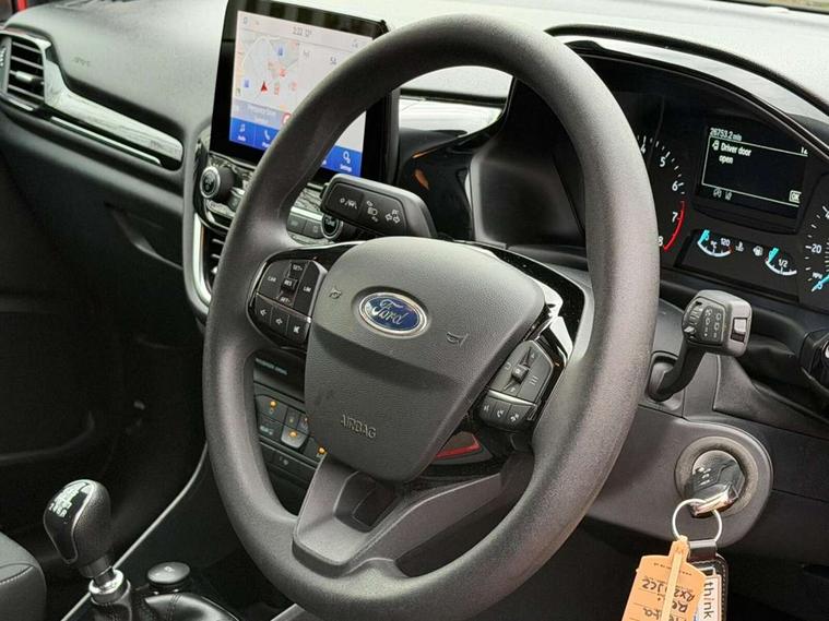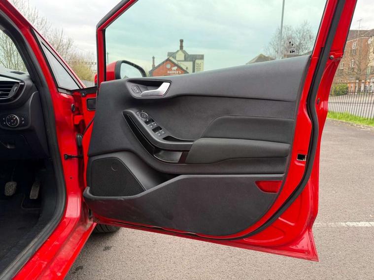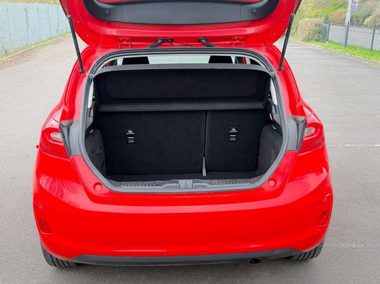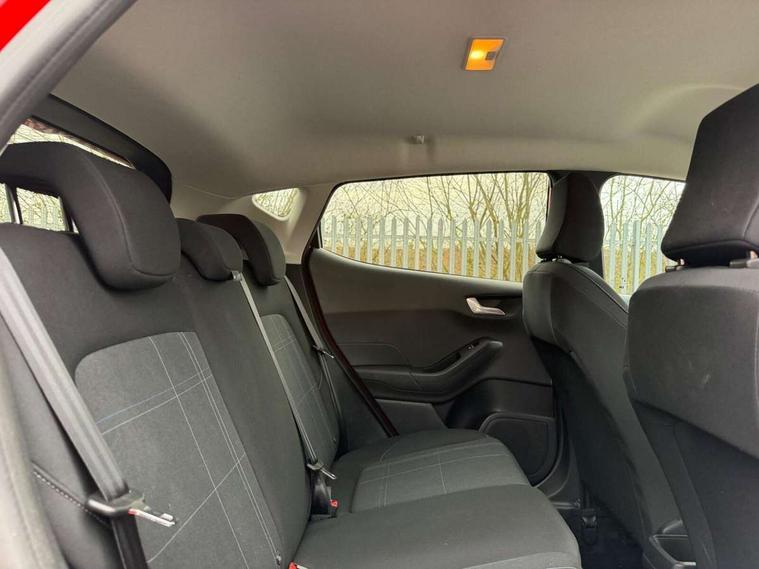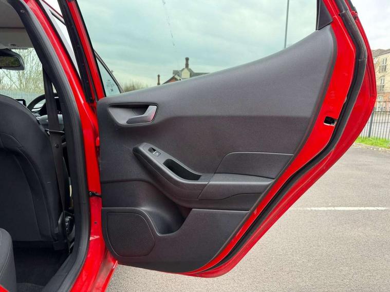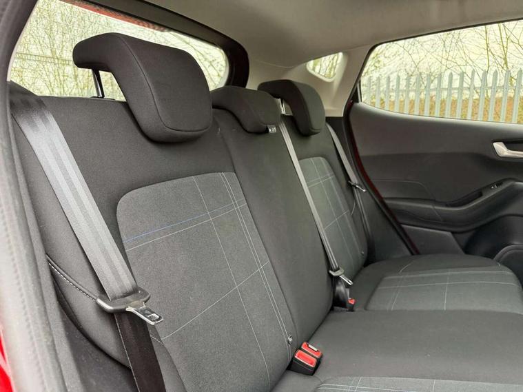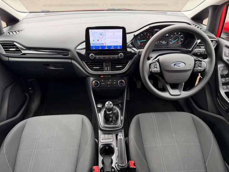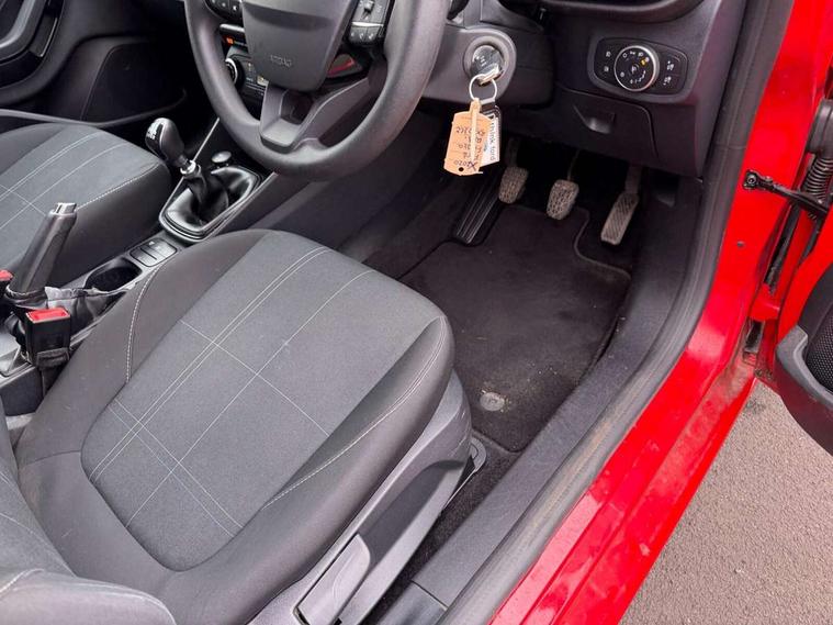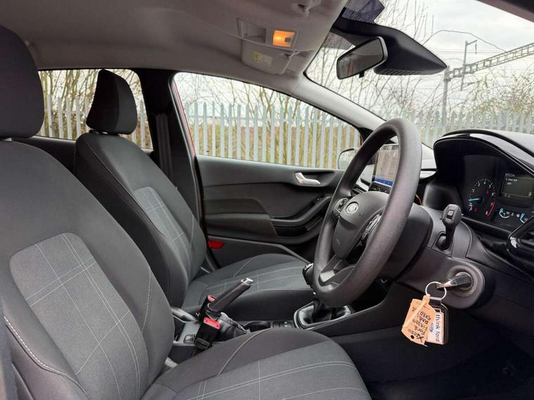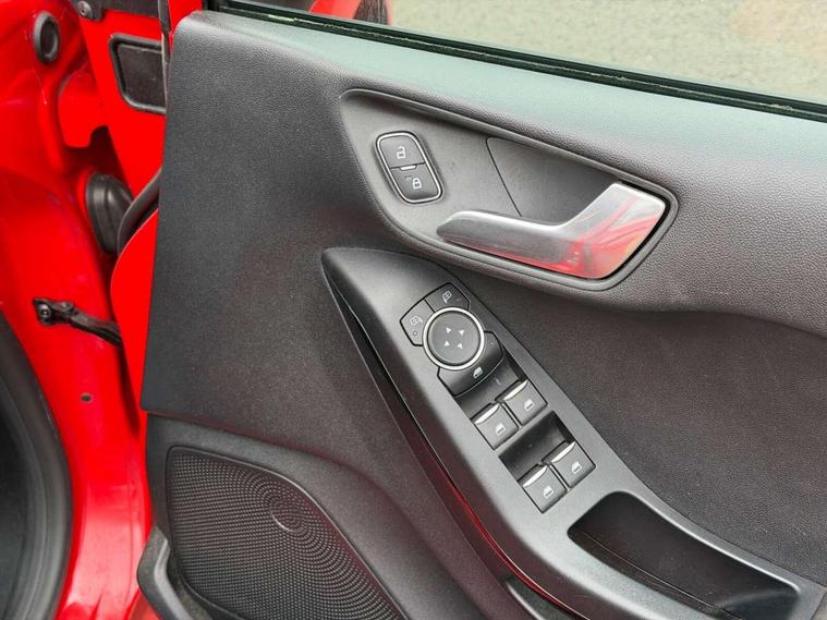 Bluetooth system, Drive mode selector, Electric power steering, Ford easy fuel, Trip computer, 2 USB ports, Auxiliary input socket, DAB Digital radio, Steering wheel mounted controls, Body colour bumpers, Body colour door handles, Body colour rear spoiler, Chrome beltline trim, Cornering front fog lights, Electric front windows/one touch facility, Electric rear windows, LED projector low beam headlamps with LED daytime running lights, Mesh design front grille with chrome surround, Quickclear heated windscreen, Rear privacy glass, Rear wiper, 12V Accessory socket in centre console, 60/40 split folding rear seat, Adjustable head restraints, Ambient lighting, Boot carpet, Chrome inner door handles, Cloth upholstery, Footwell illumination, Front floor mats, Front map reading lights, Front seat and rear pockets, Height adjustable driver's seat, Illuminated glovebox, Leather gear knob, Load area light, Luxury woven headliner, Manual air conditioning, Overhead console with sunglasses holder, Pollen filter, Rake/reach adjustable steering wheel, NCAP Pack - Fiesta, 3 point seatbelts on all rear seats, ABS+EBA, Curtain airbags, Driver and passenger airbags, Drivers knee airbag, Electronic stability control with hill start assist, Front passenger airbag deactivation, Front side airbags, Tyre pressure monitoring system, MyKey system, Remote central locking & engine immobiliser, Thatcham Cat.1 alarm, 16" 8 spoke alloy wheels with rock metallic machined finish,