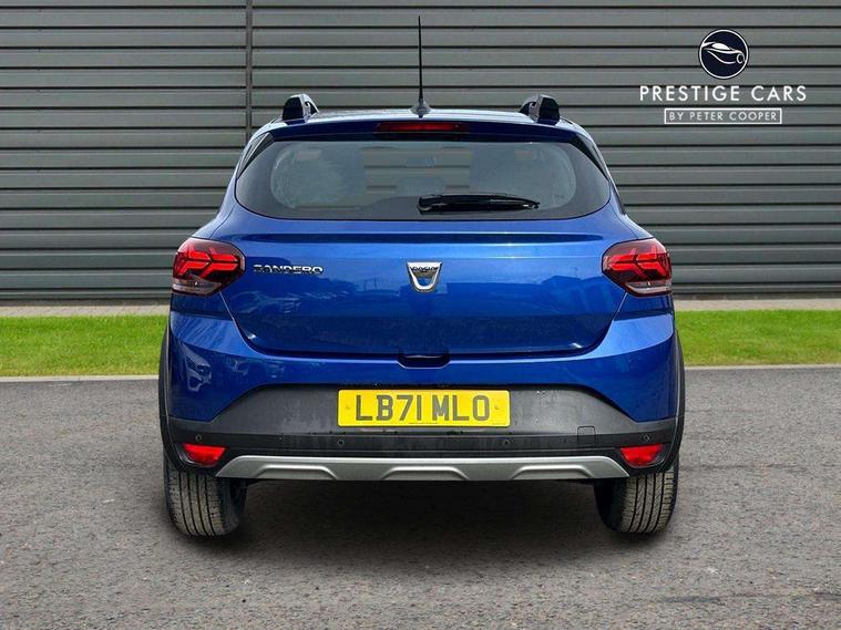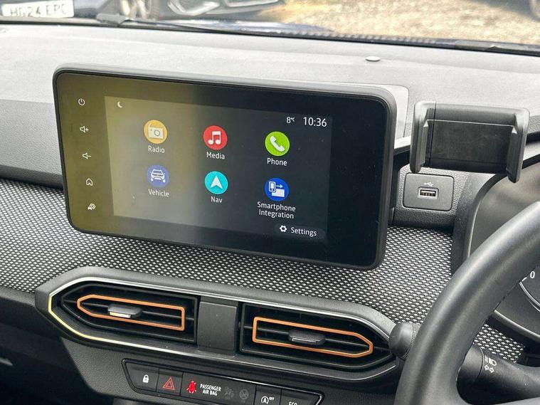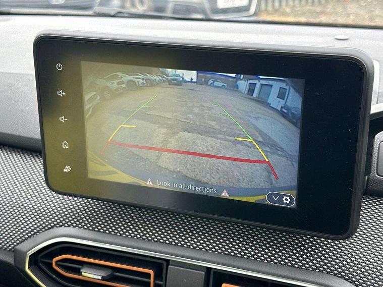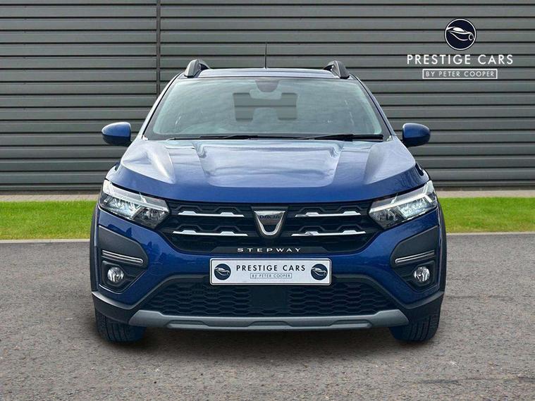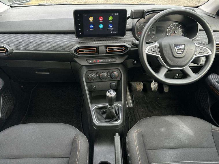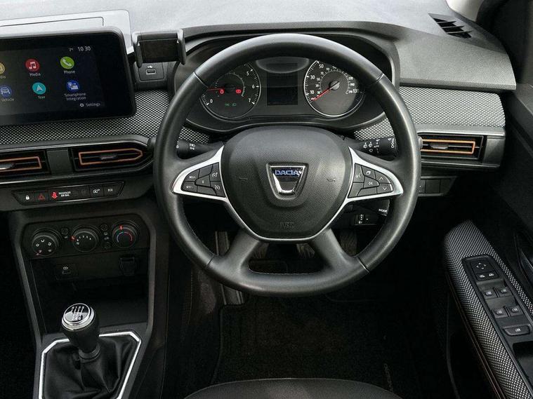 3.5" TFT instrument panel with on-board computer, Cruise control with speed limiter, eCall emergency call system, Eco mode, Electric power assisted steering, Rear parking sensors, Rev counter, Reversing camera, Stop/start system, 8" Media display - DAB radio, smartphone replication, bluetooth, 4 speakers, Apple CarPlay and Android Auto, USB connection for data transfer and charging, USB socket, 3 speed windscreen wipers, Auto lighting, Automatic wipers, Body colour door handles, Body colour door mirrors, Body coloured bumpers, Chrome longitudinal roof bars, Chrome radiator grille, Electrically adjustable and heated door mirrors, Front fog lights, Heated rear window, High level third brake light, LED automatic daytime running lights, LED Y-shape Dacia signature lighting, Modular roof bars, One touch electric front windows, Rear electric windows, Rear wash/wipe, Stepway inscription on radiator grille and roof bars, Tinted windows, 1/3 to 2/3 split folding rear seats, 12 volt front socket, 12 volt rear socket, 3 height adjustable rear headrests, Driver + passenger vanity mirrors, Fabric upholstery, Fixed smartphone holder on dashboard, Front armrest, Gear shift indicator, Height adjustable driver seat, Height adjustable front headrests, Height/depth adjustable steering wheel, Isofix points for child seats in both outer rear seats, Manual air conditioning, Satin chrome interior door handles, Satin Chrome/Copper orange air vents, Soft feel steering wheel, Steering wheel controls, 3x3 point rear seatbelts, ABS and Emergency brake assist, Automatic emergency braking system, Child locks on rear doors, Door open warning, Driver airbag, ESC (Electronic Stability Control), ESP + Hill Start Assist, Front curtain airbags, Front seatbelt pretensioners, Front side airbags, Height adjustable front seatbelts, Passenger airbag, Seatbelt reminder for driver and front passenger, Tyre pressure monitor, Automatic central locking, Immobiliser, Keyless entry, Remote central locking, Decopart on instrument panel and door with textile, 16" Flex wheels with full wheel cap,