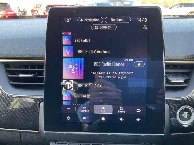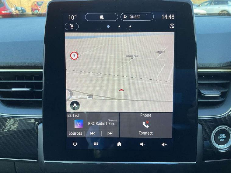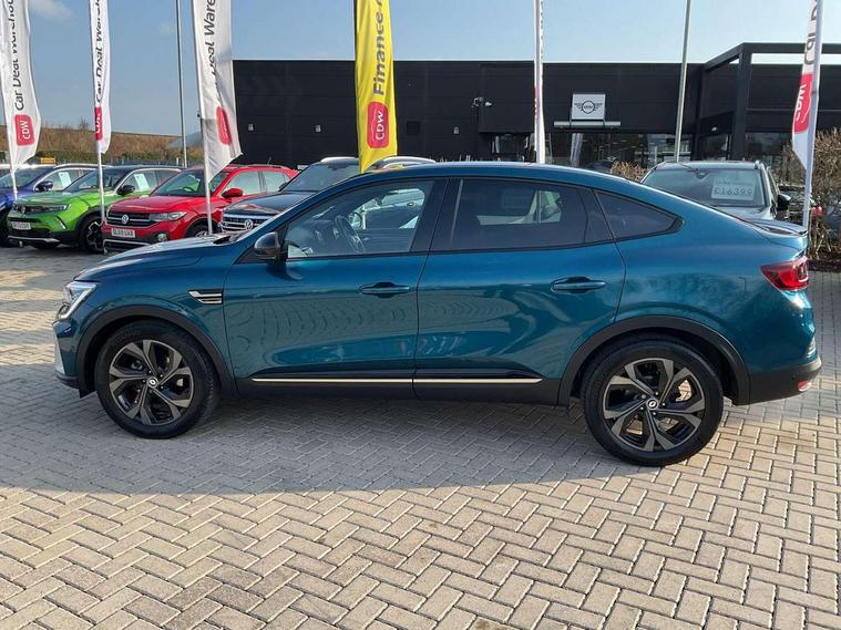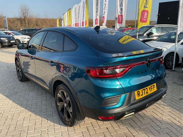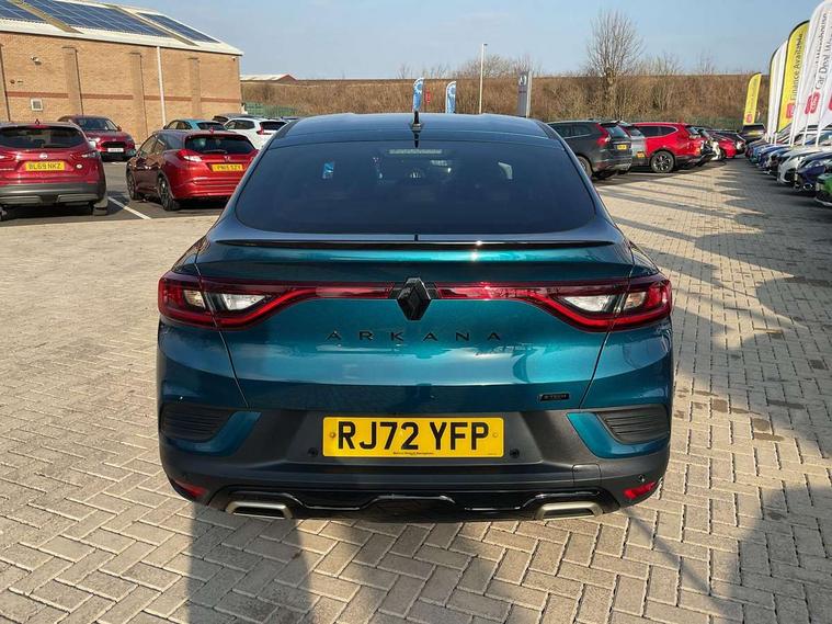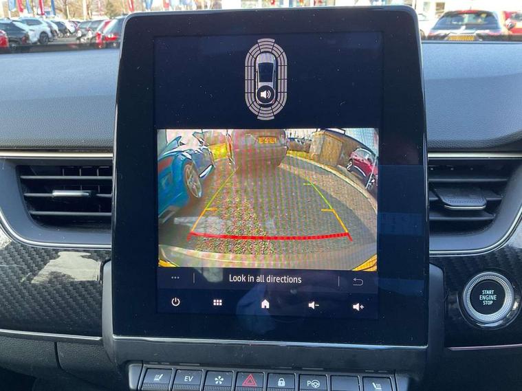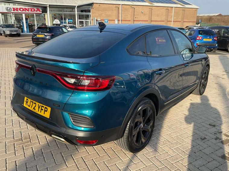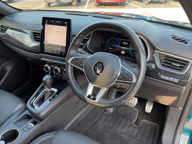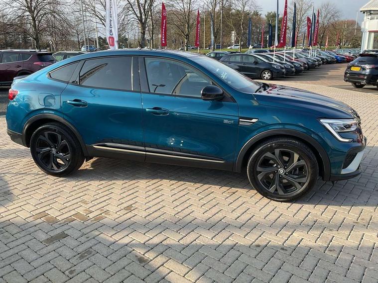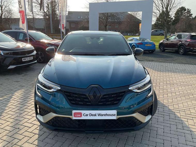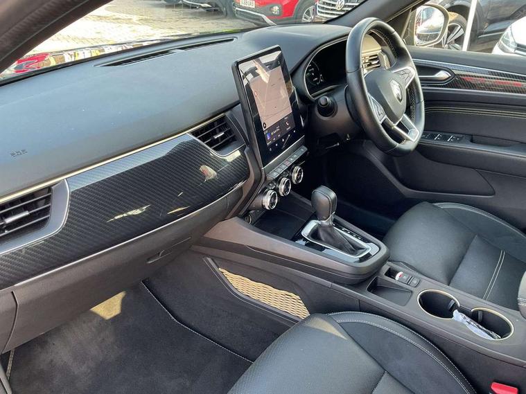 10" TFT Driver information display, Adaptive cruise control and speed limiter, Blind spot warning, Bluetooth system, EASY LINK 9.3" portrait touchscreen with navigation, Google search and traffic information, Eco mode, EV button to activate pure mode, Front and rear parking sensors, Gear change indicator, Lane departure warning, Lane keep assist, Multi-sense - 3 driving modes and 8 ambient lighting, Rear cross traffic alert, Rear view camera, Renault automatic emergency assist, Smartphone integration compatible with Apple CarPlay and Android Auto, Traffic sign recognition with over speed prevention, Trip computer, Variable assistance electric power steering, Wireless phone charger, Arkamys classic sound system with 6 speakers, DAB radio, USB port, 3rd brake light, Auto dimming rear view mirror, Automatic full LED headlights, Automatic headlights, Automatic high / low beam, Automatic windscreen wipers with rain sensor, Black door mirrors, Black side door protection with gun metal insert, Body colour rear boot spoiler, Body coloured bumpers, C-shaped LED front signature lighting (333 high), Double chromed exhaust tailpipes elements, E-TECH Engineered front and rear skid plates, E-TECH Engineered front bumper with warm titanium blade, Exterior chrome enhancement, Extra tinted rear windows and tailgate, Frameless rear view mirror, Front and rear electric windows, Front driver window with one touch facility and anti-pinch function, Front grille with chrome on upper part, Heated rear window, Rear windscreen wiper, Shiny black shark fin antenna, 3 seat bench in 2nd row, 60:40 split and fixed base rear seats, Aluminium pedals, Automatic climate control with combined filter, humidity sensor and AQS, Black interior roof lining, Carbon style dashboard, Central console with storage, E-TECH Engineered leather steering wheel, E-TECH Engineered suede-leather upholstery with gold stitching, Front and rear head restraints, Heated front seats, Heated steering wheel, Height and reach adjustable steering wheel, ISOFIX child seat fixing points on rear outermost seats, LED front and rear roof lights, Power adjustable driver and passenger seat with lumbar adjustable drivers seat, Rear air vents, Single front passenger seat, Variable boot floor, Parking Pack - Hands-free parking & flank protection - Arkana, 3x3 point rear seat belts, ABS+EBA, Active emergency braking system, B Brake Mode - One pedal driving with increased regenerative braking, Distance warning alert, Driver airbag, Driver and passenger front and side airbag deactivation, Driver and passenger side airbags, Driver height adjustable seat belt, Electronic parking brake with auto hold, ESC (Electronic Stability Control), Front and rear no seatbelt warning sound, Front curtain airbags, Front head airbags, Hill start assist, Passenger airbag, Sound for pedestrian (1 to 30 kph), Tyre pressure warning light, Anti drill door locks and locking fuel cap, Central door locking, Deadlocking system, Hands free keycard with Keyless access and start, RAID (Renault Anti-Intruder Device) automatic door locking, Rear side wing door and window child locking function (front driver door control panel), Thatcham alarm, 18" diamond cut E-Tech engineered alloy wheels,