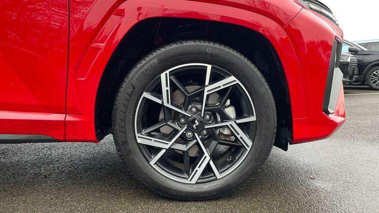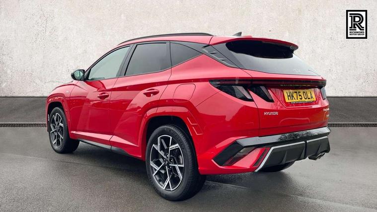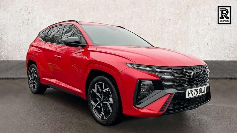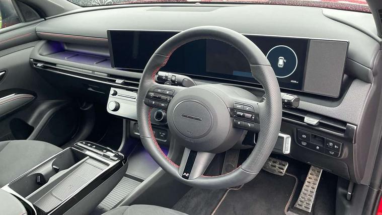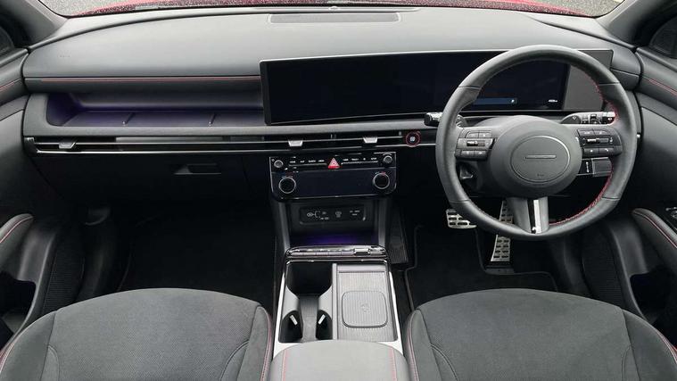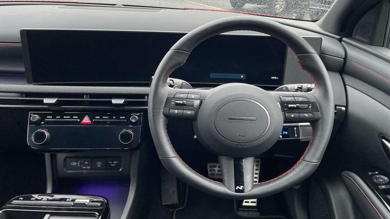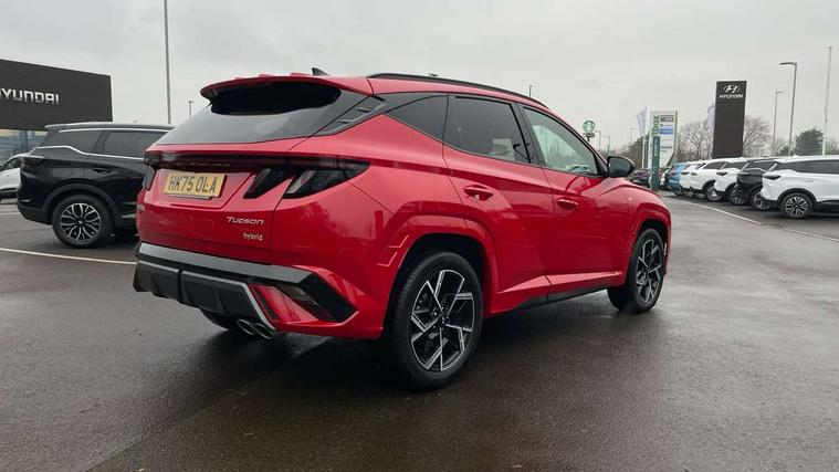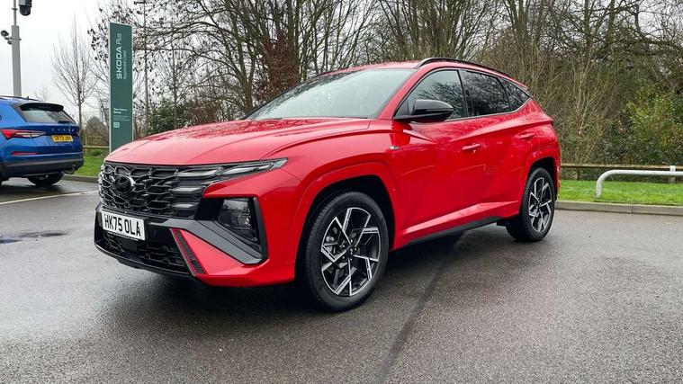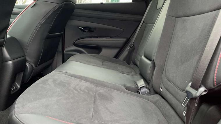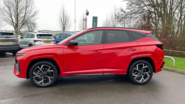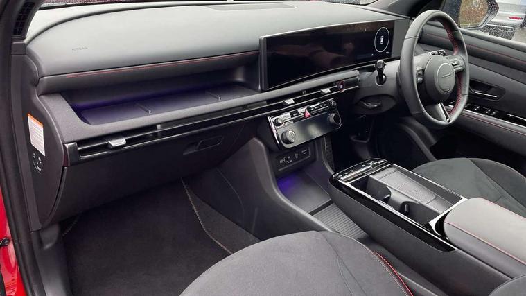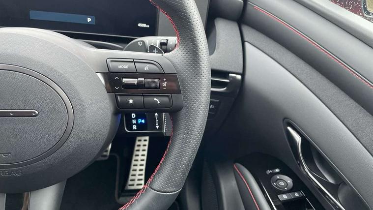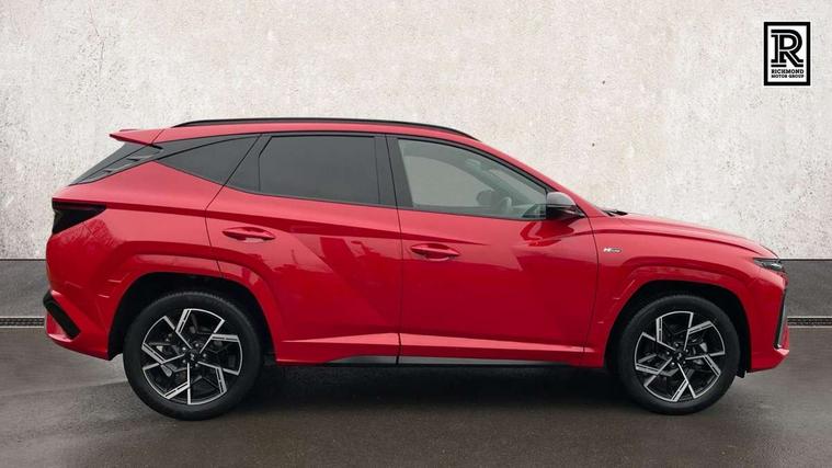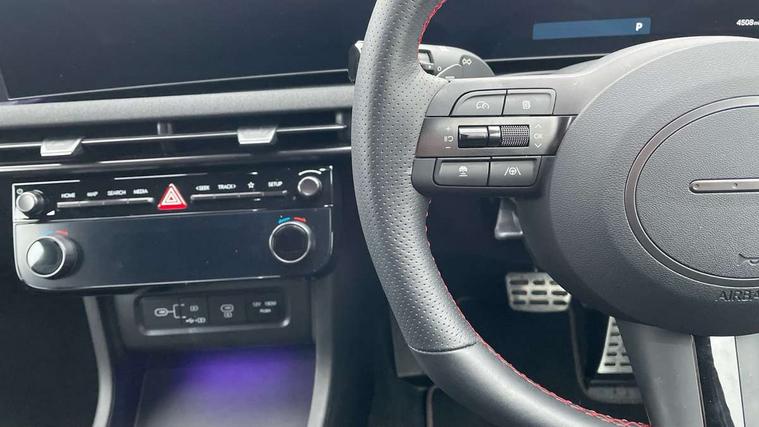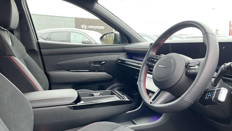 12.3" LCD display with driver's supervision instrument cluster, 12.3" widescreen navigation with bluelink and mapcare/Google POI, Bluetooth system, Cruise control - smart adaptive speed control with stop and go function, Digital clock, Drive mode selector, Driver attention warning, E-call, Emergency stop signalling system, Forward Collision Avoidance Assist (FCA) - Car, Pedestrian and Cycle, Forward Collision Avoidance Assist Junction Turning (FCAJX), Front and rear parking sensors, Highway Driving Assist (HDA), Hyundai road side assistance, Intelligent speed limit assist III, Lane follow assist, Lane keep assist, Over the air updates(OTA), PAS, Rear camera and guidance parking system, Rev counter, Smart power tailgate, Tailgate open warning light, Trip computer, Trip odometer, Updated TMED II, Voice recognition, Water temperature gauge, Windscreen washer fluid sensor and warning indicator, Wireless Apple CarPlay/Android Auto, Wireless phone charging pad, 2 front and 2 rear speakers with 2 tweeters, 2 front and 2 rear USB-C ports, DAB Digital radio, Steering wheel mounted audio/phone controls, Adjustable intermittent front windscreen wipers with aero wiper blade, Auto dimming electrochrome rear view mirror, Automatic defog system, Automatic headlights with dusk sensor, Automatic windscreen wipers with rain sensor, Body colour bumpers, Body colour door mirrors with integrated indicators, Body colour exterior door handles, Body coloured wheel arches, Electrically adjustable, heated and power folding door mirrors, Follow me home headlights, Front and rear electric windows with anti-trap mechanism and one touch control, Front fog lights, Glossy black bumper mouldings, LED 3rd brake light, LED daytime running lights, LED Headlights, LED rear lights, Positioning Lights - LED, Privacy glass - Rear windows and tailgate, Rear side wing doors, Rear wash/wipe with intermittent wipe setting, Roof rails, Soft touch rear door paneling, Tinted glass with windscreen shade band, Trailer stability assist, 12V power outlets in front console and luggage compartment, 3 seat bench in 2nd row, 40/20/40 split folding rear seat, 64 colours interior ambient lighting, Adjustable head restraints (Up and down), Cupholders in rear armrest, Door courtesy lights, Driver and passenger sunvisors with illuminated LED vanity mirrors, Driver's seat manual height adjust, Dual zone climate control, Front and rear door pockets, Front armrest with storage box, Front centre console and door bottle holders, Heated front seats, Heated steering wheel, Height/reach adjustable steering column, Illuminated/air conditioned glove compartment, ISOFIX child seat anchorage points attached on outer rear seats, Leather wrapped steering wheel and gear knob, Leather/faux textile suede upholstery, LED interior lighting, Luggage compartment lighting, Luggage cover, Luggage hooks, Luggage net, Manual height adjustable front passenger seat, Map and reading lights, Metal pedals, Rear seat remote folding function, Rear side window sunblind, Reclining rear seats, Retractable load cover, Single front passenger seat, Sunglasses holder, Touch sensitive climate controls with temperature dials, TUCSON branded metal door scuff plate, Underfloor boot compartment, N Line design package - Tucson, N Line interior design package - Tucson, Trailer wiring package - Tucson, 3x3 point rear seatbelts, Active bonnet, Airbag - Front, front side, curtain and centre front airbags, Anti-lock brake system (ABS), Brake assist function, Childproof rear door locks, Curtain airbag roll over sensor, Downhill brake control, Electric parking brake, Electronic stability control, Front and rear seatbelt reminder, Front passenger airbag deactivation switch, Front seatbelt pretensioners, Hill start assist control (HAC), Multi-Collision braking, Outer rear seatbelt height adjustment, Seatbelt height adjustment for front seats, Traction control, Tyre pressure monitoring system with individual tyre pressure display - TPMS, Vehicle stability management, Deadlocks, Immobiliser, Locking wheel nuts, Remote control central locking, Smart key with keyless entry and engine start/stop button, Speed sensitive auto door locking, Thatcham category 1 alarm, 19" Alloy wheels, Tyre repair kit,