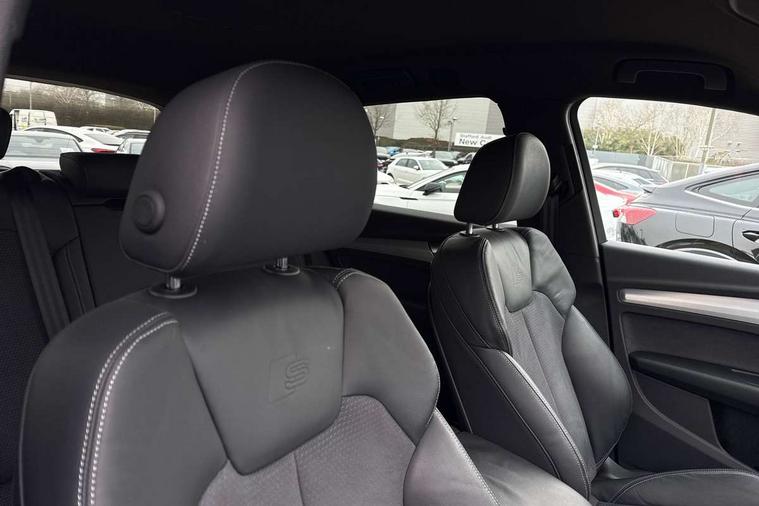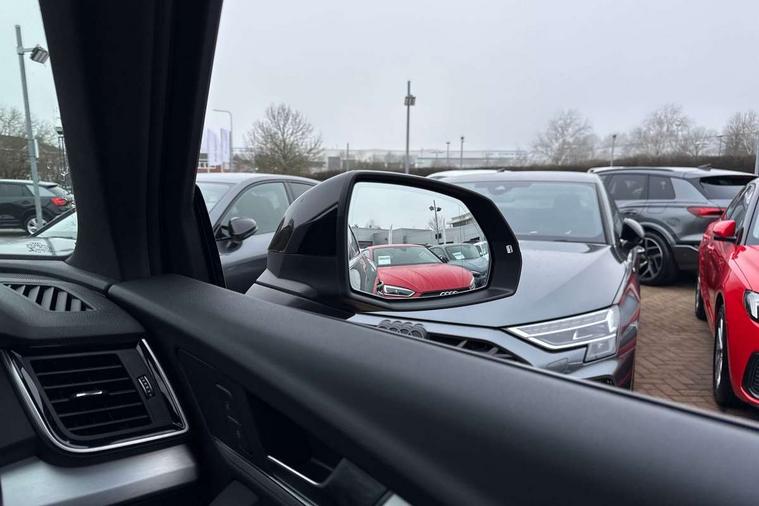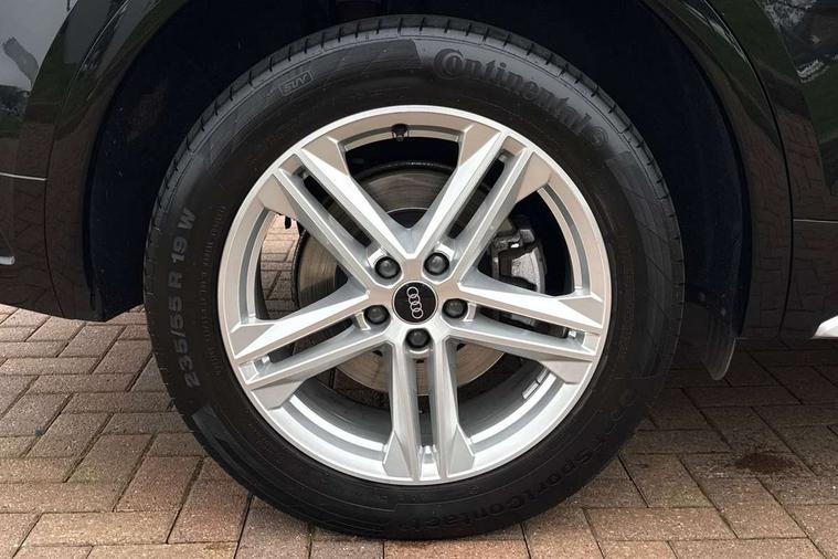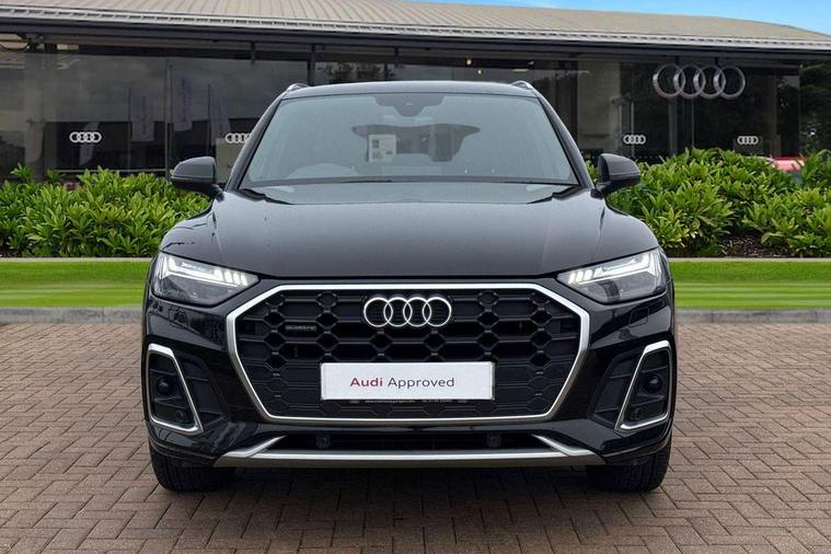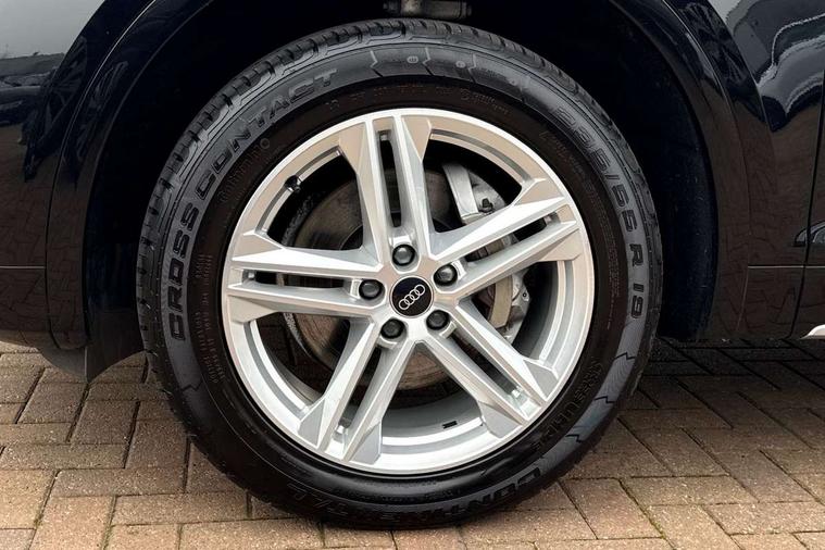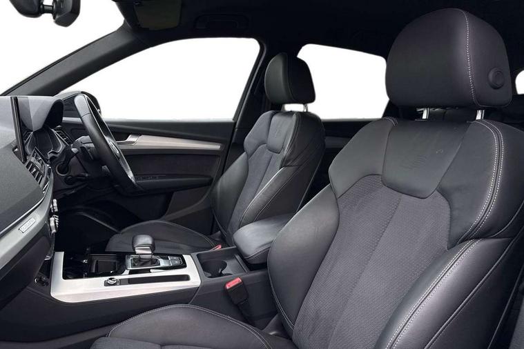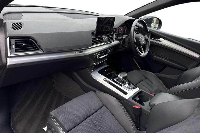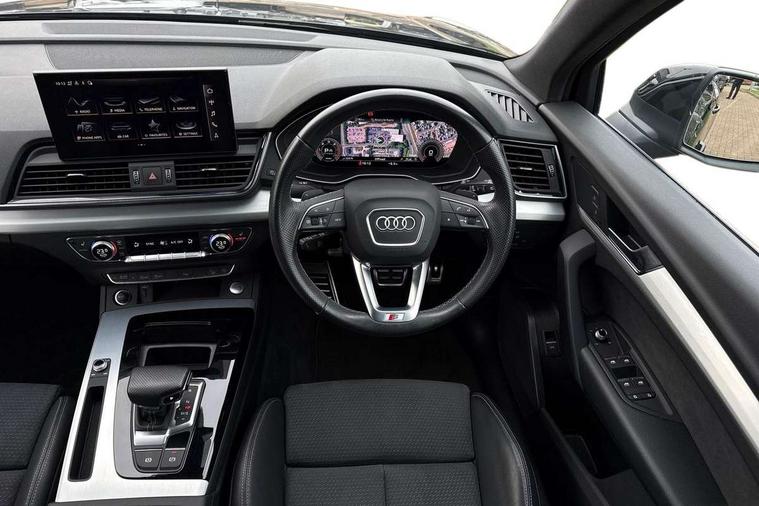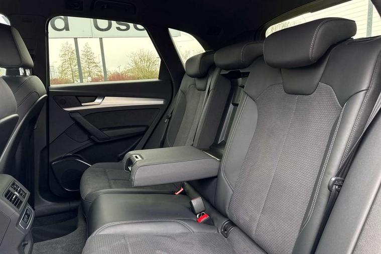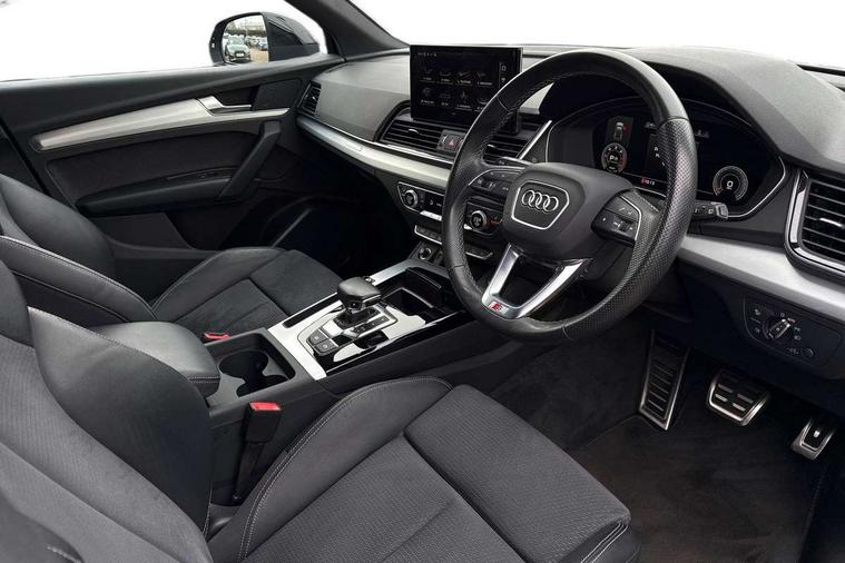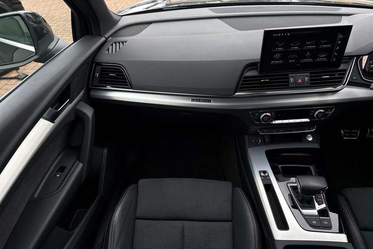 Acoustic front and rear parking sensor, Audi connect safety and service (e-call), Audi connect with Amazon Alexa Integration, Audi drive select, Audi virtual cockpit plus with 12.3" screen and three different layout designs, Audi wireless smartphone interface, Automatic start-stop system with coasting functionality and efficiency programme, Bluetooth interface, Electro - mechanical power assisted steering, MMI navigation plus with 10.1" touch screen, Power tailgate, Reversing camera, Service interval indicator, Voice control system with Audi hotword activation "Hey Audi", Diesel particulate filter, Quattro on demand, S line sports suspension, 2 x USB charging port with aux input socket, 8 loudspeakers, DAB Digital radio, Acoustic windscreen, Aluminium roof rails, Audi matrix LED headlights with dynamic front and rear indicators, Auto dimming door mirrors, Auto dimming frameless rear view mirror, Automatic headlight adjustment, Automatic headlights and windscreen wipers, Body colour bumpers, Body colour door mirrors, Body colour rear diffuser with matt aluminium silver surrounds, Body colour underbody protection, Chrome plated exhaust trims, Daytime running lights, Door sills in Selenite silver, Electric adjustable/heated/folding door mirrors, Front air inlet surrounds in aluminium, Front and rear electric windows, Front radiator grille in honeycomb design, Headlight washers, High level LED brake light, Lower bumpers painted in contrast Manhattan grey, Rear chrome trim strip below lights, Rear privacy glass and rear side windows, Rear side wing doors, Rear wiper, Roof bars, S Line badges on the front wings, S Line front and rear bumpers, S Line rear spoiler, S Line side skirts, 3 rear headrests, 3 spoke leather multifunction steering wheel with S badging perforated leather grips, 40:20:40 split folding 3 rear bench seat in 2nd row with rear centre armrest, Black cloth headlining, Comfort front centre armrest, Contrast stitching on seats, steering wheel and gear lever gaiter, Deluxe 3 zone electronic climate control, Front/rear floor mats, Gear lever in black leather, Heated front seats, Height adjustable front head restraints, Height/reach adjustable steering column, Illuminated door sill trims with S logo, Luggage compartment cover, Manual seat adjustment with 4-way electric lumbar support, Removable luggage compartment floor, Single front passenger seat, Stainless steel pedals, Sunvisors with vanity mirrors, High gloss pack - Q5, LED interior light pack - Q5, 3 point seatbelts on all seats, 6 airbags - Driver, front passenger, curtain and side airbags, Electrically operated child locks on rear doors, Electromechanical parking brake, Electronic stabilisation control including ABS, ASR and EDL, First aid kit with warning triangle and vests, Front passenger airbag deactivation, Hill descent control, Hill hold assist, ISOFIX child seat mounting for front passenger seat and ISOFIX child seat mounting with Top Tether for outer rear seats, Multi collision brake assist, Pop-up bonnet for pedestrian protection, Pre sense city, Seat belt force limiter, Seatbelt monitoring, Tyre pressure warning, Anti theft alarm, Anti-theft wheel bolts, Keyless Go access/ignition system, Remote central locking, Air vents inserts and centre console in gloss black, Matt brushed aluminium inlays,