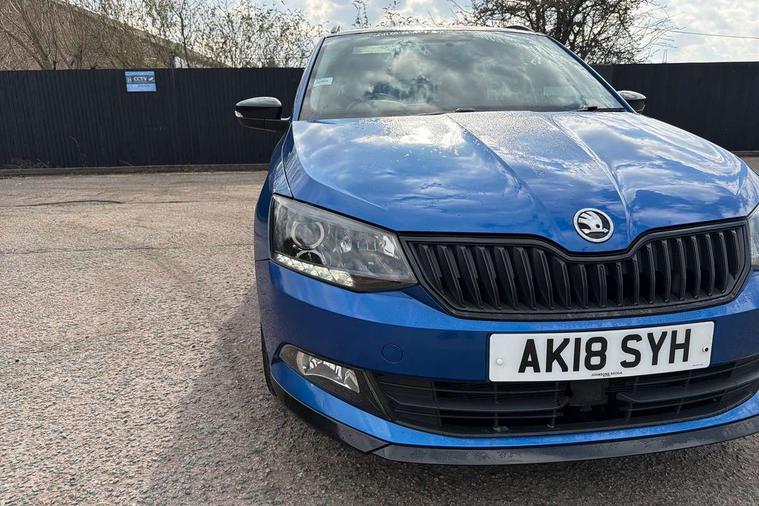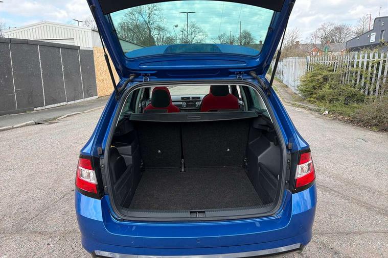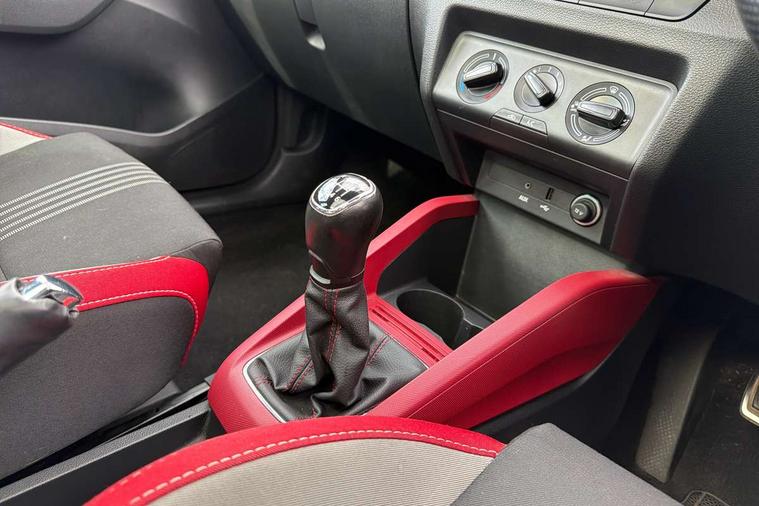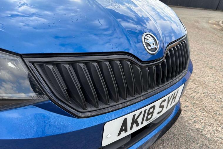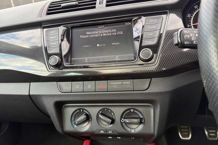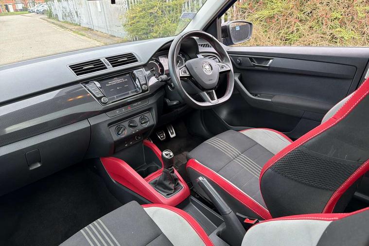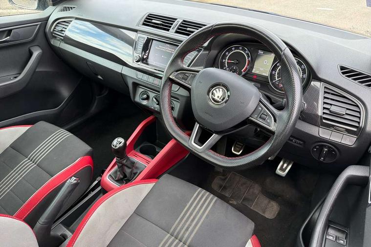 Black decorative inserts, Arkamys surround sound pack - Fabia, Chrome Pack - Fabia, Alarm with interior monitoring, Immobiliser, Locking wheel bolts, Remote central locking, 6.5" touchscreen, Auxiliary socket for external MP3 player, Bolero Radio, DAB Digital radio, SD card slot, USB interface, 3x3 point rear seatbelts, ABS, Curtain airbags, Driver and passenger airbags, Driver and passenger side airbags, EDS, ESC with ASR, Front seatbelt pretensioners, HBA (Hydraulic Brake Assist), Passenger airbag deactivate switch, Seatbelt warning, Tyre pressure monitor, Black door mirrors, Black radiator grille, Body colour bumpers, Body colour door handles, Body coloured rear spoiler, Electric front windows, Electrically adjustable and heated door mirrors, Heated rear window, Height adjustable headlamps, Illuminated door sill inserts, Intermittent rear wash/wipe, LED daytime running lights, Panoramic sunroof with black roof rails, Rear diffuser, Tinted rear windows, Tinted windscreen, 1.5L bottle holder in front door panels, 2 height adjustable rear headrests, 3 spoke leather multifunction sports steering wheel with red stitching, 60/40 split folding rear seat, Boot stowage box, Cargo area storage tray, Cloth upholstery, Driver + passenger vanity mirrors, Floor mats with red stitching, Folding grab handles, Front reading lights, Front sports seats, Height adjustable driver's seat, Height adjustable front headrests, Height adjustable passenger seat, Height/reach adjust steering wheel, Interior light with delay, Leather gearshift, Leather handbrake, Lower glovebox cover, Luggage load hooks, Parcel shelf, Pearl grey carpets, Pearl grey headlining, Pollen filter, Rear courtesy light, Rear storage trays, Ticket holder, Two rear outer seat isofix location points, Umbrella under front passenger seat, Bluetooth system, Exterior temperature gauge, Front assistant collision mitigation, Multi function trip computer, PAS, Service interval indicator, SmartLink,