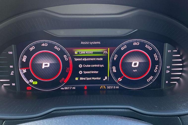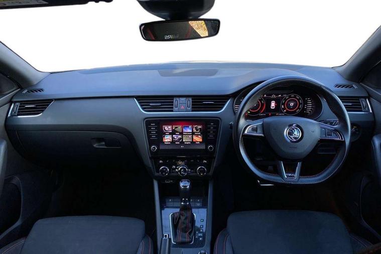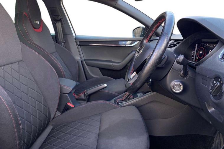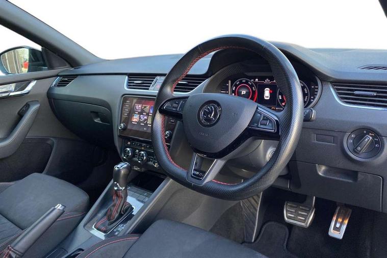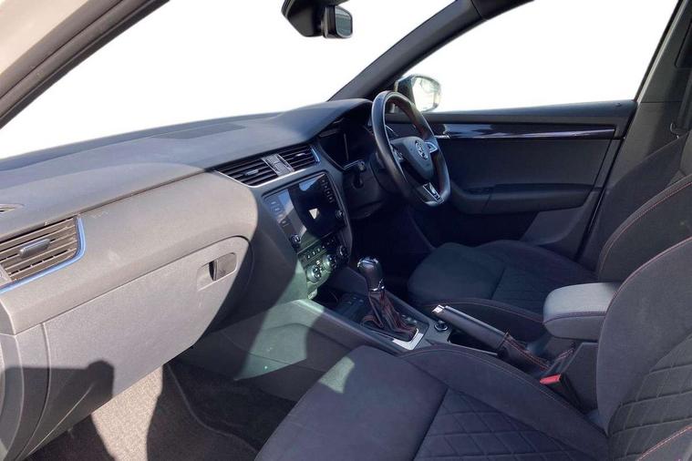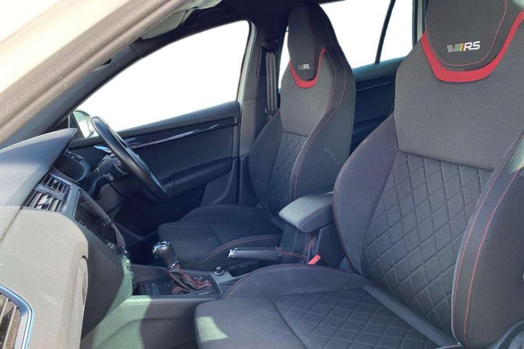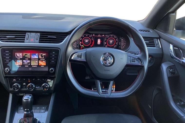Bluetooth system, Driver alert system, Driver fatigue sensor, Driver profile selection, Electro-mechanical power steering, Outside temperature gauge, Performance mode selection, Proximity sensors, Service interval indicator, SmartLink with Apple Carplay/Android auto and MirrorLink, Stop/start system, Voice control system, Electronic limited slip differential, Sports suspension, Auxiliary input socket, Bolero Radio, DAB Digital radio, Multi device interface, Aero wiper + intermittent function, Body colour door handles, Body coloured bumpers and protective side mouldings, Door sill trim with vRS logo, Electric front and rear windows with child safety lock, Full LED Headlights with adaptive front light system and LED daytime running lights, High gloss black front grille, High level third brake light, Internally adjustable headlight beam level, LED rear lights (high), Light assistant (coming home/tunnel light) with auto-dimming rear view mirror, Privacy glass, Rain sensor, Rear wiper, Telescopic front headlight washers, Tinted glass, vRS exterior design with bumper and spoiler, 3 spoke supersport multifunction leather steering wheel with vRS logo including paddle shift, Air re-circulation and pollen filter, Aluminium pedals, Black headlining, Chrome inner door handles, Driver + passenger vanity mirrors, Dual zone automatic air conditioning with humidity sensor and control, Front and rear footwell illumination, Front armrest with storage box, Front seat and rear pockets, Front sport seats, Gear shift indicator, Height adjustable driver and passenger seat with lumbar support, Height adjustable front and rear head restraints, Height/reach adjust steering wheel, Illuminated air conditioned glovebox, Illuminated luggage compartment, Interior courtesy light operated by door switches, Interior door handle lighting in front and rear, Lashing eyelets in boot, Rear seat backrest release, Safety vest holder under passenger seat, Split folding rear seat backrests, Sunglasses storage, Textile floor mats, Two isofix child seat fitting in rear, Umbrella under front passenger seat, vRS Cloth upholstery, LED Interior lighting package - Octavia, 3 rear 3 point seatbelts + pretensioners, Automatic post collision braking, Driver and passenger front and side airbags, Drivers knee airbag, Energy recovery system, ESC including ABS, EBV, MSR, ASR, EDS, HBA, DSR, ESBS, TSA, MKB, XDS and Prefill brake function, Fuel supply cut off, Head and curtain airbags, Height adjustable front seatbelts + pretensioners, Hill hold control, Passenger airbag deactivate switch, Red brake calipers, Seatbelt warning lamp, Tyre pressure monitor, Alarm, Electronic engine immobiliser, Remote central locking, Low rolling resistance tyres,