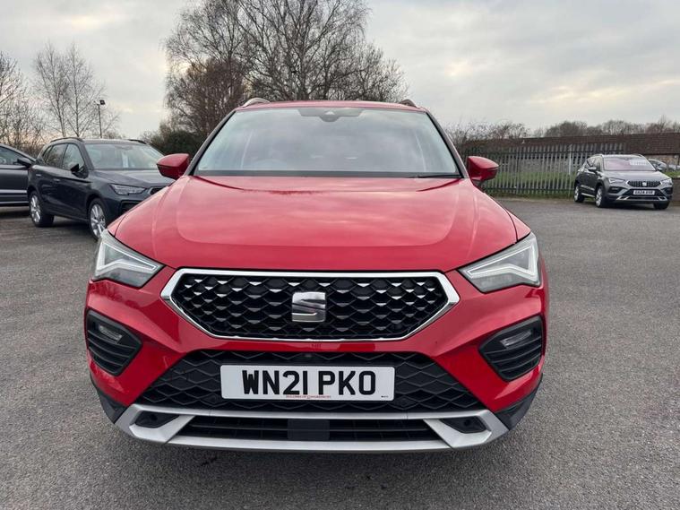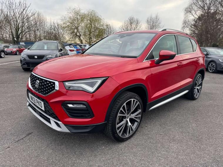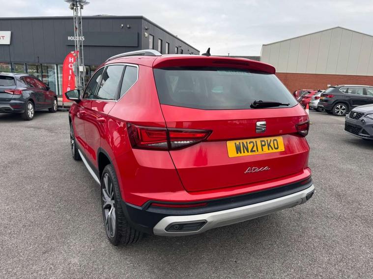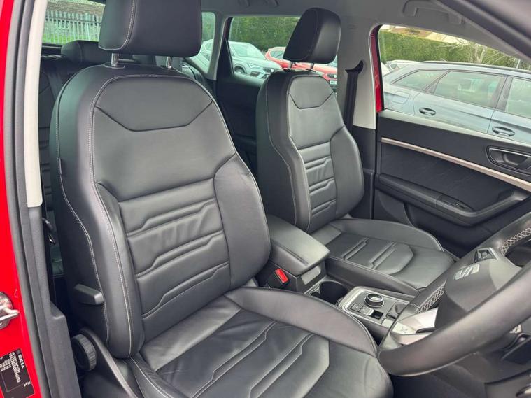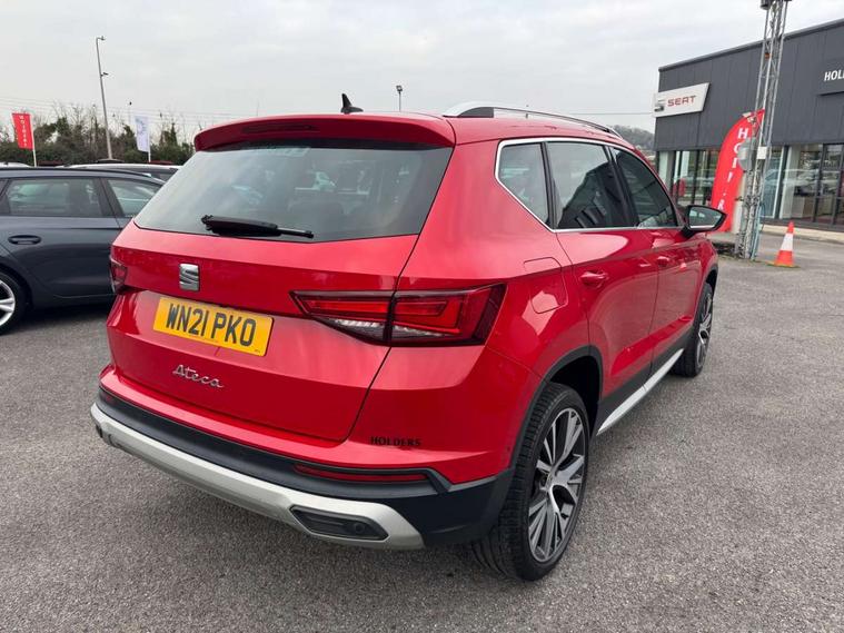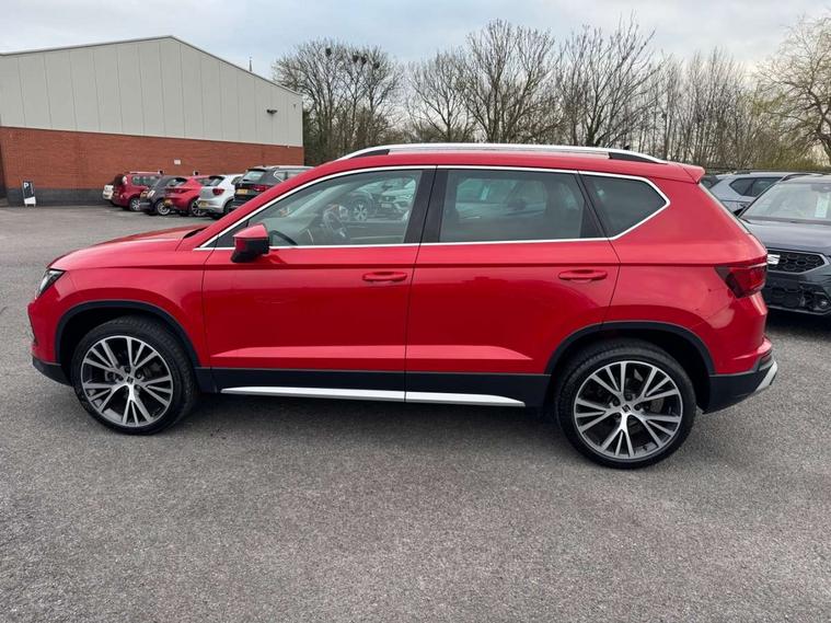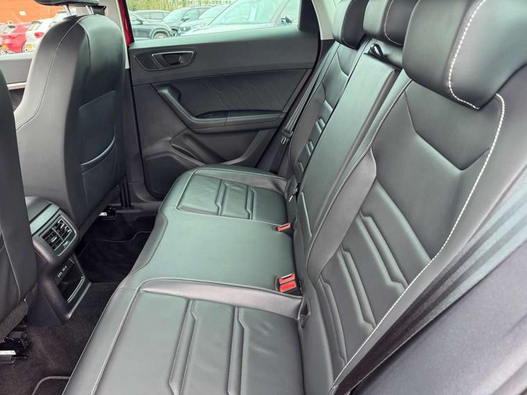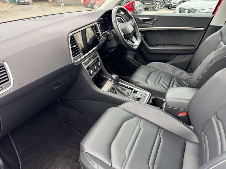 Digital cockpit, Electric tailgate with virtual pedal, Outside temperature gauge, Progressive power assisted steering, Rear view camera, SEAT drive profile with driving experience button - Normal, Sport, Eco and Individual mode, gearshift, steering and throttle response, Self parking functionality (includes front and rear parking sensors), Side and exit assist, Top view camera, Trip computer, Wireless full link smartphone integration, Wireless phone charger, Steering wheel mounted audio/phone controls, Black simulated exhaust pipes, Body colour bumpers, Body coloured wheel arch surrounds, Chrome front grille frame, Chrome roof rails, Chrome side window trim, Dark tinted rear windows, Daytime running lights, Door mirrors with welcome light silhouette, Dynamic headlight range control with self adjusting whilst driving, Electric adjustable/heated/folding door mirrors, Front and rear electric windows, Front grille hot stamping, Full LED headlamps with lens and LED front fog lamps with cornering function, Heated windscreen, Illuminated aluminium front door sill, LED rear tail lights with dynamic indicators, Rear fog lights, Rear wash/wipe, Reflex silver side mouldings, 12V socket in front, 60/40 split folding rear seat, Dual zone climate control, Front and rear head restraints, Front centre armrest, Front seat back storage pockets, Heated front seats, Height adjustable driver and passenger seat with lumbar adjustment, ISOFIX points in outer rear seats with top tether anchorage points, Leather steering wheel and gear knob, Leather upholstery with front sports seats, Multicoloured ambient lighting with LED interior illumination, Rear armrest and easy back seat release mechanism from boot, Steering wheel mounted gearshift paddles, Storage compartment in roof console for sunglass, Storage compartment under driver's seat, Convenience pack - Ateca, Interior lighting pack - Ateca, Navigation system pack with DAB - Ateca, Safe and driving pack - Ateca, 3x3 point rear seatbelts, ABS, Traction control system (TCS), Electronic stability control (ESC) and Electronic differential lock system (XDS), Airbags - Driver and front passenger airbag with deactivation, front side, two curtain and driver's knee airbags, Electric parking brake with auto hold function, Front and rear seatbelt reminder, Hill hold control, Tiredness recognition system, Traction control, Tyre pressure monitoring system, Alarm, Keyless entry, Locking wheel bolts, Chrome interior detailing, 19" Exclusive machined alloy wheels 36/4 in nuclear grey,