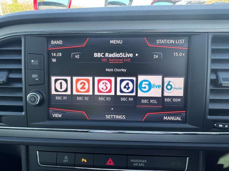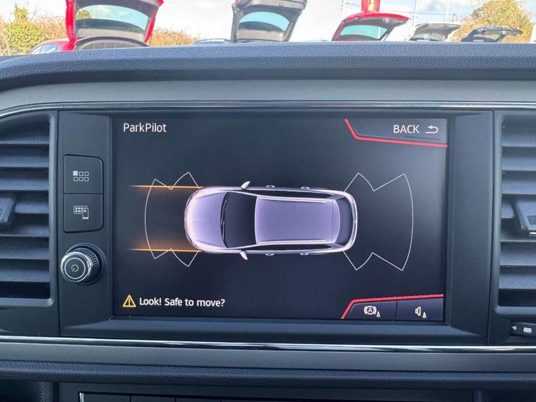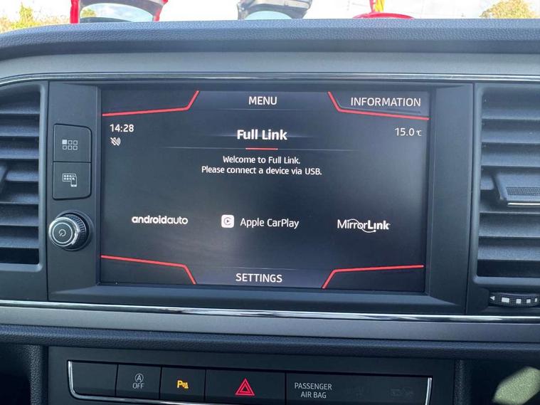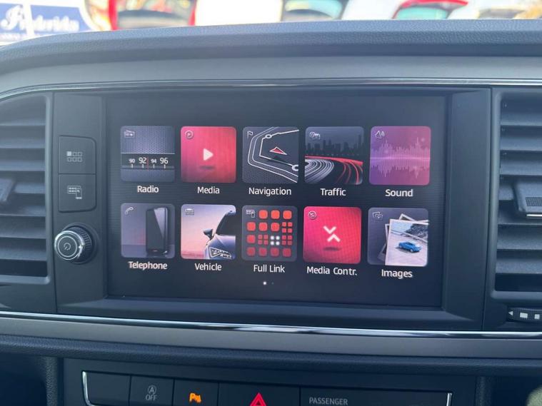 'Lights On' Reminder warning buzzer, 3D map display, 8" touch screen, Bluetooth Handsfree Phone Connection, Electro-mechanical power steering, Front and rear parking sensors, Front assist with pedestrian protection, Full Link Smartphone Integration with Mirror Link, Apple Car Play, Google Android Auto, Low fuel warning light, Navigation system (incl. media system plus), Outside temperature gauge, RPM counter, SEAT logo boot release, Service interval indicator, Trip computer, Voice recognition, Comfort suspension, XDS electronic differential lock, 2x SD card slot, 4 USB, 8 Speakers, Auxiliary input socket, Bluetooth audio streaming, CD player, DAB Digital radio, High resolution colour driver display, Media system plus (incl. media system colour), SEAT USB media cable, Steering wheel mounted audio/phone controls, Black radiator grille, Body colour door handles, Body coloured bumpers, Body coloured exterior mirrors with integrated LED indicators, Chrome roof rails, Chrome-plated radiator grille surround, Dark tinted rear windows, Electric front/rear windows, Electrically adjustable door mirrors, Front fog lights with cornering function, Halogen headlights with small LED daytime running lights, Heated door mirrors, Hidden exhaust pipe, High gloss black finish B and C pillars, Rear wash/wipe, 12v power point in centre console, 60/40 split folding rear seat with armrest, Active front headrests and 3 rear headrests, Additional heating and ventilation outlet in rear of centre console, Air conditioning, Boot storage net, Cargo rings in boot, Double boot floor, Driver and passenger seat height adjust, Driver seat lumbar adjustment, Dust/pollen filter, Front adjustable head restraints, Front armrest with storage box, Front comfort seats in Tresil cloth, Front cupholders x 2, Front seatback storage pockets, Front/rear floor mats, Gear shift indicator, Height/reach adjust steering wheel, High centre console with integrated box & cup holder, rear air outlet, with armrest in front seats, Instrument lighting with brightness control, Leather steering wheel and gear knob, Luggage compartment cover, Luggage tie-down hooks, Rear top tether child seat ISOFIX attachment, Storage box under drivers seat, 3 point seatbelts on all rear seats, 7 airbags - 2 front, 2 front side, 2 curtain, 1 knee, ABS + TCS, Child proof door locks, Electric handbrake, Electronic parking brake with auto hold, ESC with tyre pressure warning indicator, ESP+EBA, Front seatbelt pretensioners, Front seatbelt reminder, Hill hold control, Manual passenger airbag deactivation function, Multi-Collision braking, 2 folding remote keys with window open/close and boot opening function, Central locking fuel filler cap, Engine immobiliser, Locking wheel bolts, Remote central locking + deadlocks, Volumetric alarm with back up horn, Chrome interior detailing, 17" Dynamic alloy wheels 30/3,