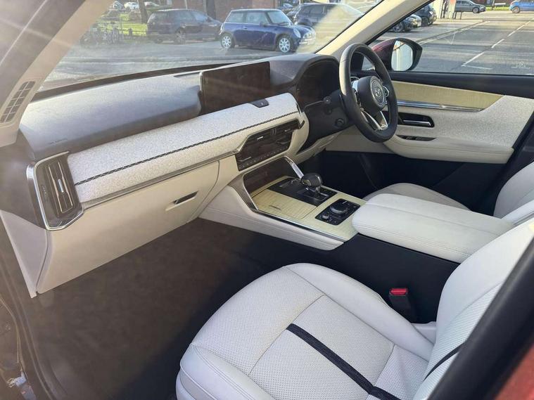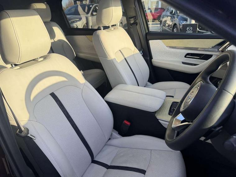 Low washer fluid warning light, 12.3" Colour entertainment centre display with mazda connect infotainment, 12.3" TFT Colour display, Adjustable speed limiter, Blind spot assist, Blind spot monitoring with rear cross traffic alert, Distance alert system, Driver attention alert system, Driver Monitoring with personal identification, E-call with GPS, Emergency lane keeping with blind spot assist, Emergency stop signalling system, Exit warning function, Front and rear parking sensors, Ingress / Egress support and automatic driver position guide, Integrated bluetooth, Intelligent speed assist, Kinematic posture control, Lane keep assist system (LAS) with Lane departure warning system (LDWS), Mazda Driver Personalisation System, Mazda Navigation System with european mapping, Multimedia Commander, PAS, Power lift gate with handsfree function, Power start/stop button, Speed alert, Traffic sign recognition enhanced with mandated excessive speed warning, Trip computer, Windscreen projected colour active driving display, Wireless apple car play/android Auto, Type 2 Mode 2 cable for AC charging via UK 3-pin plug, 7.2 kw On board Charger, Internal Combustion Engine Sound Emulator, Mi-Drive (Normal, Sport, Off-road, Towing and EV mode), Paddle shift, Type 2 Mode 3 cable for AC charging via home or public charge points, AM/FM and DAB radio, Bose surround sound system with 12 Speaker, Bose center point, Bass match and audio pilot technology, Steering wheel mounted audio/bluetooth controls, USB-C inputs (x2 front and x2 rear), Auto dimming driver's door mirror, Automatic headlight levelling, B-pillar and C-pillar garnishes in piano black finish, Body colour roof spoiler, Body coloured bumpers, Body coloured door mirrors, Body coloured wheel arch and side mouldings, Chrome finish signature wing in front grille, Chrome front side garish, Chrome side window surrounds, Coming/leaving home lighting function, Dark plated headlight lense, Dusk sensing headlights, Electric front/rear windows with one touch auto up/down, Electric panoramic sunroof, Frameless auto dimming interior rear view mirror, Front kodo turn signal, Front wiper de-icer, Headlight washers, High beam control, LED 3rd brake light, LED rear signature combination lamps, Piano black bar style front grille, Rain sensing front wipers with adjustable sensitivity and speed, Rear side wing doors, Rear wiper, Signature LED daytime running lights, Silver decoration panel, 12v power outlet - front, 12V socket in boot, 2 Heated captains chairs in 2nd row, 2 seat bench in 3rd row, 3 height adjustable rear headrests, 3 seat bench featuring folding centre armrest equipped with two cup holders 2nd row, 50/50 split folding 3rd row rear seats, 60/40 split folding 2nd row rear seats, Ambient lighting, Cargo net, Door panel trim - Cordovan-like Vinyl leather with matt black hairline film inlay, Driver and front passenger two rear grab handles with rear coat hooks, Driver and front passenger visors with covered vanity mirror and driver ticket holder, Driver seat electric tilt, slide, recline, height and lumbar adjustment, Driver, front passenger and two rear door pockets, Driver/passenger front seatback pockets, Electric telescopic and tilt adjustment steering wheel, Front centre storage with illumination and two cupholders, Front down lamp with front and rear foot lamps, Front headrests, Front passengers seat electric slide, recline, height and lumbar adjustment, Front seat ventilation with 3-stage setting, Glovebox illumination, Grey roof lining, Heated front seats with 3 stage setting, Heated leather wrapped steering wheel, Heated outer rear seats with 3-stage setting, ISOFIX child seat anchorage points attached on outer rear seats, Leather wrapped gear shift knob, LED illumination luggage compartment, Nappa leather upholstery, Practical and spacious front centre armrest storage, Rear seat recline function for rear passenger comfort, Remote fold down rear seats, Remote pre-heating/cooling, Roof mounted sunglasses holder, Single front passenger seat, Three zone climate control air conditioning with rear air vents for 2nd and 3rd row, White woven fabric dashboard with KAKENUI detailed stitching and genuine maple wood accents, Convenience and Driver Assistance Pack - CX-80 PHEV, 3 point ELR front seat belts x2 with pretensioners, 3 point ELR rear seat belts, Active bonnet, Anti-lock braking system (ABS), Drivers knee airbag, DSC - Dynamic Stability Control, Electronic parking brake with auto disengage function and auto hold function, Front and rear curtain airbags, Front dual stage driver and single stage front passenger airbags, Front passenger airbag cut-off switch, Front side airbags, Front smart city brake support, Hill decent control, Hill launch assist, Manual rear child locks, Seatbelt reminder for driver/front passenger and rear seats, Traction control, Tyre pressure monitoring system (TPMS), Remote central locking with deadlocking and automatic door lock when driving, Smart keyless entry, Thatcham accredited alarm and immobiliser, Dashboard panel - Cordovan-like vinyl leather, White maple wood centre console panel, 20" Black metallic mechined alloy wheels, Emergency tyre repair kit,