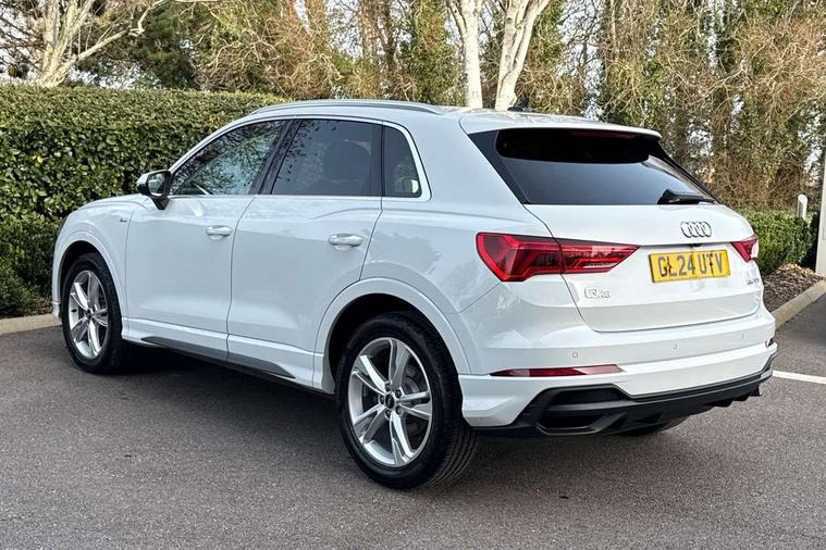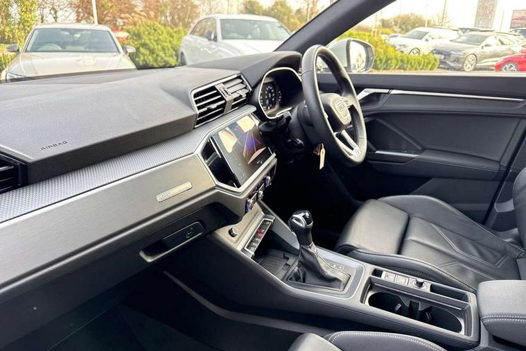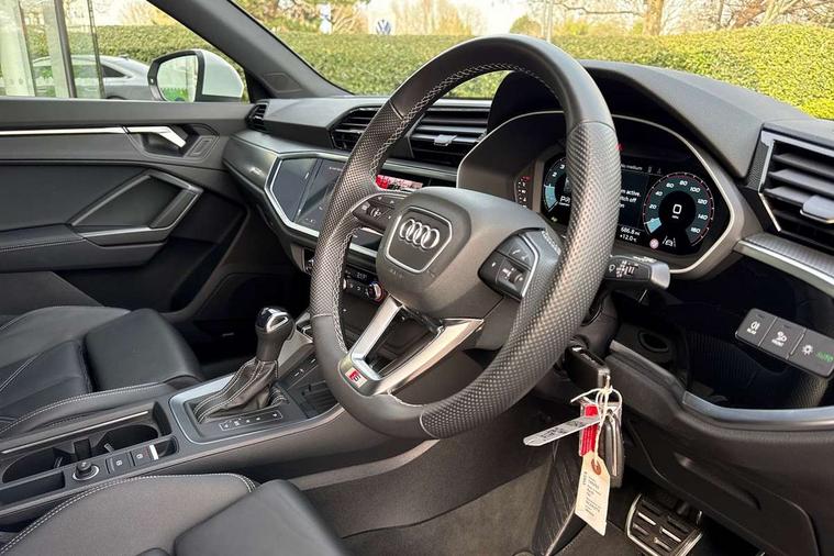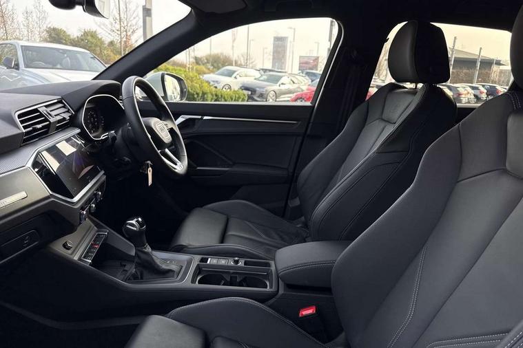 Amazon alexa Integration, Audi connect safety and service, Audi drive select, Audi lane departure warning, Audi Virtual Cockpit - 10.25" display, Bluetooth interface, Camera based traffic sign recognition, Distraction and Fatigue warning, Legal emergency call, MMI Navigation Plus with high resolution 10.1 inch touchscreen colour display, Power operated tailgate, Progressive steering, Service interval indicator, Smartphone interface includes wireless Apple carplay/Android Auto, Start stop system with recuperation, Voice control system with natural language interaction, Sports suspension, 2 USB-C ports with charge and data functions, 6 passive loudspeakers, DAB digital radio module, Acoustic windscreen, Aluminium roof rails, Aluminium window trim, Anthracite black radiator grille, Auto dimming door mirrors, Auto dimming frameless rear view mirror, Body colour front spoiler blade, Electrically folding, adjustable and heated door mirrors with integrated LED side indicators and kerb view function for passenger side, Front and rear electric windows, Front fog lights, Front side air inlets in matt platinum grey, Grille vertical bars in aluminium silver/Matt, High gloss black finish B and C pillars, LED Dynamic rear indicators, LED headlights with LED daytime running lights, LED rear lights, LED third brake light, Privacy glass dark tinted rear and rear-side windows (from B-pillar backwards), Rain and light sensors, Rear diffuser grille in grained matt black, Rear diffuser strip in matt anthracite black, Rear side wing doors, Rear wiper, S line badges on front wings, S line front and rear bumpers and side skirts in contrasting Manhattan grey paint finish, Side skirt insert in matt Platinium grey, Variable front intermittent wipers, 12V socket in rear centre console, 3 seat bench in 2nd row, 3 spoke leather multifunction steering wheel features S badging and grips in perforated leather with contrast stitching, 40:20:40 folding with manual adjustment for 60:40 forwards/backwards position and backrest angle, Adjustable rear seat bench/backrest with centre armrest and cupholder, Black cloth headlining, Dual zone electronic climate control, Electric lumbar support, Front and rear black floor mats with contrast stitching in rock grey, Front and rear headrests, Front centre armrest, Height and reach adjustable steering wheel, Illuminated door sill trims with S logo, ISOFIX child seat mounting for front passenger with airbag deactivation and outer rear seat including top tether attachment point for outer rear seats, Manual front seats with height adjustment, Perforated leather gearknob, Single front passenger seat, Stainless steel luggage compartment sill finisher, Stainless steel pedals, Twin leather upholstery with front sport seats + S embossing, Non smoking pack - Q3, 3x3 point rear seatbelts, 6 airbags - Driver, front passenger, curtain and side windows, Audi pre-sense front with pedestrain and cyclist recognition, Electrically operated child locks on rear doors, Electromechanical parking brake, Electronic stabilisation control including ABS, ASR and EDL, Front seatbelt reminder, Hill descent control, Hill hold assist, Pre sense basic, Seatbelt monitoring, Tyre pressure warning, Warning triangle and first aid kit, Anti theft alarm, Anti theft wheel bolts, Immobiliser, Remote central locking, Aluminium look interior elements, Dark matt brushed aluminium inlay, Detail dashboard around MMI touch colour display in glass look, black with surround in aluminium look, Leatherette door armrest,