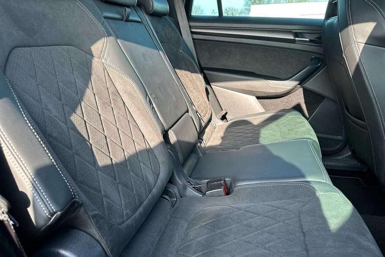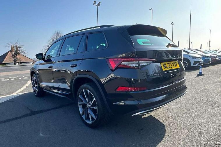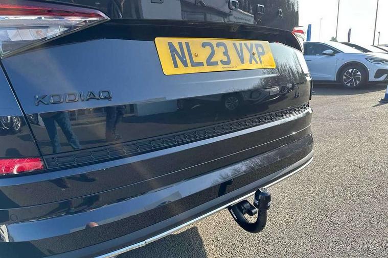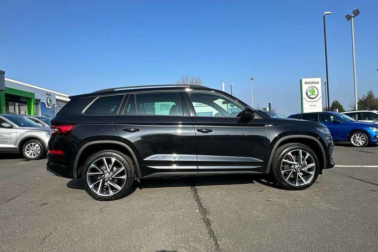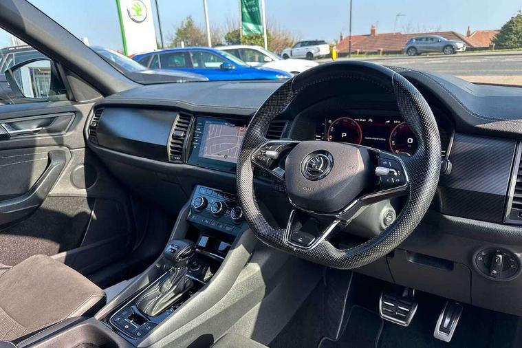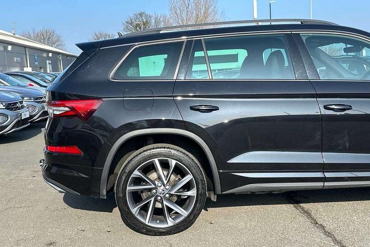 Bluetooth system, Columbus satellite navigation with 9.2" touchscreen, integrated Wi-Fi, web radio, Digital voice enhancement, e call+, ECO Stop/start function, Exterior temperature indicator, Progressive steering, Rear view camera, Smartlink wireless for apple carplay and wired for android auto, Speed limiter, Tailgate unlocking from outside, USB C Port x 2 in front centre console, Virtual Cockpit - 10.25" digital display with additional sports design, Wireless charging, 8 Speakers, DAB Digital radio, Aero front windscreen wipers with intermittent function, Aero rear window wiper, Auto dimming rear view mirror, Black roof rails, Black sports styling including front grille and window surrounds, Black wheel arch surrounds, Body colour bumpers, Body colour door handles, Electric adjustable/heated/folding door mirrors, driver side auto dimming with boarding sports and memory function, Electric front and rear windows, Extended rear spoiler with finlets in gloss black, Front fog lights, Full LED matrix headlights with AFS (adaptive front light system), cornering function and AWL (all weather lighting system), Gloss black door mirrors, Headlight washers, Heated rear window, Invisible tailpipe, LED daytime running lights, LED rear fog light, LED third brake light in rear spoiler, Light assistant (coming/leaving home/tunnel light), Off-road style lower front bumper element, Privacy glass, Rain and light sensors, Rear diffuser, Rear LED lights (high functionality) with welcome effect and dynamic indicators, Rear side wing doors, Safety reflectors on front and rear doors, Sportline badge on front fender, Sports front and rear bumpers including lower rear chrome strip, Tailgate lettering in Black, Window control switches with black trim, Without engine designation, 12V socket in boot, 2 rails with 2 hooks, 2 seat bench in 3rd row, 3 seat bench in 2nd row, 4 foldable roof handles with rear coat hooks, 60:40 foldable rear seat with sliding adjustment and backrest angle adjustment, Aluminium pedals, Black roof headlining, Bottle holders in door panel in the 1.5 litre front and 1 litre rear, Cargo storage compartments, Chrome headlight control button, Chrome interior door handles, Coat hooks on B pillar, Covered storage compartment on driver side, Decorative door sill covers, Front centre armrest with storage compartment, cup holder and 12V socket, Front courtesy lights, Gear shift lever with chrome frame and black gloss insert, Grey stitching in front and rear armrests and door armrests + door inserts, Height adjustable front headrests, Illuminated and cooled glovebox, Illuminated luggage compartment, Isofix child seat fittings in outer rear seats with top tether, Manually adjustable steering column, Microsuede door panels, Net programme in boot (1x horizontal Net, 2x vertical Nets), Overhead glasses storage compartment, Pollen filter, Rear centre armrest with cupholders, Single front passenger seat, Sliding trunk cover, Small Bags on the inner sides of the front backrests, Sports seats, Sunvisors with illuminated vanity mirrors, Three rear height adjustable headrests, Ticket holder on A Pillar, Umbrella in door panel, Variable boot floor, LED Interior light pack - Kodiaq, Auto door release and activation of warning lights in the event of an accident, Child locks on rear doors, Driver and front passenger airbag with knee airbag and front passenger airbag deactivation, Electronic parking brake with hill start assist, Emergency rear braking signal, ESC (incl. ABS+MSR+ASR+EDS+HBA+DSR+RBS+MKB), Front assist with autonomous emergency braking, Front side airbags with curtain airbags, Fuel cut off safety device, Height adjustable front 3 point seatbelts + pretensioners, Hill hold control, Rear disc brakes, Safety vest holder in door, Seat belt reminder for all seats, Three point rear seat belts, Two tone horn, Tyre pressure monitor, Alarm with interior monitoring and tilt sensor with safe function, Anti-theft wheel bolts, Immobiliser, Keyless entry and start system (KESSY), Remote central locking with 2 keys, Black air vent surround, Carbon finish dashboard and door inserts, Grey stitching in dashboard, 20" Vega Anthracite alloy wheels, Temporary spare wheel (space saver),