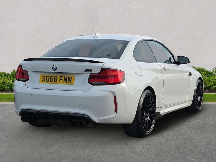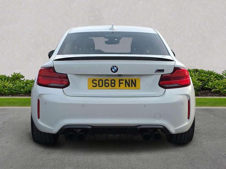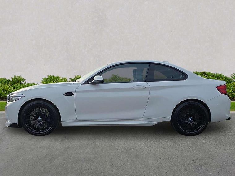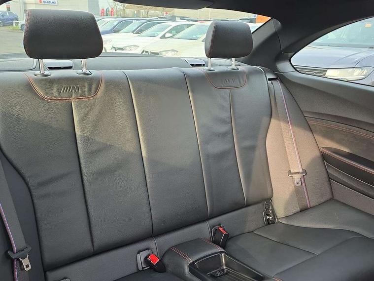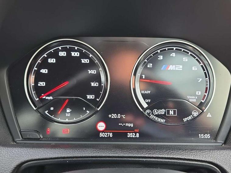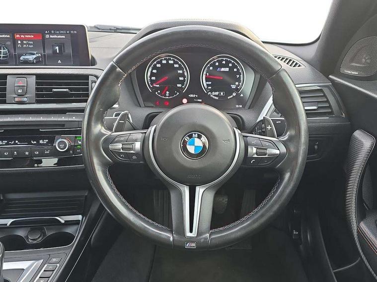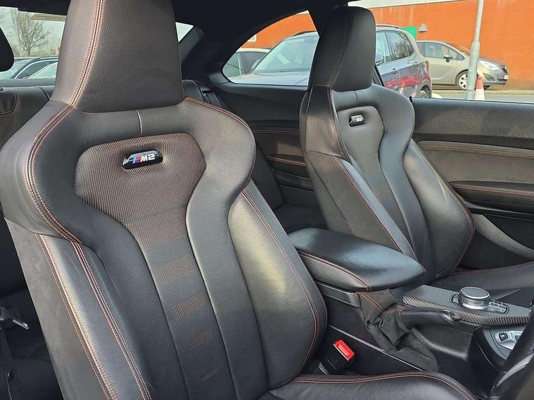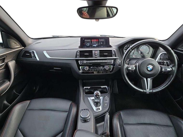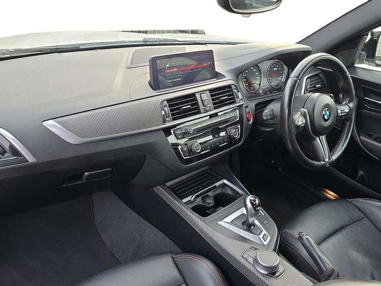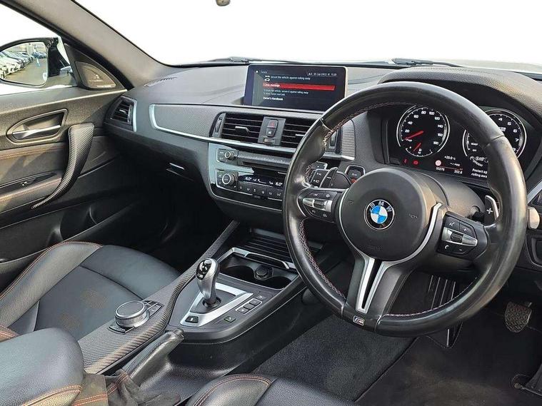 Auto start-stop, BMW Online services, BMW remote services, BMW Teleservices, Cruise control with braking function, Door/boot open warning, Front and rear Brake pad wear indicator, Front/rear Parking distance control, Instrument cluster with speedometer with miles per hour read out, tachometer and fuel gauge, Lights on warning by audio warning signal when ignition is switched off, M Servotronic power steering, Oil sensor for level and grade, warning by check control system, Oil temperature display via on board computer in instrument cluster, On board computer - average speed+fuel consumption, service interval, clock/date, odometer/trip meter, outside temperature display and ice warning, Optimum shift indicator, Personal Profile - automatic lock when driving away selectable, Real time traffic information, Speed limiter, Battery age recognition function, Drive performance control with ECO PRO comfort + sport mode, Engine cover with BMW roundel twin power turbo designation, M sport suspension, Oil dipstick, DAB Digital radio, 2 speed adjustable intermittent wipers with wash/wipe function, Automatic headlight beam throw control, Automatically dimming rear view mirror, Black chrome exhaust, Body colour bumpers, Body colour door handles, Body colour mirror caps, Body colour roof mouldings, Clear lenses direction indicator lights, Daytime driving lights, Direction indicator side lights integrated exterior mirrors, Dual dark chrome exhaust tailpipes, Dynamic brake lights, Electric windows - front and rear, with open/close fingertip control, anti-trap facility and comfort closing, Electrically adjustable and heated M specific exterior mirrors, Follow me home headlights, Front apron with large air inlets, Green tinted heat protection glazing, Headlight range control, Heated windscreen washer jets, High gloss black kidney grille with M double rod vertical slats and M2 badging, High gloss black M side strakes with M2 designation, High gloss shadow line, High level third brake light, LED rear lights, LED welcome home lights, M rear spoiler, M2 specific aerodynamic body styling with unique kidney grille, front bumper, rear bumper and side skirts, Rain sensor with automatic headlight activation, Rear bumper with high gloss black finish, Rear fog lights, Reversing light in rear light cluster, Shark fin roof aerial, Visible VIN plate, Welcome lighting, 12V power socket in centre console, 12V power socket in passenger footwell, 4 grab handles, Anthracite headlining, Anthracite Velour floor mats, Conditioned based service, Dakota leather upholstery, Driver and front passenger lumbar support, Folding rear seat head rests, Folding storage compartment with glasses holder + coin tray, Front and rear side armrests integrated into door trim, Front door sill finishers with M designation, Front door storage bins, Front head restraints, Front sliding armrest, Glove box handle with chrome surround, Isofix child seat for two outer rear seats, Leather gearknob, Leather handbrake lever, Luggage compartment access via BMW roundel, M multifunction nappa leather steering wheel, M Sports seats, Manually adjustment steering wheel column, Rear coat hooks, Rear folding head restraints, Storage compartment in rear centre console, Two cupholders with sliding cover and inlay mat, Two extra lashing eyes in luggage compartment, Interior comfort pack - 2 Series/M2, Media pack - Professional - 2 Series/M2, Active differential brake (ADB), electronic differential lock in DSC-OFF mode, Airbag - Front driver and passenger, front and rear head, front side, curtain head protection, manual deactivation of front passenger airbag possible, Anti lock braking system (ABS) with brake assist, Automatic Stability Control (ASC), Battery safety cut-off, BMW emergency call, Brake drying, Brake energy regeneration, Braking readiness, Cornering brake control (CBC), Crash sensor activating central locking release with hazard warning lights and interior lighting + battery safety cut-off, Dynamic brake control, Dynamic stability control + (DSC+), Dynamic Traction Control - DTC, Front pyrotechnic belt tensioners and belt force limiter, rear coaded belt buckles, Hill start assist, M dynamic mode, M Sport seatbelts, Seat belt security check for driver and front passenger, Side impact protection, Twin horns, Tyre pressure monitoring with 3 level warning strategy, Warning triangle and first aid kit, Central locking switch for all doors, fuel filler cap and luggage compartment, Check control system for monitoring of lights and door/luggage compartment open warning, Drive away door locking, Locking wheel bolts, Remote control including integrated key with blue insert, Thatcham category 1 alarm system with remote control and engine immobiliser, Carbon fibre interior trim with black high gloss finish, BMW mobility system, Reduced rolling resistance tyres,