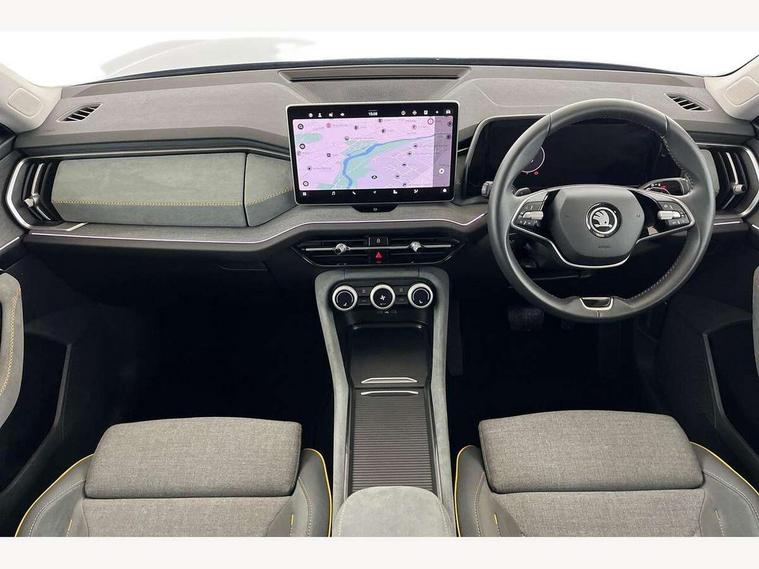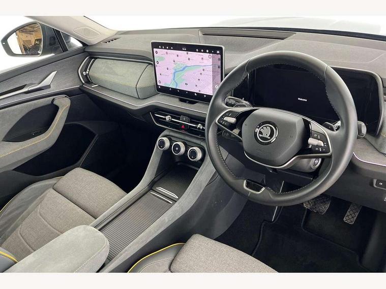 13" satellite navigation touchscreen display, Blind spot detection with door exit warning, Bluetooth system, ChatGPT functionality, Driver alert - Fatigue and drowsiness monitor, Dry display cleaner, Emergency call, Front and rear parking sensors, Front cross traffic assist, Lane assist, PAS, Rear traffic assist, Rear view camera, Tailgate unlocking from outside, Traffic sign recognition, USB C Port x 2 in front centre console, Virtual Cockpit - 10.25" digital display, Voice control system, Wireless charging for two smartphones (15W) with cooling function, Wireless SmartLink for Apple CarPlay and Android Auto, Stop/start function, 2x USB-C in the rear, 8 Speakers, DAB Digital radio, Aero front windscreen wipers with intermittent function, All weather light, Auto dimming rear view mirror, Black wheel arch surrounds, Body colour bumpers, Body colour door mirrors and handles, Cornering light and poor weather light, Electric folding /adjustable/separted heated/folding door mirrors, auto dimming with boarding sports and memory function, Electric front and rear windows, Exterior black decorative trims, Heat insulating glass in windshield, Heated rear window, Ice scraper in fuel tank cap, Invisible tailpipe, LED daytime running lights, LED front fog lamps, LED Headlights, LED rear fog light, LED rear lights, LED third brake light in rear spoiler, Light assistant with automatic headlight control and coming home feature, Logo projection in door mirrors, Rear roof spoiler, Rear side wing doors, Rear window wiper, Safety reflectors on front and rear doors, Unique dark chrome design logo on alloy wheels, Window control switches with black trim, Windscreen wipers with rain sensor, Without engine designation, 1.5l bottle holder points in all door, 1x centre rear reading light, 2 seat bench in 3rd row, 3 configurable smart dials with 32mm coloured display, 3 seat bench in 2nd row, 4 foldable roof handles with rear coat hooks, Ambient interior lighting - Dashboard, front-door stowage compartments, front and rear door panels and footwell lighting, Automatic gear selector on steering column, Chrome interior door handles, Driver/front passenger reading lights, Fabric headlining, Fixed bench 40:60:40 split folding backrests, Front and rear floor mats, Front centre armrest with jumbo box storage compartment, cup holder and 12V socket, Height adjustable front headrests, Isofix child seat fittings in outer middle row rear seats and front passenger with top tether, Manual height adjustment for front passenger seats and thigh support extender, Manual lumbar support for front passenger seat, Manually adjustable steering column, Pollen filter, Rear centre armrest with cupholders, Rear seat boot backrest release, Single front passenger seat, Skoda lettering on steering wheel, Storage pocket including mobile phone pockets on the backs of the front seats, Sunvisors with illuminated vanity mirrors, Three rear height adjustable headrests, Ticket holder on A Pillar, Tri zone climate control, Umbrella in door panel x1 made from sustainable materials, Upper and lower glovebox with card holder and coin compartment, USB C port by rear view mirror for charging only (15W), Variable boot floor, Auto door release and activation of warning lights in the event of an accident, Driver and front passenger airbag with knee airbag and front passenger airbag deactivation, Electric child locks, Electronic parking brake, ESC (incl. ABS+EMD+MSR+ASR+EDL+HBA+DSR+RBS+ESBS+MCB+TSA+XDS), Front assist with braking reaction to vehicles, pedestrians and cyclists, Front disc brakes, Fuel cut off safety device, Height adjustable front 3 point seatbelts + pretensioners, Hill hold assist, Junction assist with automatic emergency braking, Rear disc brakes, Safety vest holder in door, Seat belt reminder for all seats, Three point rear seat belts, Two tone horn, Tyre pressure monitor, Alarm with interior monitoring and tilt sensor with safe function, Anti-theft wheel bolts, Immobiliser, Remote central locking with 2 keys, Breakdown kit, Tool kit,