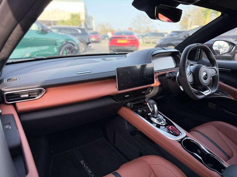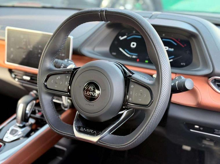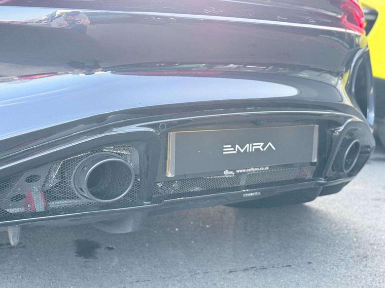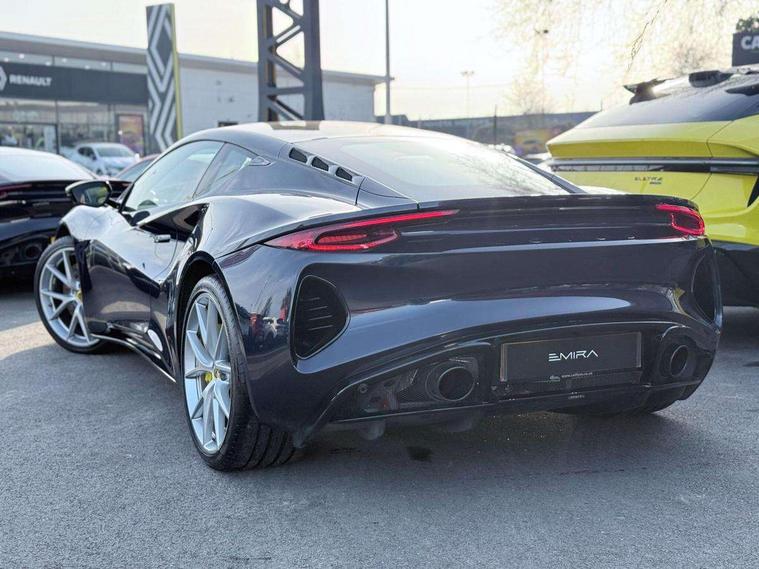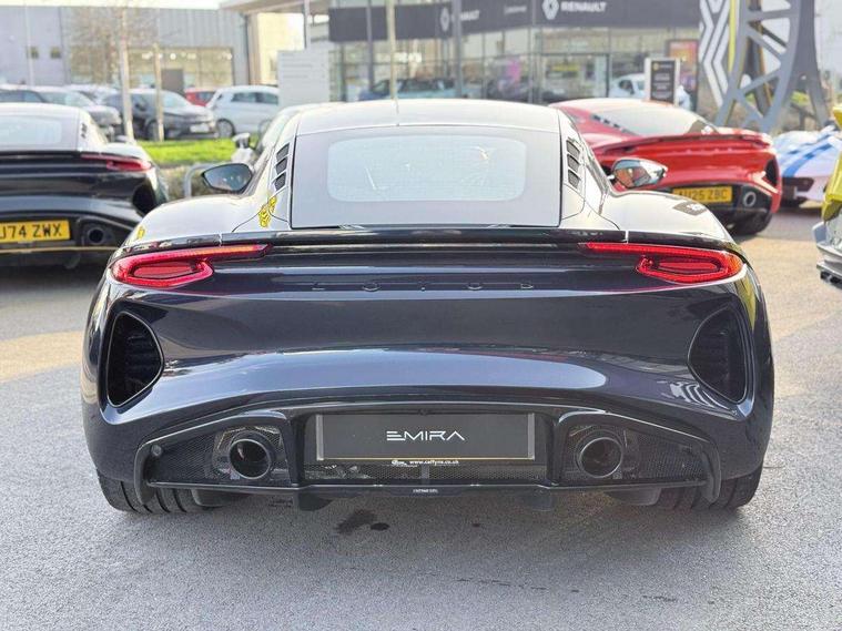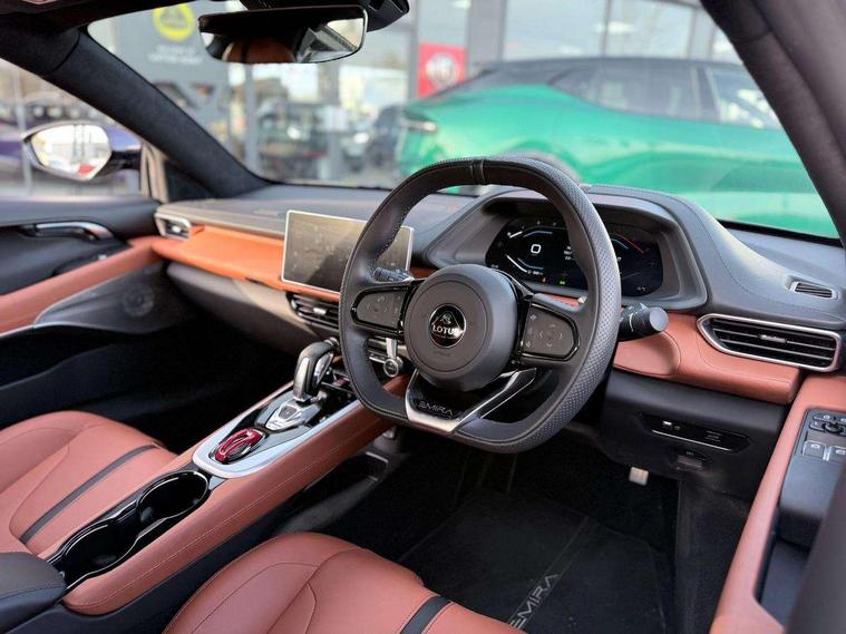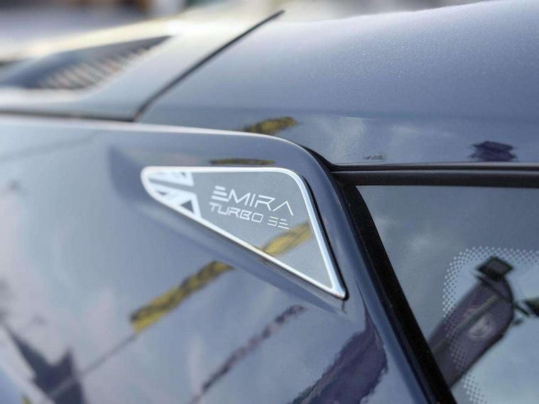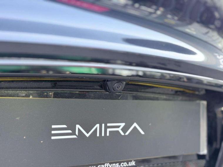 10.25" touchscreen MMI, 12.3" TFT supervision cluster display, Apple car play/Android Auto, Cruise control, Drive mode selector, eCall emergency call system, Embedded navigation system, Engine start button, Exterior temperature display, Hands free bluetooth system, Hydraulic PAS, On board diagnostics, Paddle shift with PRND selector, Rear parking sensors, Rev counter, Service interval indicator, Speed limiter, Steering wheel with cruise control operation, Tailgate, Travel data recorder, Trip computer, Voice control system, Anti-roll bars, Exhaust particle filter, Launch control, Auxiliary input socket, Centre console media control knob, DAB Digital radio, iPod interface, Steering wheel audio controls, USB port, Auto dimming rear view mirror, Automatic headlight levelling, Automatic lights, Body coloured bumpers, Door mirror indicators lights, Door mirror memory, Door sill protection, Electric adjustable door mirrors, Emira branded sill kickplates, Emira branding to front and rear lamp with Emira logo headlight internal bezel, Front electric windows, Initial anti-corrosion treatment, LED 3rd brake light, LED daytime running lights, LED fog lights, LED headlamps, LED indicator lights, NOx storage catalytic converter, Power folding and heated door mirrors, Rain sensor, Rear boot, Rear LED lights, Rear window heating, Tailgate demist function, Variable front intermittent wipers, Welcome home lighting, 12 way electrically adjustable front seats with driver's memory function, 12V Accessory socket, Aluminium treadplates with Emira engraved, C-pillar union flag badge "Emira Turbo SE", embossed aluminium and black monochrome texture, Cabin air filter, Cargo net, Central multimedia display, Centre console armrest, Coat hooks, Cup holders, Driver seat base with adjustable inclination, Driver/passenger electric lumbar adjustment, Emira badge on dashboard in front of passenger, Front head restraints, Front passenger seat backrest adjust, Front sport seats, Height/reach adjustable steering column, Illuminated passenger vanity mirror, Luggage compartment light, Multifunction sport steering wheel, Premium floor mats with grey contrast stitch, Satin chrome interior trim finishers, Single front passenger seat, Single zone climate control air conditioning, Sport pedals, Steering wheel lower spoke finished in satin chrome, Stowage - door bin, glovebox, centre console, Timed interior light, White ambient lighting, Anti-lock braking system (ABS), Branded brake calipers, Curtain Airbag, EBA, Electronic parking brake, Electronic Stability Programme (ESP), Emergency door unlock, Front and rear seatbelt reminder, Front seatbelt pretensioners, Front side airbags, Full size driver and passenger airbags, Height adjustable front seat belts (4 levels), Hill holder, Passenger airbag deactivate switch, Power assisted brakes, Traction control, Two piece high performance brake discs, Tyre pressure monitoring system, Alarm, Central locking, Immobiliser, Keyless start, Locking wheel nuts, Remote central locking, Vehicle tracking system preparation, Warranty - 3 Years/Unlimited Mileage, A-pillars, B-pillars, cantrail and headlining finished in black Alcantara, Leather interior door trim, Metal finish dash trim, Tool kit, Tyre repair kit,