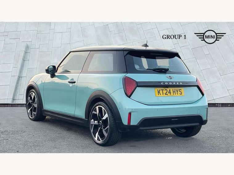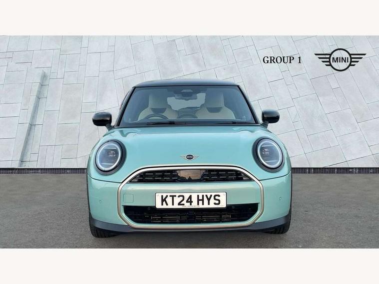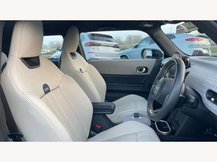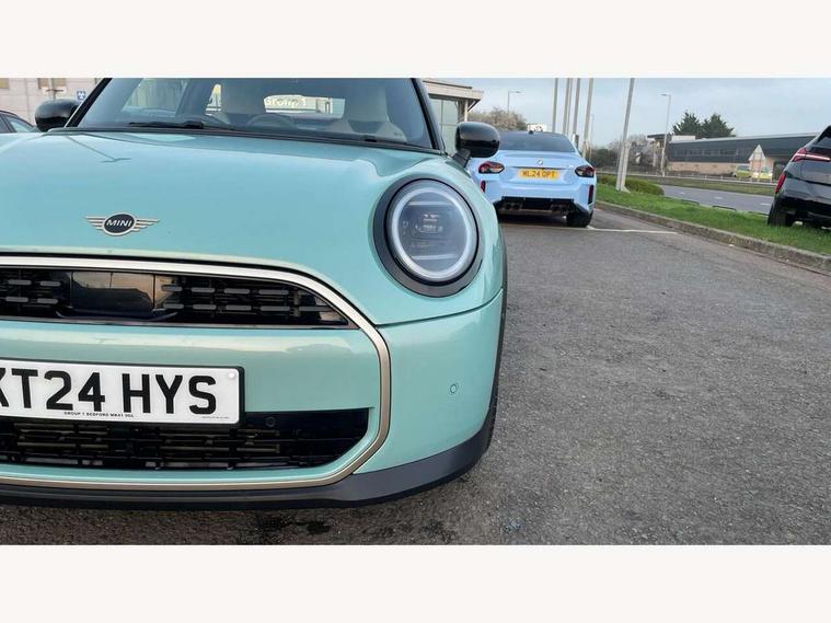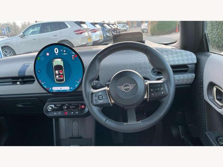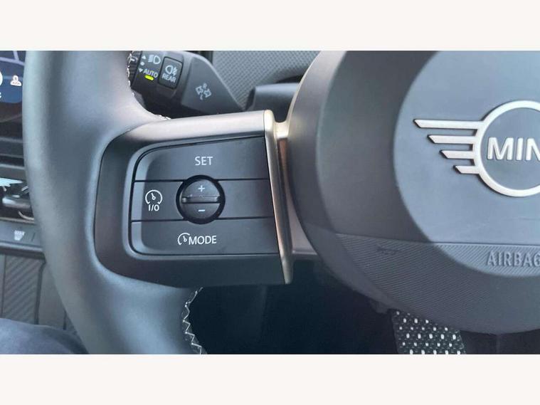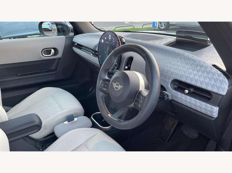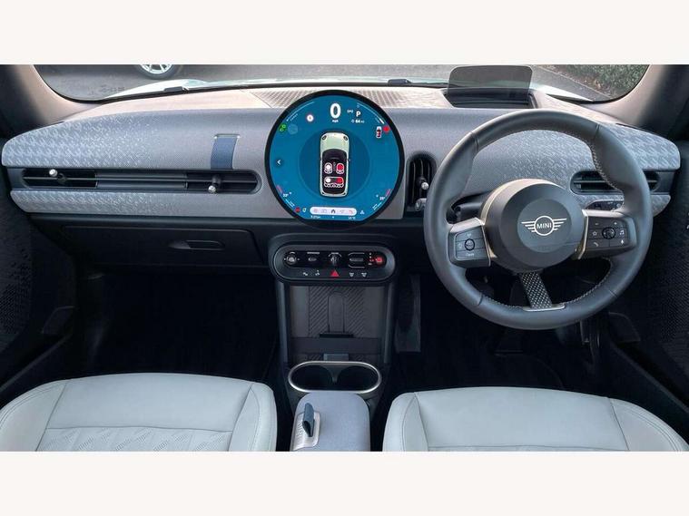 Central toggle bar, Circular OLED Screen, Compatible mobile phone bluetooth with audio streaming, Cruise control, Digital instrument cluster, Electro-mechanical speed dependant steering assistance, Emergency call service, MINI Experience Modes, Mini navigation system, On board computer, Service interval indicator, 7 speed steptronic transmission with double clutch, DAB Digital radio, Personal eSim, Auto headlights, Electric adjustable heated door mirrors, Electric front windows, Heated rear window, Heated windscreen washer jets, LED daytime running lights, LED Headlights, LED indicator lights, LED rear lights, Logos in Vibrant Silver, Rain sensor window wipers, Rear fog lights, Rear window wiper, Vibrant silver grille surround, 2 seat bench in second row, 2 zone automatic air conditioning, 60/40 rear seat bench, Ambient lighting, Cupholders, Dark headliner, Floor mats, Front and rear head restraints, Front compact armrest, Heated steering wheel, Height adjustable passenger seat, Lidded storage box in grey knit, Luggage compartment lighting, Single front passenger seat, Sport Vescin Steering Wheel, Sunvisors with vanity mirrors, Vescin synthetic leather upholstery, Driving assistant pack - Cooper Hatchback, Park assistant pack - Cooper Hatchback, 3 point seatbelts on all four seats, 6 Airbags - front, side, head and seat belt tensioners, Acoustic pedestrian protection, Anti-lock braking system (ABS), DSC - Dynamic Stability Control, Electronic parking brake, Front and rear disc brakes, Front ISOFIX (iSize), Front passenger airbag deactivation, Traction control, Tyre pressure monitoring system, Alarm, Immobiliser, Remote central locking, Blue decorative dash strap, Light Beige/Grey dash knit, Tyre repair kit,