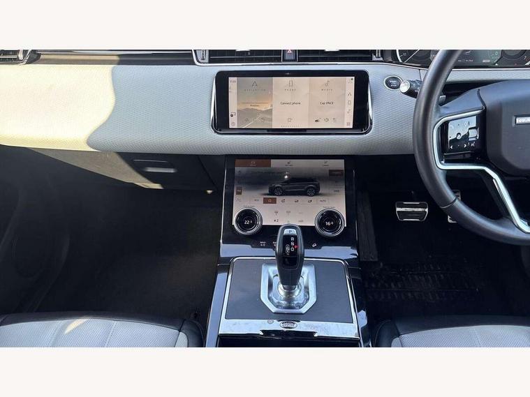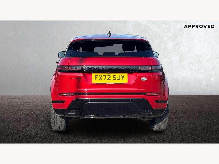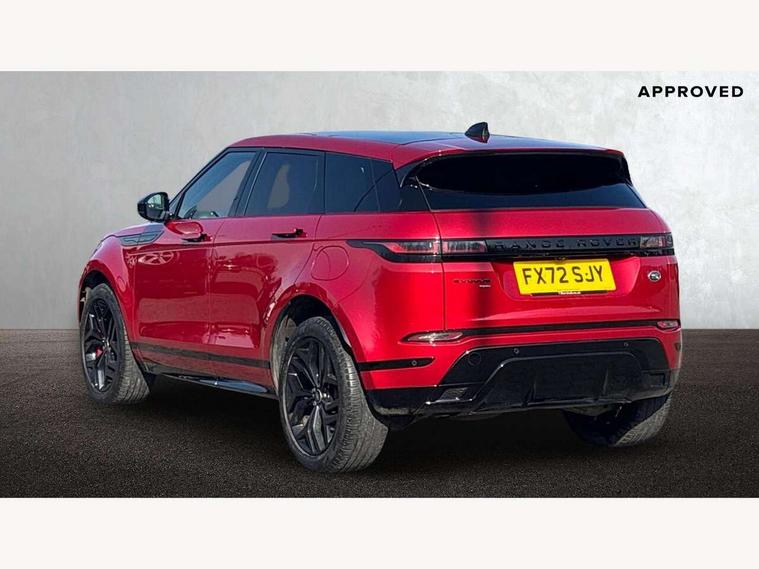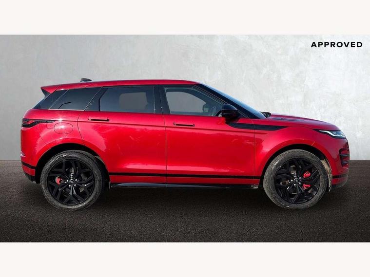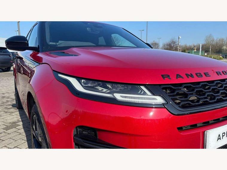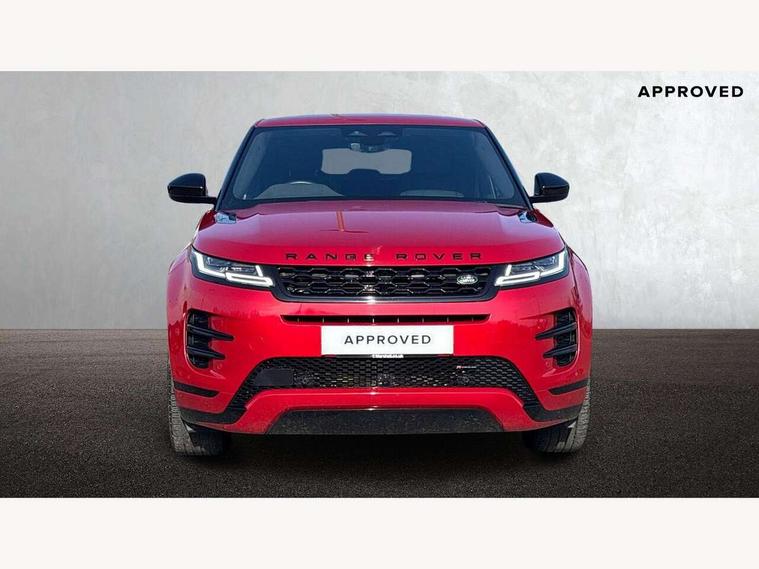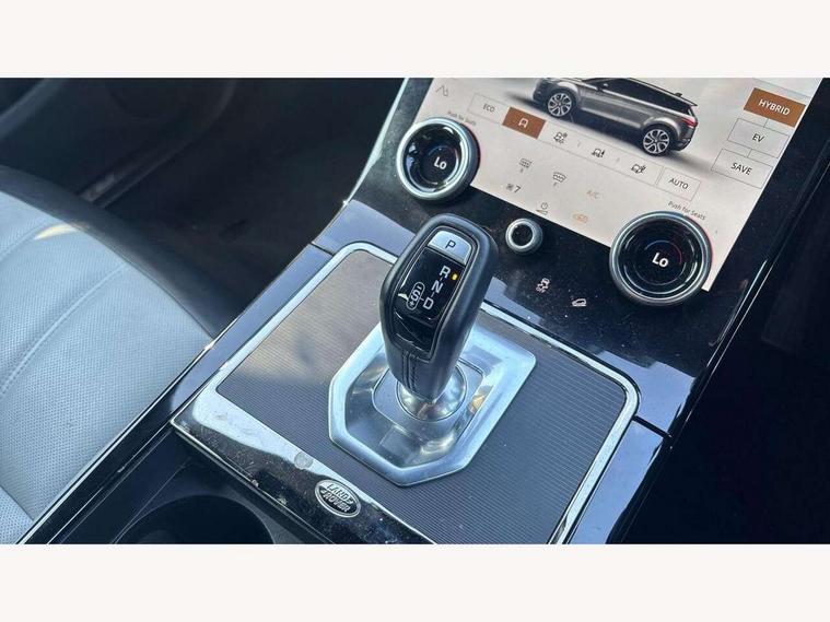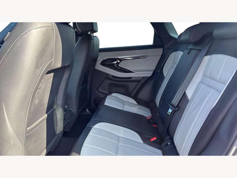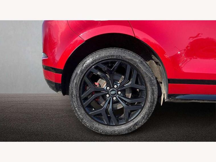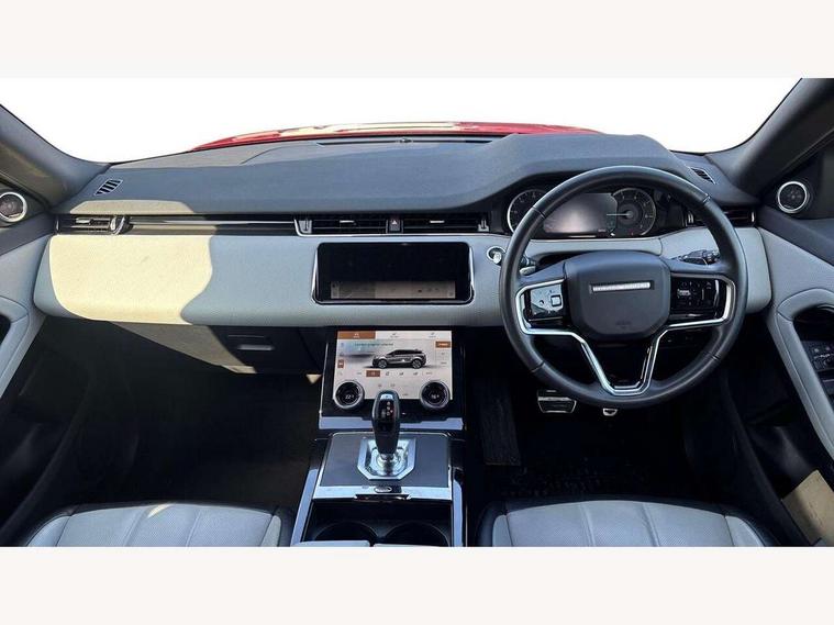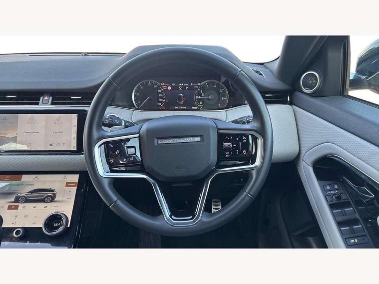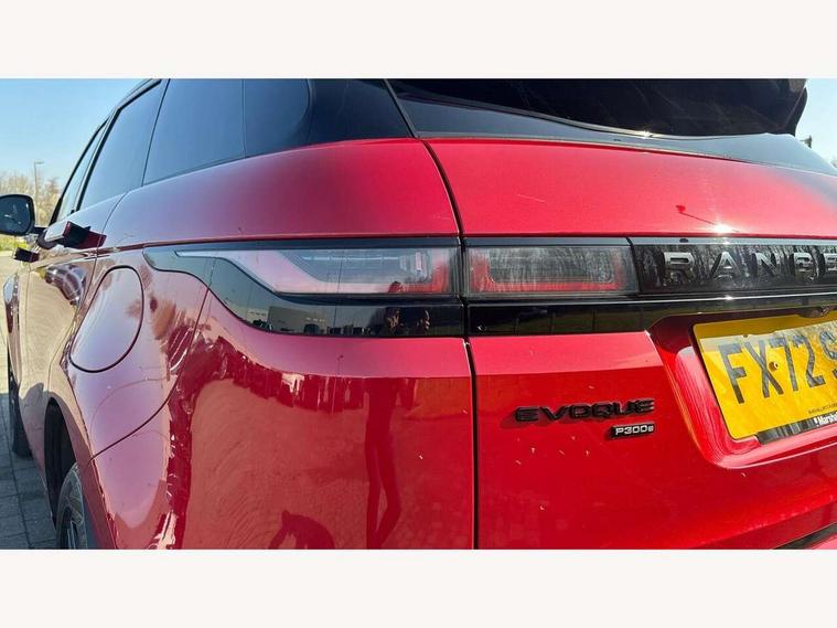 Adaptive cruise control, Android Auto, Apple car play, Bluetooth connectivity, Brake pad wear indicator warning light, Driver condition monitor, eCall emergency system, Electronic power assisted steering (EPAS), Front and rear parking aid, InControl remote, Land Rover InControl apps, Lane keep assist, Pivi pro connected includes upgraded infotainment, connected navigation pro, Nuance speech licence, Push button starter, Traffic sign recognition with adaptive speed limiter, Voice control system, 7 kW onboard charger, All terrain progress control, Electric rear axle drive, Home charging cable, Large fuel tank, Passive suspension, Public charging cable, Terrain Response 2 Auto, Digital Audio Broadcast radio-DAB, Steering wheel mounted controls, Auto headlights, Daytime running lights, Electric windows with one touch open/close and anti trap, Evoque and R-Dynamic badge, Flush deployable exterior door handles, Heated rear window with timer, Heated washer jets, Heated windscreen, P300e badge, Power fold, auto-dimming, heated door mirrors with approach lights and auto dimming driver side, Privacy glass, Rain sensing windscreen wipers, Rear fog lights, Rear side wing doors, Rear wiper, Tailgate spoiler, Third brake light, 40:20:40 split folding rear seats with centre headrest and armrest, Ambient interior lighting, Bright metal pedals, Heated steering wheel, Isofix system on outer rear seats, Overhead lighting console, Overhead stowage for sunglasses, Passive front head restraints, Rear air vents, Rear centre headrest, Rear head restraints, Satin chrome gearshift paddles, Single passenger seat, Sunvisors with illuminated vanity mirrors, Twin sliding front centre armrest, 3 rear 3 point seatbelts, Anti-lock braking system (ABS), Customer configurable autolock, DSC - Dynamic Stability Control, Electronic brake force distribution, Electronic parking brake, Electronic traction control, Emergency braking, Front and rear seatbelt reminder, Hill descent control, Hill launch assist, Low traction launch, Power operated child locks, Roll stability control, Six airbags - Driver and passenger airbags/driver knee airbag/front side airbag and curtain airbags, Torque vectoring brake, Tyre pressure monitoring system, Alarm, Immobiliser, Intrusion sensor, Locking wheel nuts,