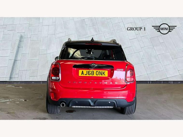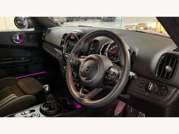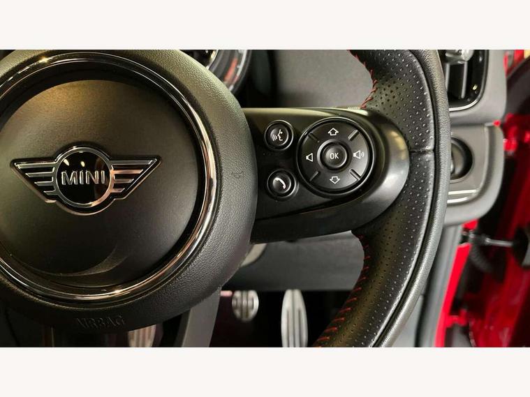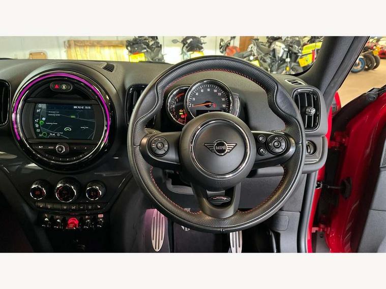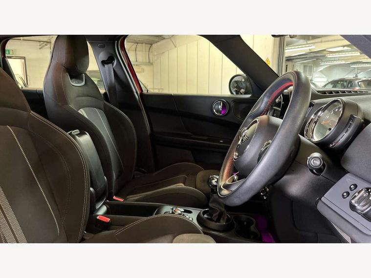 Active Guard incl speed limiting and lane departure functions with auto steering, and front collision warning with brake intervention, Automatic start/stop function with brake energy recuperation, Electro-mechanical speed dependant steering assistance, Instrument cluster, Mini E-call, MINI TeleServices, On board computer, Rear parking distance control, Double Vanos system, Fully variable valve control, High precision injection, Performance Control, FM tuner and DAB digital radio, Body colour fuel filler cap, Day time driving lights, Door sill strips, Dynamic brake lights, Electric windows, Heated rear window, Heated windscreen washer jets, John Cooper Works - aerodynamic kit (front and rear apron, spoiler), front and rear sport bumpers and part-painted side sills with door sill finishers, John Cooper Works Logo, John Cooper Works rear spoiler, Left exhaust tailpipe with chrome finisher, Model logo, Model logo on Tailgate, Radiator grille, Rain sensor with auto headlights, Rear fog lights, Rear window wiper, Side scuttle panel with integrated indicator, Split rear doors, Sun/heat protection glass, White indicator lenses, 12V Accessory socket in centre console, 360L luggage compartment capacity, 4 lashing eyes in luggage compartment, 40:20:40 split folding rear seats, Anthracite headlining with grab handles and clothes hooks, Chrome interior highlights, Colour line - Carbon black, Cupholders, English handbook, Glove compartment, Height and length steering column adjustment, Isofix rear child seat preparation, John Cooper Works perforated leather steering wheel with contrast stitching in chilli red and John Cooper Works logo, Leather gearshift lever and handbrake gaiters, LED reading lights, vanity mirror lights, front foot well light and spotlight on front seats, Manual air conditioning, Mechanical seat adjustment, driver seat height adjust, forward/back and front seats backrest, Multifunction steering wheel, Passenger seat height adjuster, Storage compartments in doors, Sunvisors with vanity mirrors, Excitement pack - Countryman, Navigation pack - Countryman, 2 tone horn, 3 point seatbelts on all seats, 6 Airbags - front, side, head and seat belt tensioners, Anti-lock braking system (ABS), DSC - Dynamic Stability Control, Electronic handbrake, Front and rear disc brakes, Hill start assist, Tyre pressure monitoring system, Alarm system with tilt sensor, monitoring doors, bonnet interior and tailgate, Auto drive away locking, Deadlocking function, Electronic vehicle immobiliser, Locking wheel bolts, Start/stop toggle with keyless go, Tool kit,