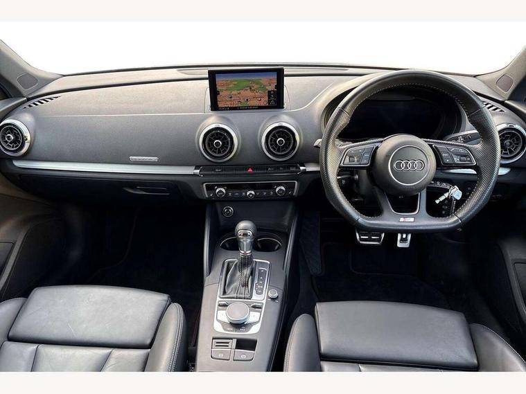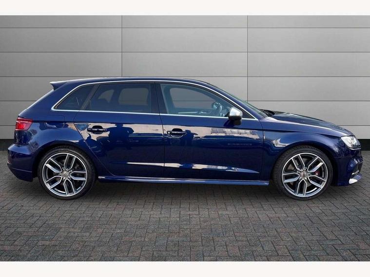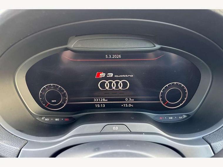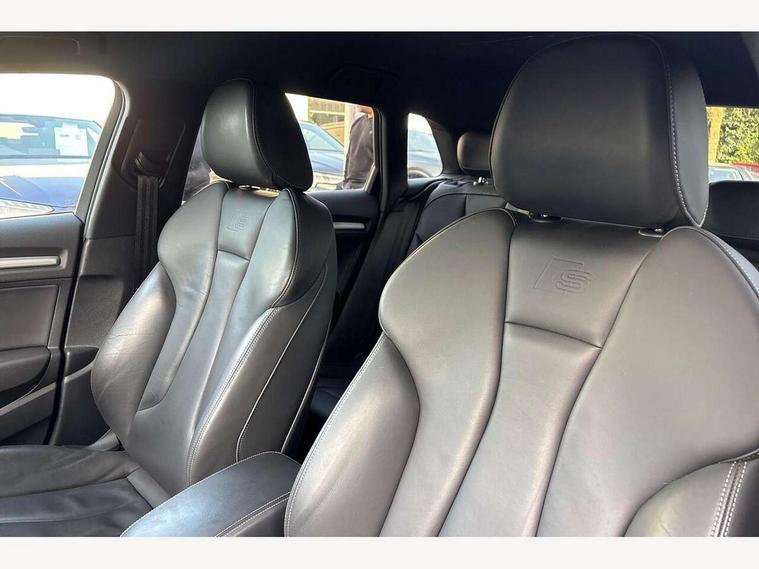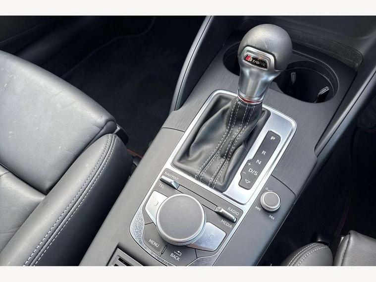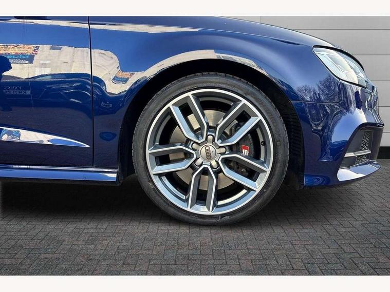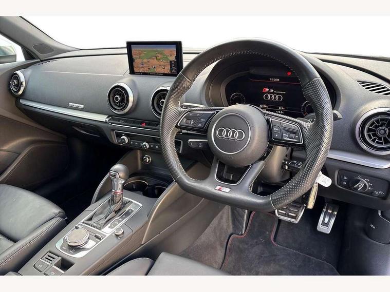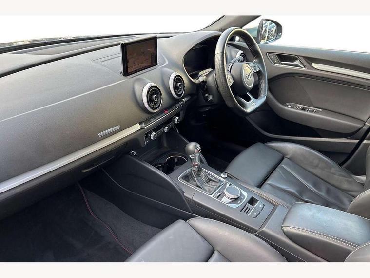 Audi connect, Audi drive select, Audi smartphone interface, Automatic start/stop system, Colour driver's information system display, Instrument dials with S3 logo, Mobile telephone preparation - bluetooth interface, Progressive power assisted steering, SD card based satellite navigation system, Service interval indicator, Speed limit display, Voice control system, Voice recognition for navigation system, S sports suspension, 2 USB interfaces and Aux-In jack, Audi music interface, CD player, DAB Digital radio, MMI radio plus with 7" colour MMI screen and MMI controller, Aluminium door mirror housings, Aluminium window trim, Audi Beam uses LEDs to project the Audi Sport logo, Auto dimming rear view mirror with light and rain sensors, Electric front windows, Electric rear windows, Electrically adjustable and heated door mirrors with integrated LED side indicators, Headlight washers, Heated windscreen washer jets, LED daytime running lights, Matt black radiator grille, Rear wiper, S body styling with front bumper 'S' specific air intake grille, rear diffuser with platinum grey insert, roof spoiler, Sport specific side air inlet grille and diffuser insert, Twin oval chrome trimmed exhaust tailpipes, 3 adjustable rear headrests, 4 lashing points to secure luggage, Adjustable front centre armrest, Black cloth headlining, Dual zone electronic climate control, Front and rear interior lights with delay, Front/rear floor mats, Glovebox light, Height and reach adjustable steering wheel, Illuminated door sill trims with S logo, Isofix child seat preparation for front passenger/outer rear seats inc passenger airbag deactivation, Stainless steel pedals, Storage compartments in doors side trims, centre console and under front drivers seat, LED interior light pack - A3/RS3, Non smoking pack - A3, Storage and luggage pack - A3/RS3, 3 point seatbelts on all seats, ABS/EBD, Active bonnet, Active front headrests, Airbags - front driver/passenger, front & rear side, curtain, drivers knee, ASR, EDL, Electromechanical parking brake, ESC - Electronic Stability Control + traction control, Front passenger airbag deactivation, Hill hold assist, Manual rear child locks, Multi-Collision braking, Seatbelt warning, Tyre pressure warning, Warning triangle and first aid kit, Anti theft alarm, Anti-theft wheel bolts, Remote control central locking, Thatcham category 1 alarm + immobiliser, Aluminium air vent surrounds, Aluminium trim elements, Matt brushed aluminium inlays, Tool kit, Tyre repair kit,