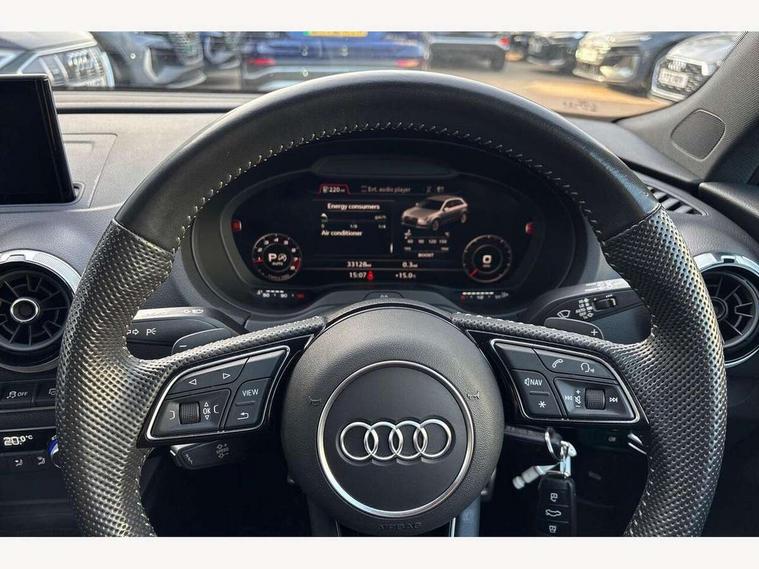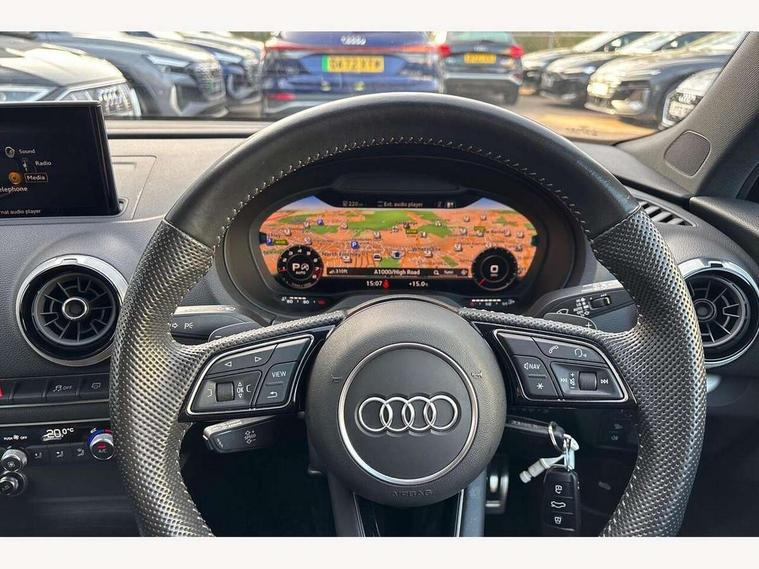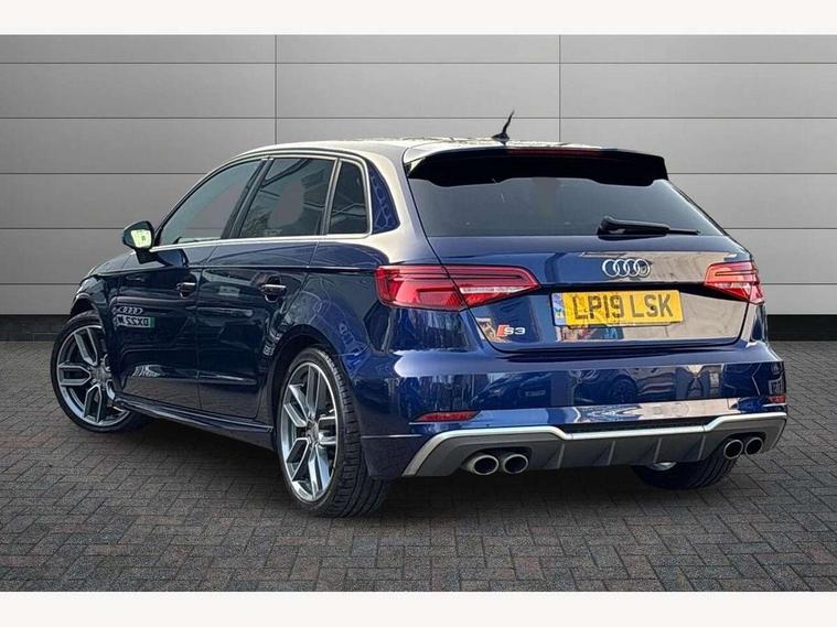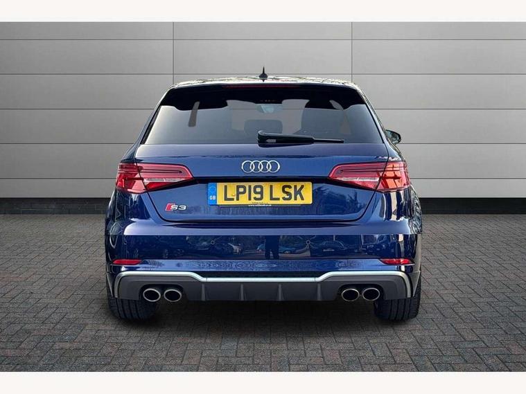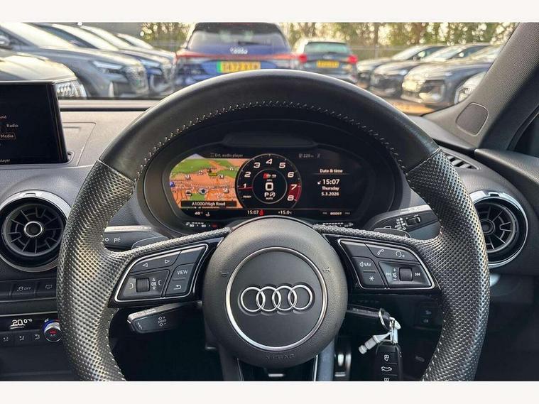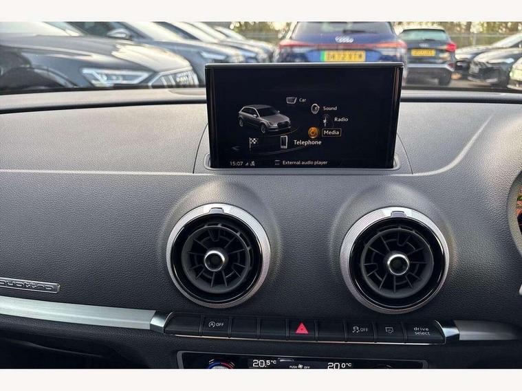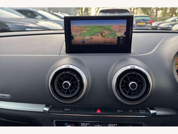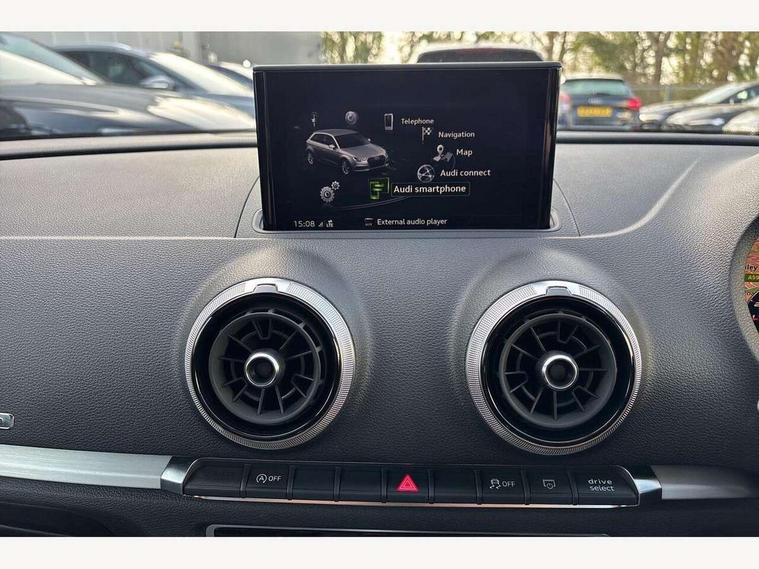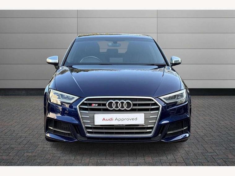 Audi connect, Audi drive select, Audi smartphone interface, Automatic start/stop system, Colour driver's information system display, Instrument dials with S3 logo, Mobile telephone preparation - bluetooth interface, Progressive power assisted steering, SD card based satellite navigation system, Service interval indicator, Speed limit display, Voice control system, Voice recognition for navigation system, S sports suspension, 2 USB interfaces and Aux-In jack, Audi music interface, CD player, DAB Digital radio, MMI radio plus with 7" colour MMI screen and MMI controller, Aluminium door mirror housings, Aluminium window trim, Audi Beam uses LEDs to project the Audi Sport logo, Auto dimming rear view mirror with light and rain sensors, Electric front windows, Electric rear windows, Electrically adjustable and heated door mirrors with integrated LED side indicators, Headlight washers, Heated windscreen washer jets, LED daytime running lights, Matt black radiator grille, Rear wiper, S body styling with front bumper 'S' specific air intake grille, rear diffuser with platinum grey insert, roof spoiler, Sport specific side air inlet grille and diffuser insert, Twin oval chrome trimmed exhaust tailpipes, 3 adjustable rear headrests, 4 lashing points to secure luggage, Adjustable front centre armrest, Black cloth headlining, Dual zone electronic climate control, Front and rear interior lights with delay, Front/rear floor mats, Glovebox light, Height and reach adjustable steering wheel, Illuminated door sill trims with S logo, Isofix child seat preparation for front passenger/outer rear seats inc passenger airbag deactivation, Stainless steel pedals, Storage compartments in doors side trims, centre console and under front drivers seat, LED interior light pack - A3/RS3, Non smoking pack - A3, Storage and luggage pack - A3/RS3, 3 point seatbelts on all seats, ABS/EBD, Active bonnet, Active front headrests, Airbags - front driver/passenger, front & rear side, curtain, drivers knee, ASR, EDL, Electromechanical parking brake, ESC - Electronic Stability Control + traction control, Front passenger airbag deactivation, Hill hold assist, Manual rear child locks, Multi-Collision braking, Seatbelt warning, Tyre pressure warning, Warning triangle and first aid kit, Anti theft alarm, Anti-theft wheel bolts, Remote control central locking, Thatcham category 1 alarm + immobiliser, Aluminium air vent surrounds, Aluminium trim elements, Matt brushed aluminium inlays, Tool kit, Tyre repair kit,
