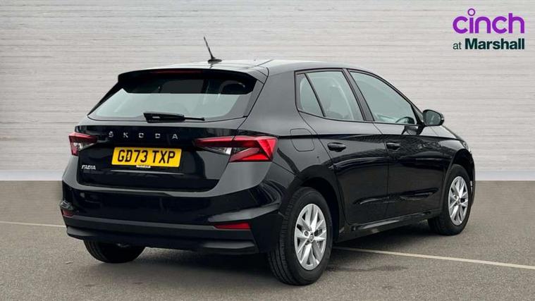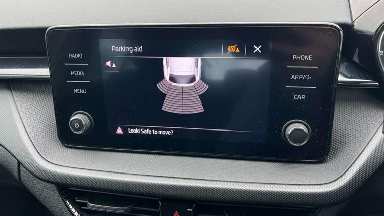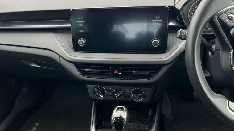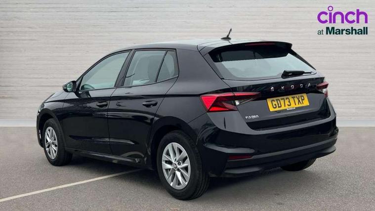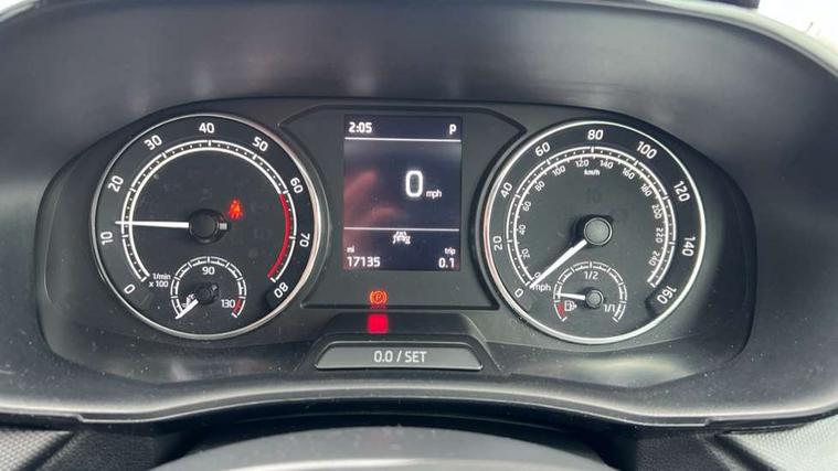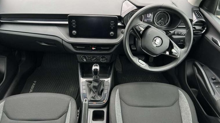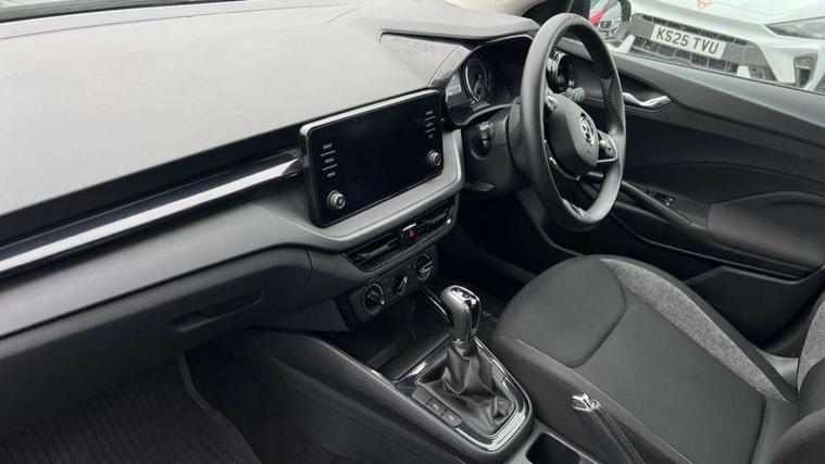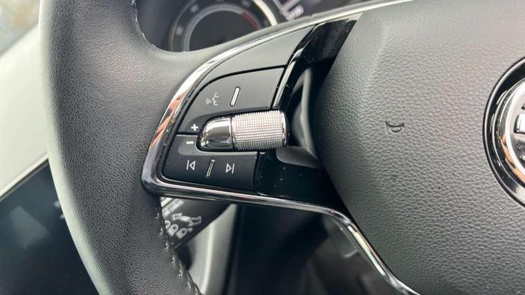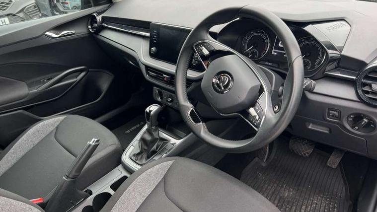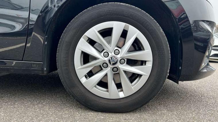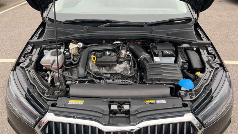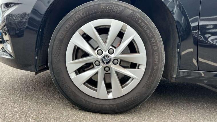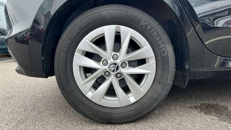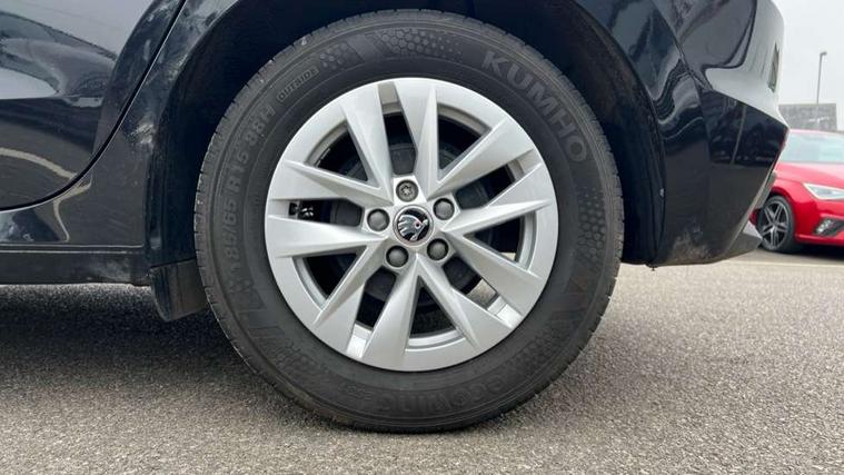 Bluetooth connection, Driver alert system - DAS, Electromechanical power steering, Exterior temperature gauge, Lane assist including road edge detection, Multifunction trip computer in black and white, Rear parking sensors, Service interval indicator, Speed limiter, 2x USB-C in the front (for data transmission and charging), 4 speakers in front, Auxiliary socket for external MP3 player, DAB digital radio reception, Radio Swing with 6.5" colour display, Basic LED Headlights, Basic rear lights, Body colour door mirrors, Body coloured bumpers, Dimming rear view mirror with black frame, Door mirror integrated indicators, Electrically adjustable and heated door mirrors, Electrically adjustable front windows with function auto up/down, Front fog lights, Front window wiper intermittent control, Headlight range control - Automatic, Ice scraper in fuel cap, LED daytime running lights with coming and leaving home feature, Mechanical adjustable rear windows, Rain sensor, Rear LED fog light, Rear side wing doors, Rear window wiper with washing nozzles, Roof mounted spoiler, SKODA tailgate lettering in chrome, Third brake light, 2 reading lights in front and 2 reading lights in rear, 2 spoke leather multifunction steering wheel, 3 rear headrests, Backrest split and folding, Central console with fixed cup holder and storage box, Chrome handbrake release button, Fabric upholstery, Gearshift knob/handle in leather, Grain satin black interior door handles, Hand brake lever handle in leather, Height adjustable front headrests, Height adjustable front seats, Height adjustable steering wheel, ISOFIX and TopTether anchorage points to the outer rear seats, ISOFIX and TopTether on the front passenger seat, Luggage compartment lighting, Manual air conditioning, Manually adjustable lumbar support in front seats, Pollen filter, Rear seat bench unsplit, Single front passenger seat, Storm grey headlining, Sun visors with mirror and airbag label on passenger side, Ticket holder, 3-point height adjustable front seats belts with pretensioner and force limiter, Automatic warning lights in case of crash, Driver and passengers airbag with switch off function, e-Call+, ESC including ABS, MSR, ASR, EDS, HBA and XDS, Front and rear seat belt warning, FRONT ASSIST (AEB City and AEB Inter Urban), Front side airbags, Head airbags, Hill hold assist, One tone horn, Pedestrian protection, Three rear 3-points safety seat belts with pretensioner and force limiter including stop function for outer rear seat belts, Tyre pressure monitoring system, Anti-theft alarm system including immobiliser, interior monitoring, backup horn, and towing protection, Central locking with radio remote control, interior controls, SAFE function and 2 foldable keys, Black painted air vents, Glossy black decorative trim, Grain satin black central console cover, Grain satin black lower decorative trim, Satin black door and side trim panel in front, Anti-theft wheel bolts protection, Super-low rolling resistance tyres,